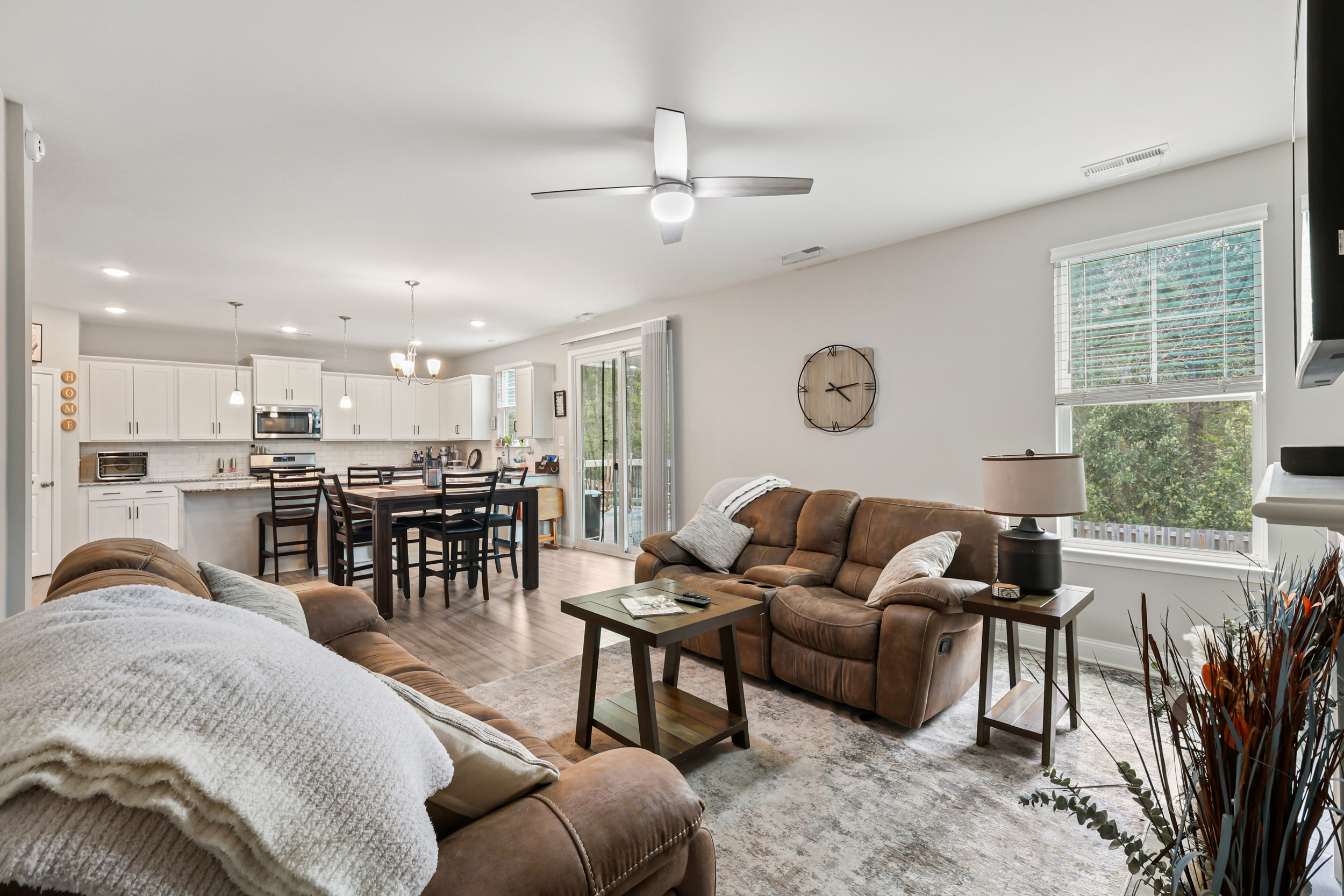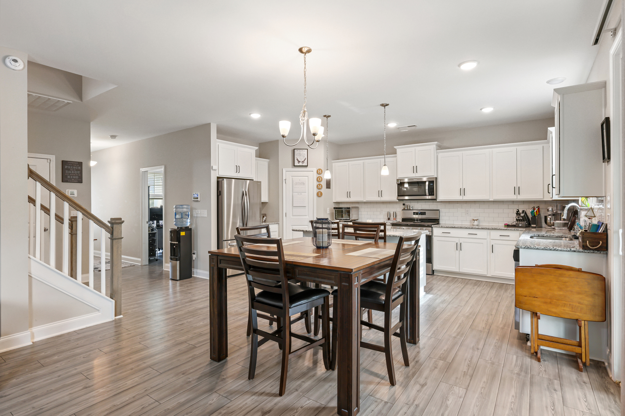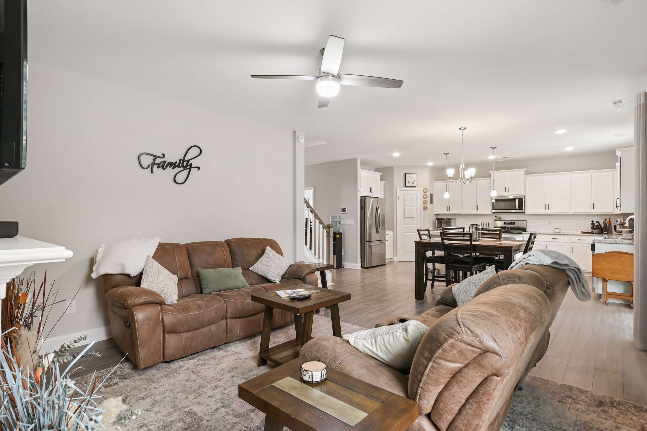 The main living area follows an open-concept layout, creating a natural flow between spaces while still offering definition. The living room centers around a gas log fireplace, forming a comfortable focal point for everyday living or entertaining. The kitchen is designed with both style and function in mind, featuring white Shaker-style cabinets, granite countertops, a subway tile backsplash, stainless steel appliances, a central island, and a corner pantry that keeps everything within easy reach.