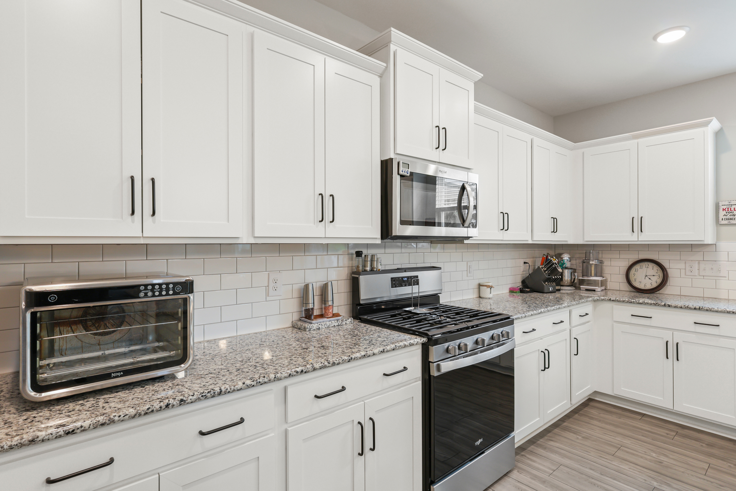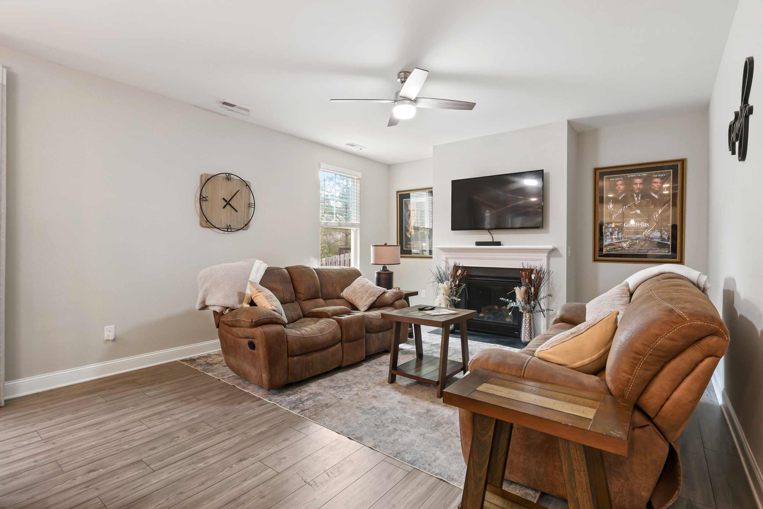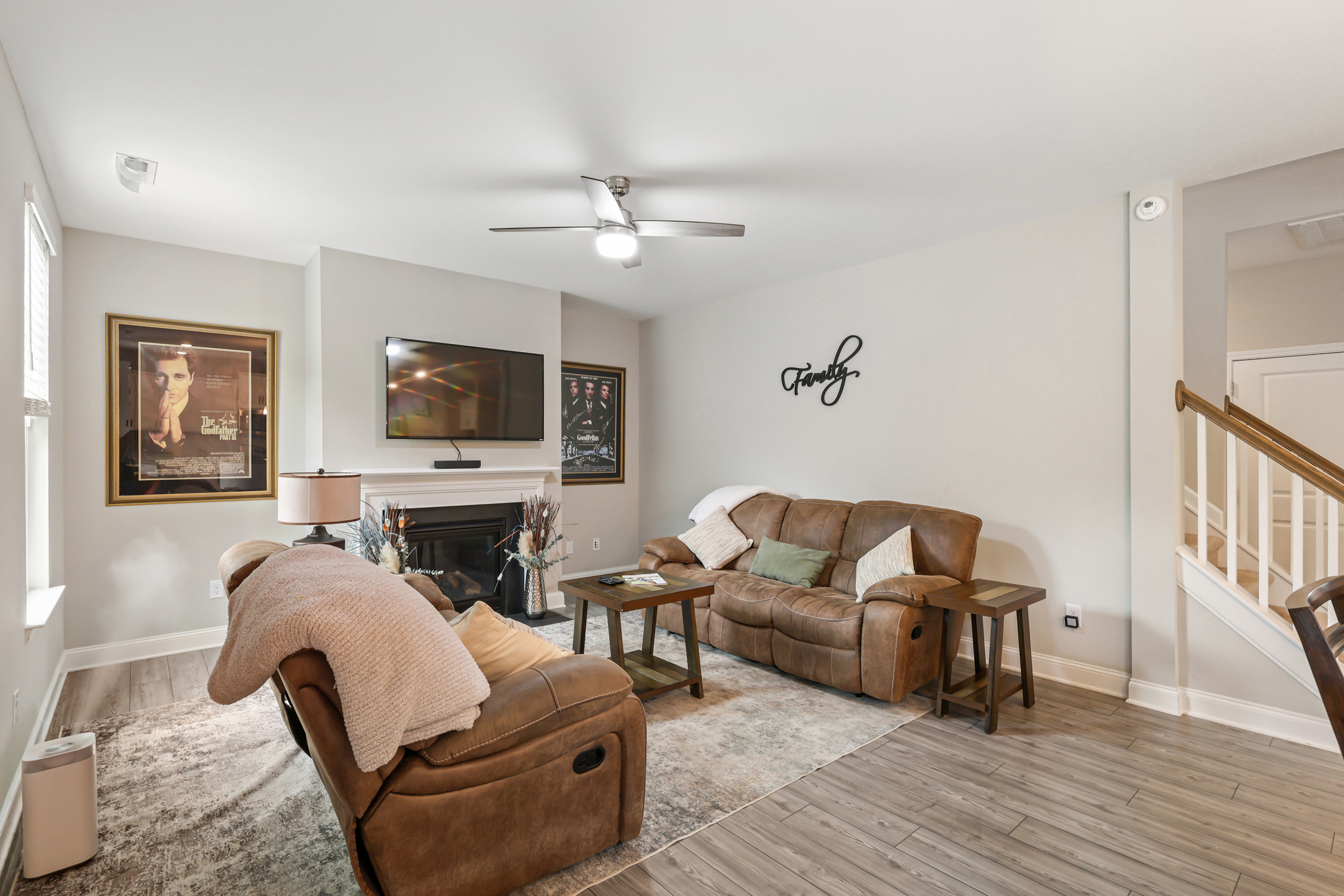 The main living area follows an open-concept layout, creating a natural flow between spaces while still offering definition. The living room centers around a gas log fireplace, forming a comfortable focal point for everyday living or entertaining. The kitchen is designed with both style and function in mind, featuring white Shaker-style cabinets, granite countertops, a subway tile backsplash, stainless steel appliances, a central island, and a corner pantry that keeps everything within easy reach.