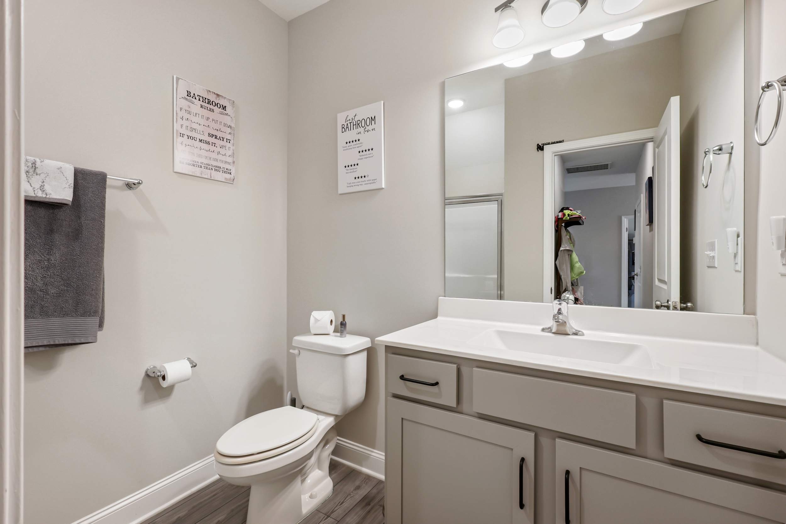 Upstairs, the primary suite offers a spacious retreat with a large walk-in closet, double-sink vanity, walk-in shower, and a separate water closet. Two additional guest bedrooms and a full bathroom are located on the second floor. One of these bedrooms includes a walk-in closet. A conveniently placed laundry room simplifies daily routines, while the bonus room provides flexibility for a home gym, media room, or creative space.
