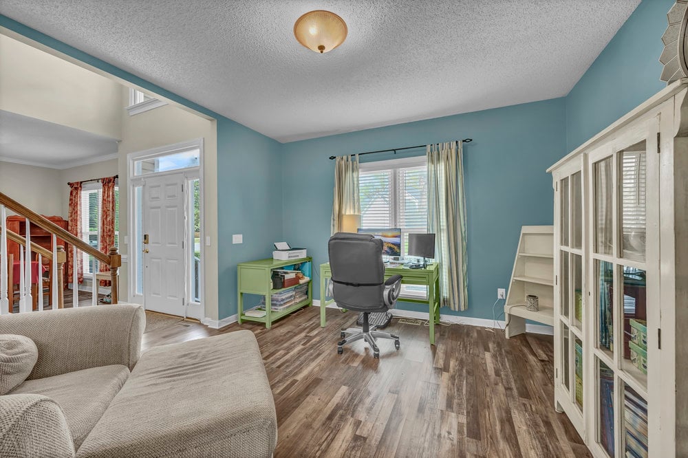 Step inside and the tone is set immediately: the front door opens into a two-story foyer with an elegant staircase rising to the second floor. Luxury vinyl plank flooring begins here and continues throughout the main living areas on the lower level—durable underfoot, easy to maintain, and a cohesive foundation for a range of design styles. To the left, a flexible front room offers a great spot for a den, reading lounge, or dedicated office with street-facing windows that bring in morning light. To the right, a formal dining room framed with chair rail molding is ready for weeknight meals and holiday spreads alike; it’s close to the kitchen for effortless service yet defined enough to feel special when the table is set.