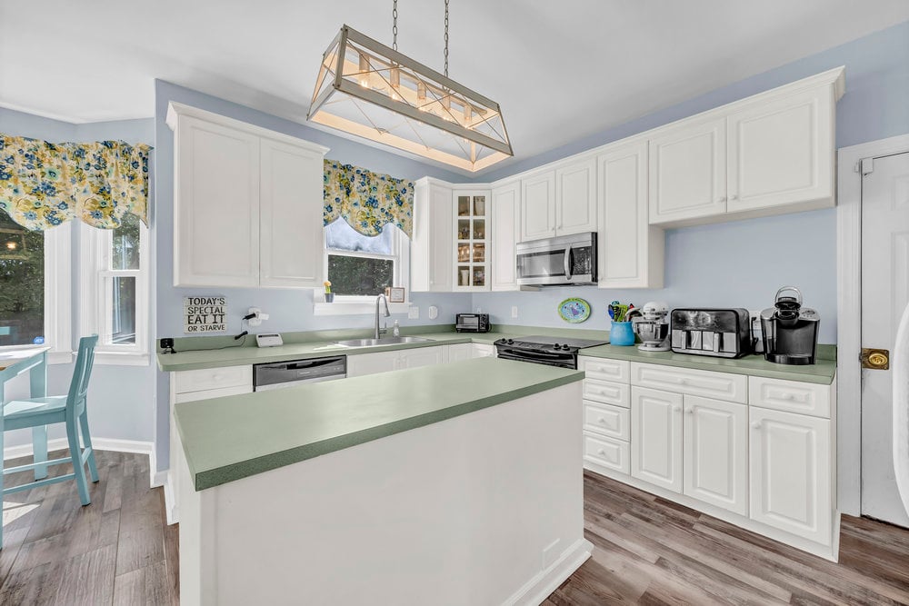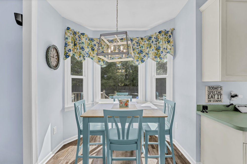 Function shines in the heart of the home. Just beyond the dining room, you’ll find a handy half bath—perfect for guests—followed by a spacious kitchen appointed for real life. A walk-in pantry keeps countertop clutter to a minimum, a center island provides extra prep space and casual seating, and the breakfast nook is where coffee, laptops, and quick bites all seem to land. Because this home embraces a transitional layout, the nook opens partially to the living room; the spaces connect visually and socially, yet the living room retains just enough definition for thoughtful furniture placement. You can orient a sectional toward the wood-burning fireplace with a television mounted above and still carve out a conversation corner without blocking the flow. It’s the kind of arrangement that makes entertaining feel relaxed and everyday living pleasantly organized.