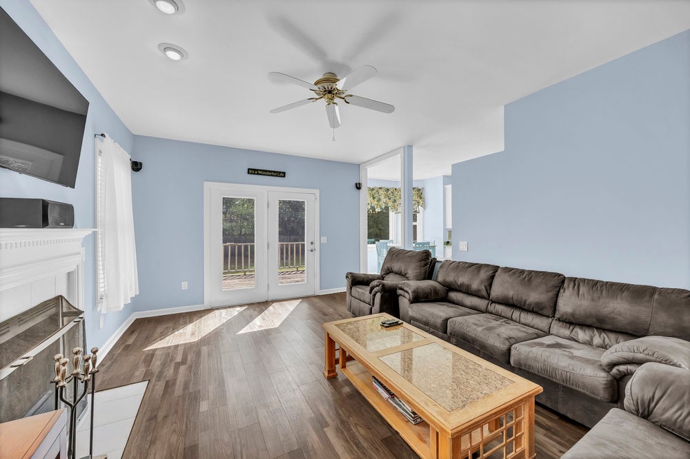 Glass doors in the living room extend the experience outdoors to a rear deck overlooking a large, fenced back yard. The setting invites everything from morning yoga and container gardening to evening cookouts under a string of café lights. With parkland as your neighbor out back, the view is leafy and the vibe is instantly restorative after a day around town. On weekends, you can wander around the corner to the paved loop for a quick walk, push a stroller to the playground, or claim a picnic shelter for a birthday celebration—no car required.