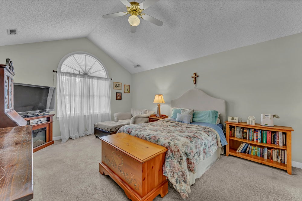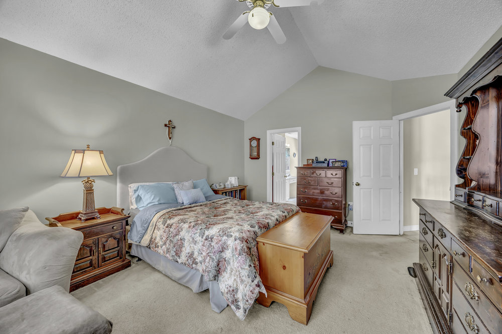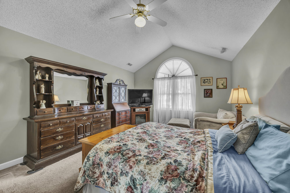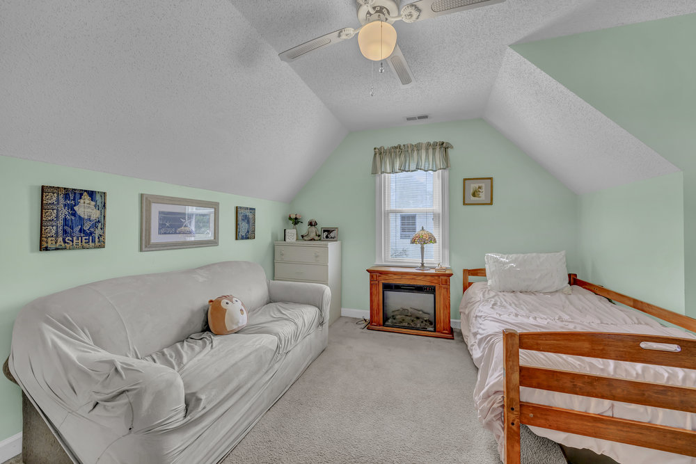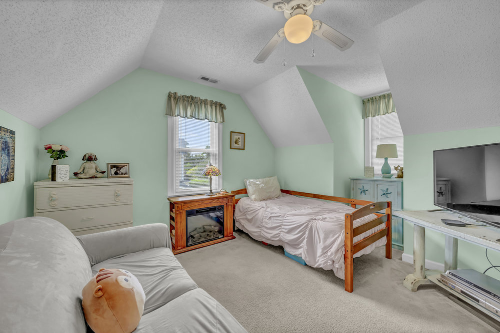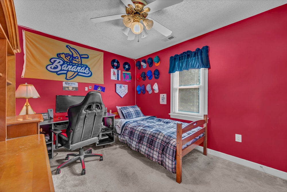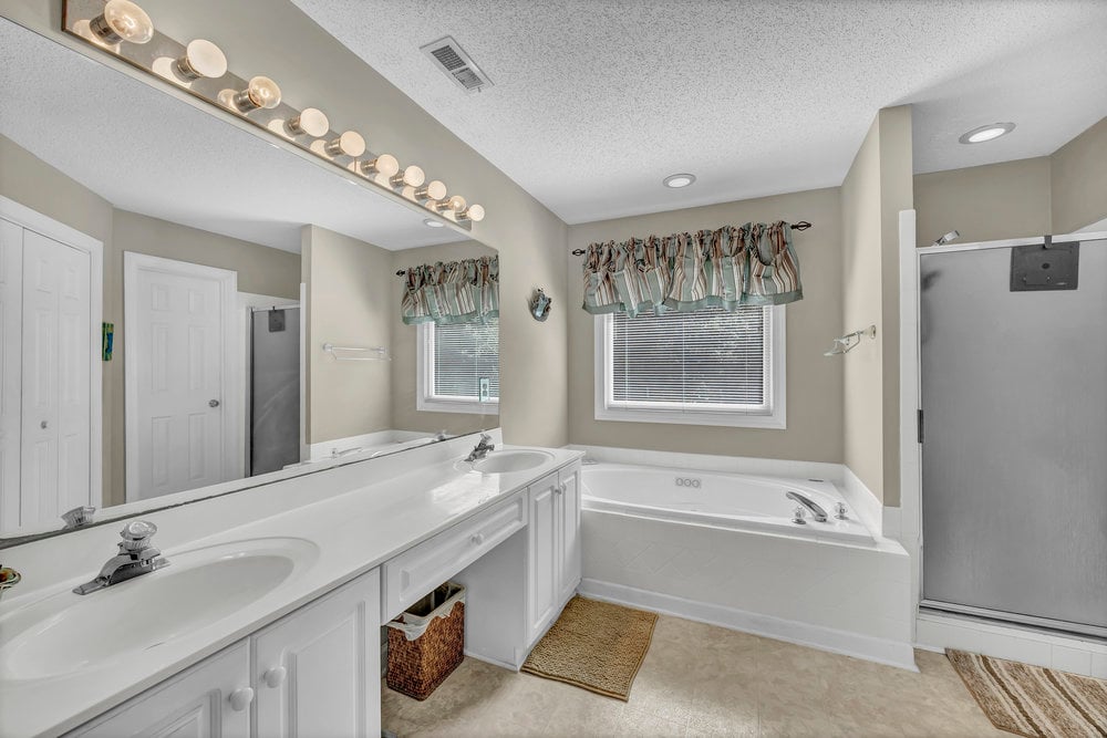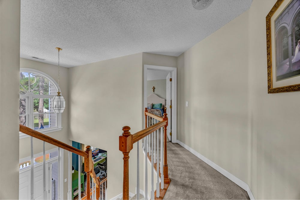Upstairs, the home’s private spaces deliver comfort and practicality. All four bedrooms and both full bathrooms are on the second floor, eliminating the daily up-and-down shuffle when it’s time to get ready. The primary suite feels airy thanks to a cathedral ceiling and includes a well-appointed bath with a double-sink vanity, water closet for privacy, a separate soaking tub for unwinding, and a walk-in shower for busy mornings. The walk-in closet gives you the storage you want without annexing extra furniture into the bedroom. Three additional bedrooms line the hallway, each with its own personality and potential—guest retreat, hobby space, or a second office with a view of the treetops. The full hall bath serves these bedrooms efficiently. Thoughtful detail: the laundry closet is also on the second floor, which means no lugging baskets of clothes up and down the stairs. It’s a simple feature that pays dividends every single week.