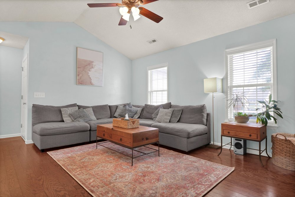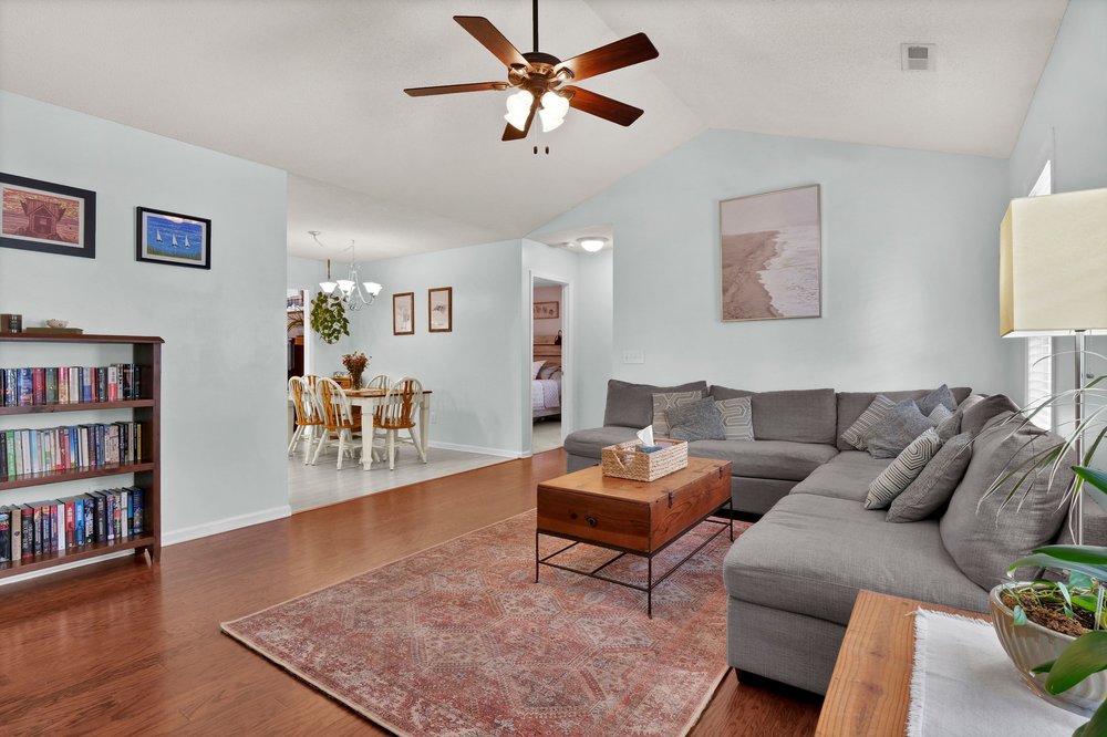 Just inside the entrance, a coat closet offers quick access for storing jackets, backpacks, umbrellas, and everything that tends to accumulate around doorways. This simple, practical detail instantly makes the space feel organized, and it helps set the tone for the rest of the property. Right beyond that, the generously sized living room opens up with a dramatic vaulted ceiling that gives the space a spacious, airy feel. Whether you imagine a large sectional and movie-night setup or a more curated arrangement with accent chairs, plants, and art, the room easily adapts to your vision. The vaulted ceiling not only makes the room feel larger but also brings in enhanced natural light, especially during the early afternoon when sunlight tends to fill the space. As the central gathering area, it’s the kind of room where you can relax, entertain, work, or simply enjoy the comfort of a space that feels inviting at all hours.