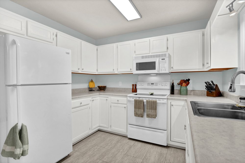 Connected to the living room is the horseshoe kitchen, a layout that’s known for maximizing efficiency and counter space. This shape makes meal prep surprisingly smooth, keeping everything—appliances, counter surfaces, upper cabinets—within easy reach. The kitchen also features a reverse-osmosis filtration system at the sink, which is a thoughtful upgrade for buyers who care about high-quality drinking water without depending on filters or bottled options. The adjacency of the kitchen to the dining area creates a seamless flow, making the space feel open while still maintaining defined zones for cooking, dining, and gathering. The dining area can comfortably accommodate a standard table and chairs, and depending on your style, it could easily serve as a space for dinners, homework time, or weekend brunches with friends.