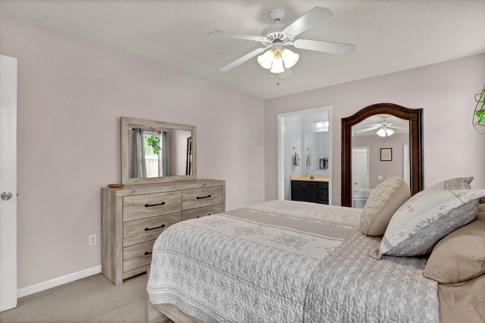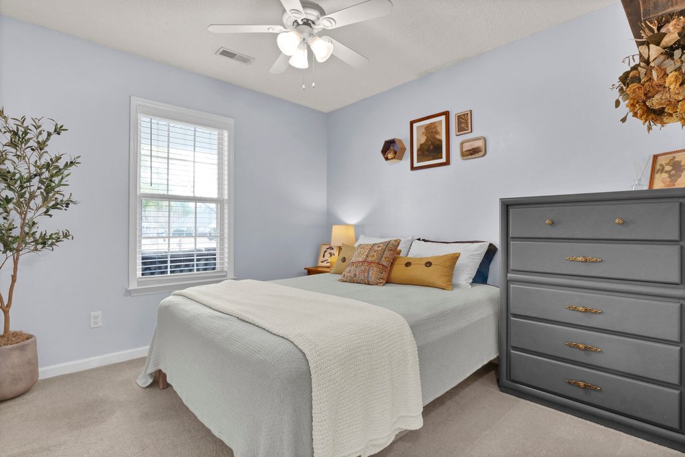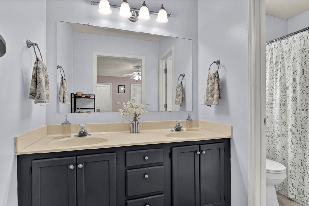 On the other side of the home, the guest bedrooms share a full bathroom that features an oversized vanity, a tub/shower combo, and ceramic tile flooring. The extra counter space at the vanity is an underrated perk, particularly for guests, children, or anyone who appreciates storage and surface area. The ceramic tile flooring is a practical long-term choice that holds up well over time and brings a clean, polished look to the space. Both bedrooms can function flexibly—perfect for overnight guests, a nursery, a media room, or even a second office if your lifestyle calls for it.