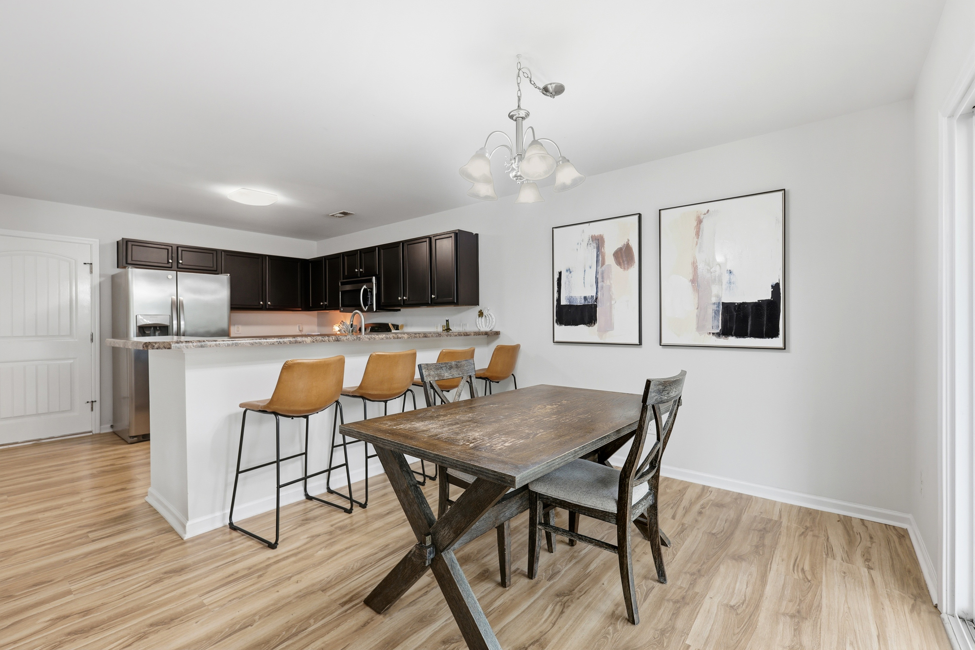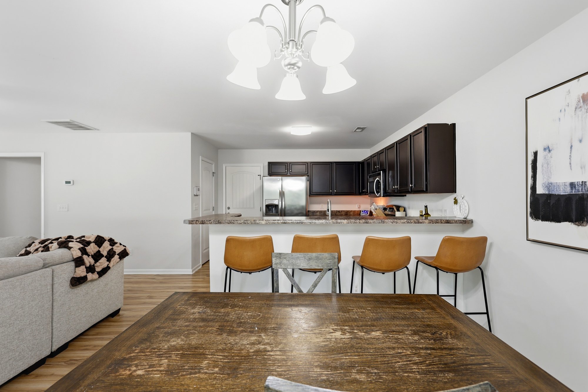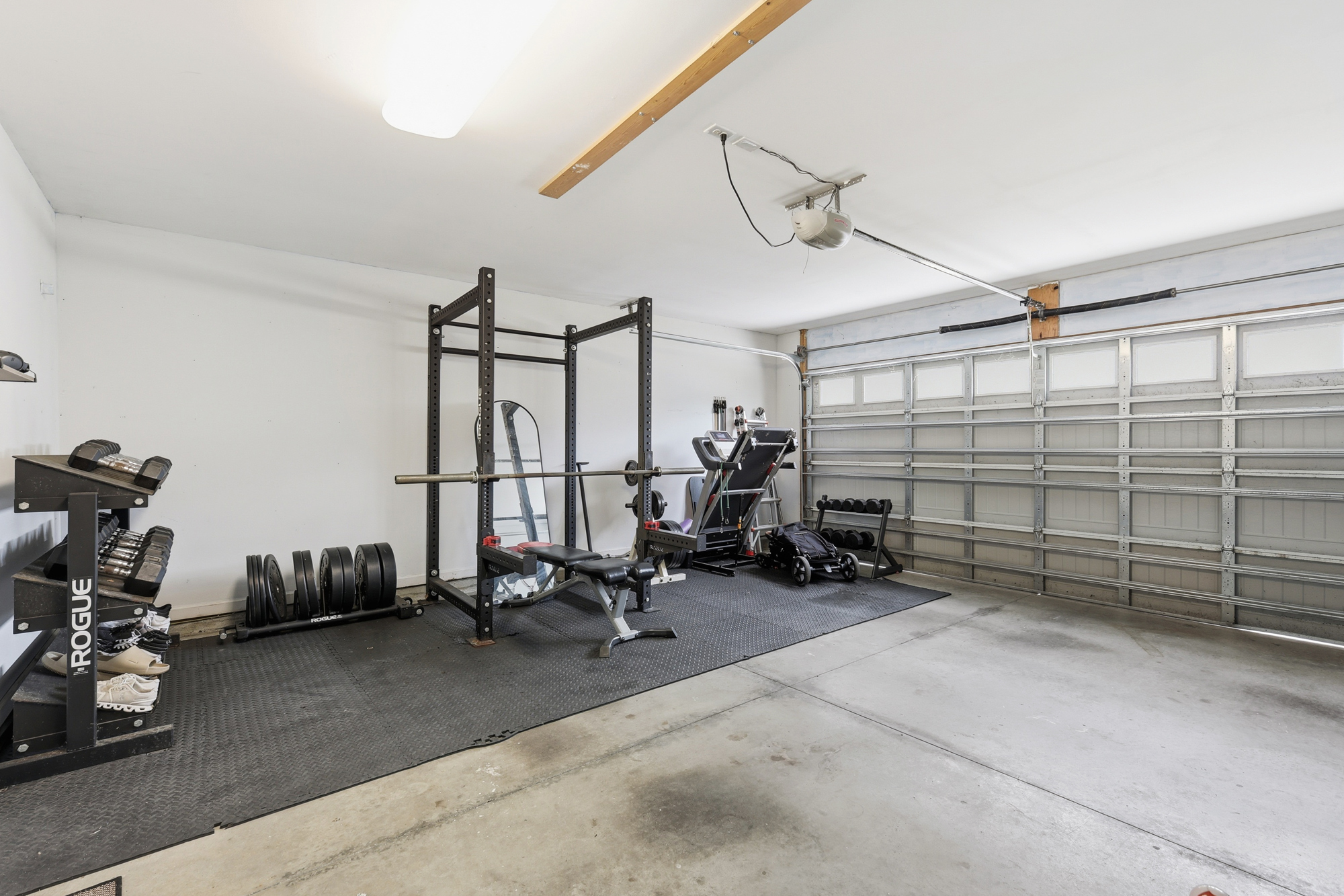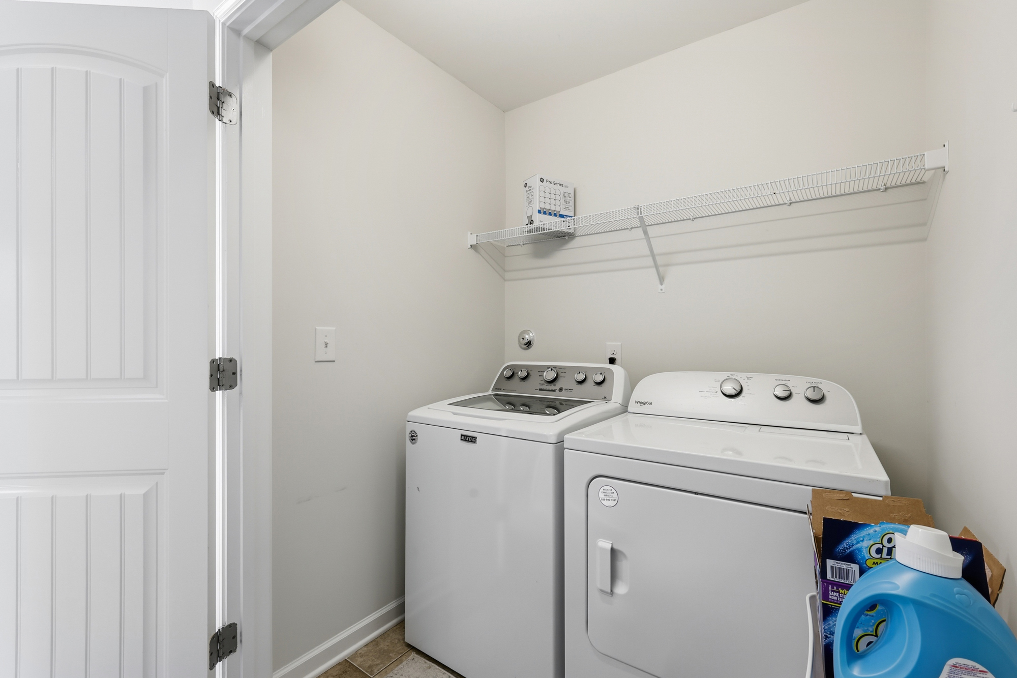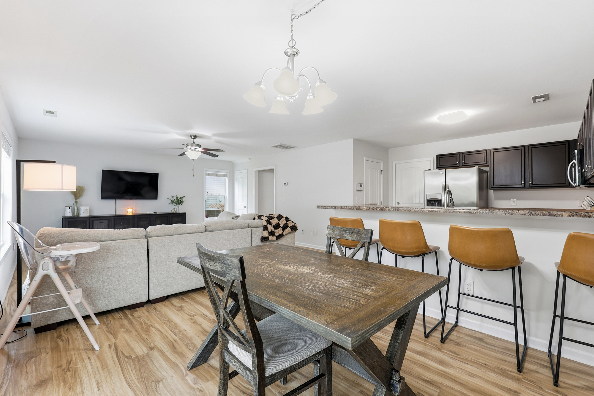 The kitchen features a horseshoe layout that maximizes workspace and functionality. A hop-up counter separates it from the dining area—ideal for serving snacks, catching up over coffee, or helping with homework while dinner is on the stove. A pantry adds extra storage, and there’s direct access to the garage, making it easy to unload groceries without stepping into the weather.