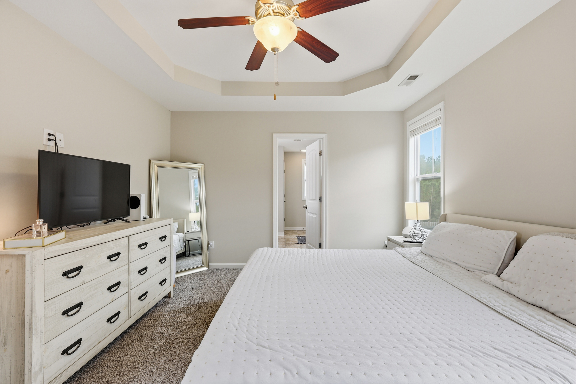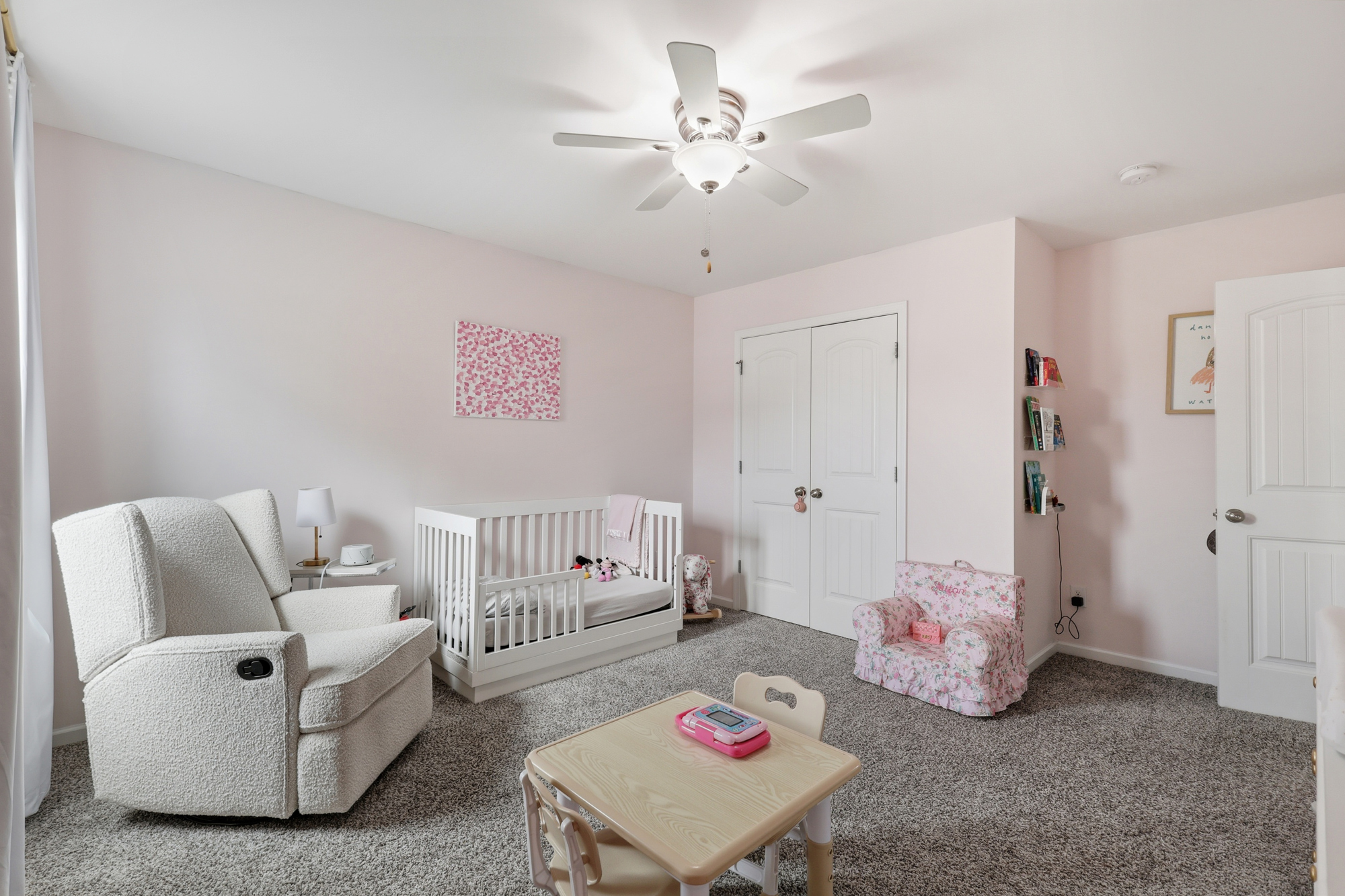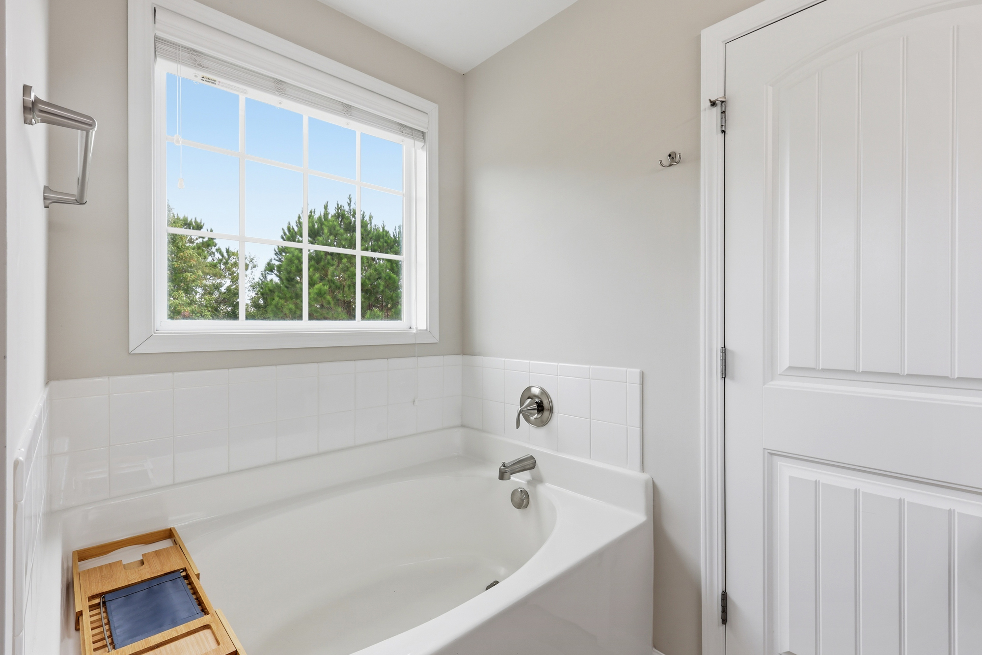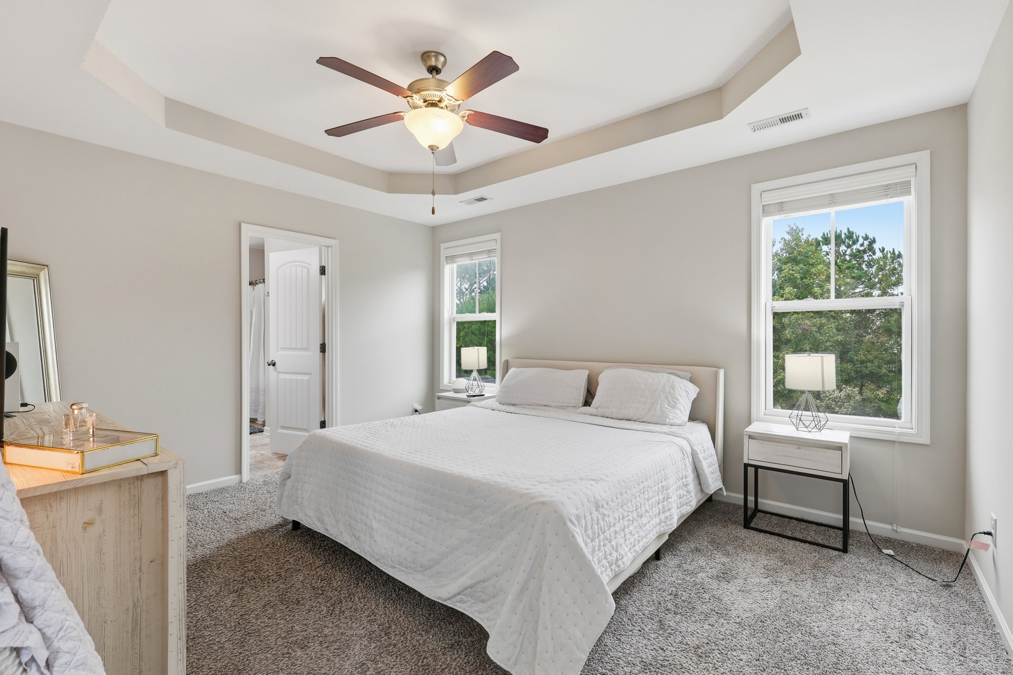Upstairs, you’ll find three bedrooms, two full bathrooms, and a large laundry closet conveniently located near the sleeping areas. Carpeted bedrooms add warmth and comfort, while the bathrooms feature tile flooring for durability and style. The primary suite is spacious and thoughtfully designed, featuring a tray ceiling, a large walk-in closet, and a private bath with a soaking tub, separate shower, and double-sink vanity—a true retreat for relaxation at the end of the day.