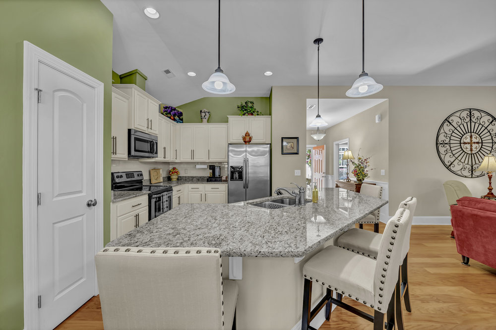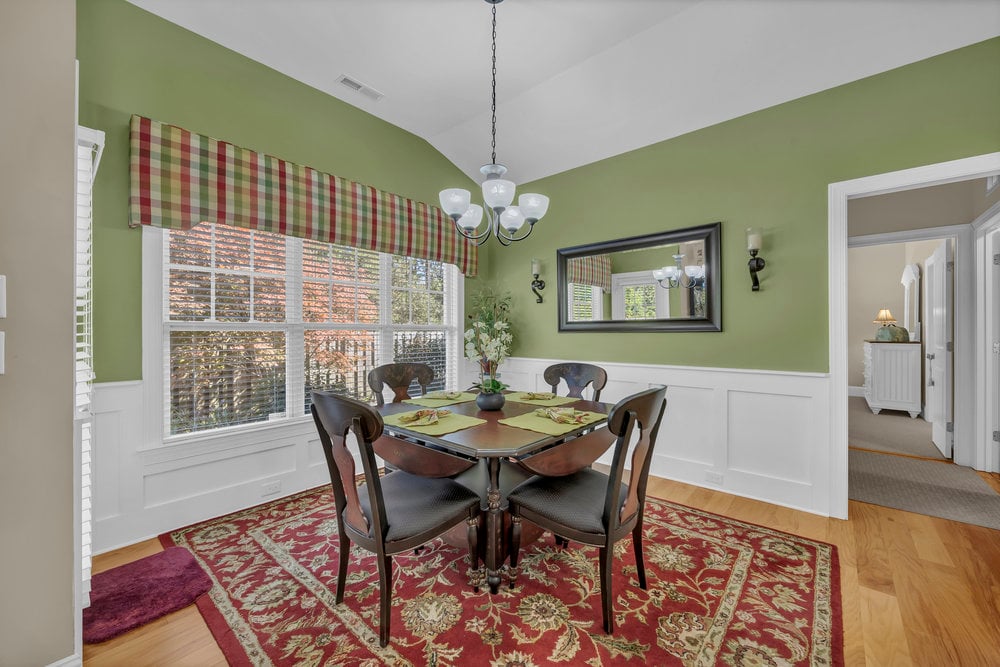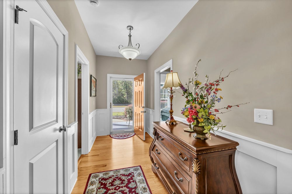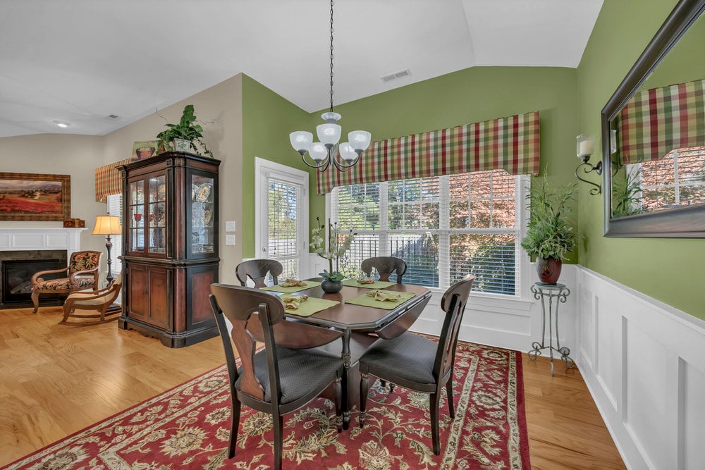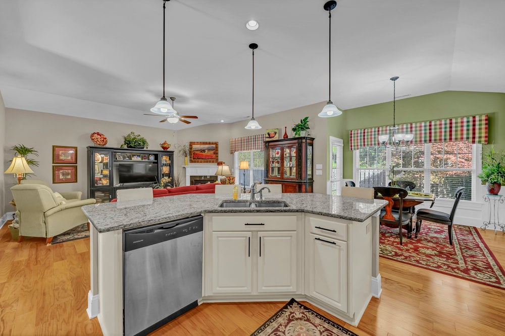 Inside, the open floor plan creates a natural flow between the main living areas, all accented by wood floors. The living room features a corner gas log fireplace that adds warmth and character without overwhelming the space. Just beyond, the kitchen is both functional and polished, with ivory cabinetry, granite countertops, stainless steel appliances, and a large island that comfortably seats four. The dining room and foyer are highlighted by wainscoting, adding a refined, classic touch that elevates the overall feel of the home.