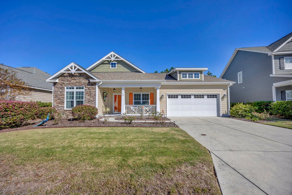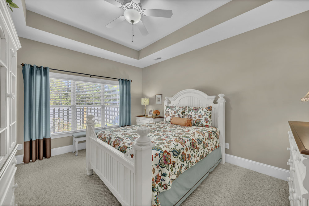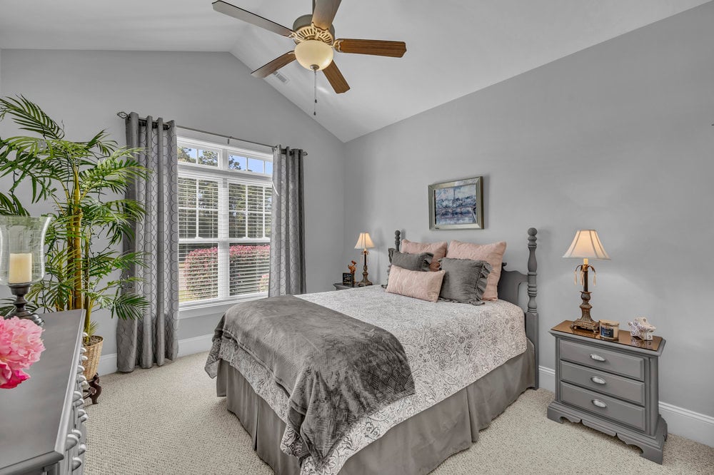 Two guest bedrooms and a second full bathroom are located off the foyer on the opposite side of the home. The front guest bedroom overlooks the yard and features a vaulted ceiling, while the second guest bedroom offers flexibility as a home office or hobby space.