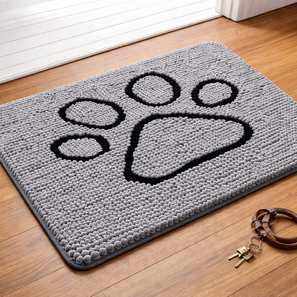 This option offers a soft chenille surface with an approximate one-inch thickness, making it ideal for pulling moisture off paws and shoes. The backing is made from textured rubber for strong grip, which is particularly helpful in busy areas like mudrooms or laundry entrances. The mat is machine washable and designed to dry quickly, so it can be cleaned frequently without wearing down.