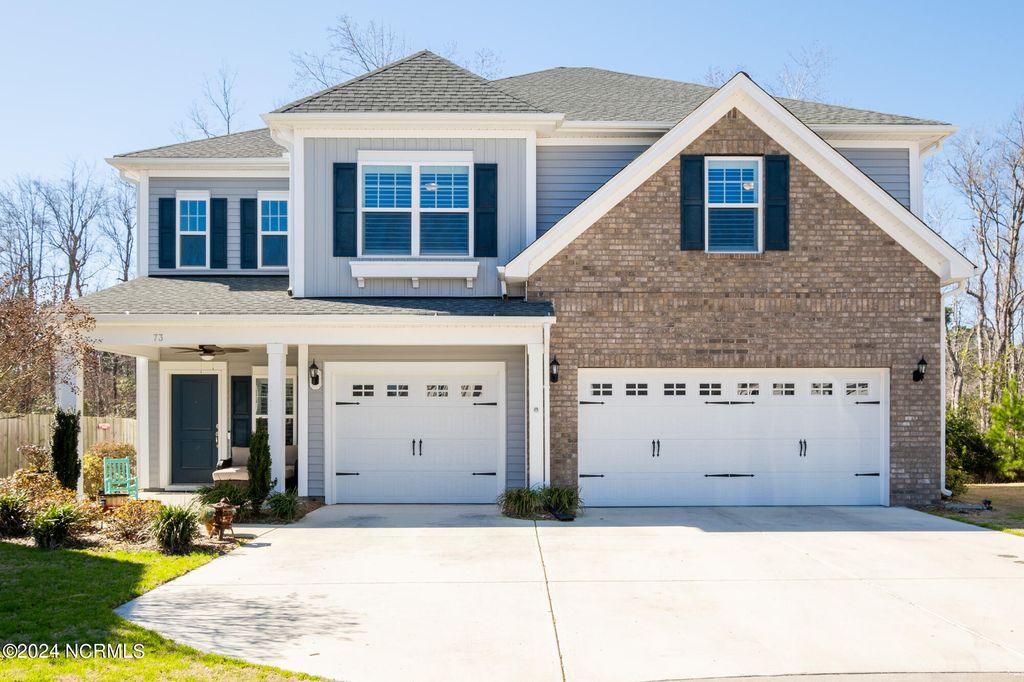 Welcome to 73 Kensington Court, a 5 bed/4 bath Warwick plan by Mungo Homes, that boasts 3735 sq ft of living space located on a cul de sac in the highly sought after Villages at Olde Point! The appeal of this beautiful home starts at the front porch and welcomes you into a foyer that leads to the open living space complete with gorgeous hardwood flooring throughout. The open living area boasts a gas fireplace with granite surround, along with custom judges paneling and upgraded trim work, leading to a dining room, sunroom and gourmet kitchen! These areas, complete with plantation shutters and custom roman shades, overlook the gourmet kitchen, which plays host to several upgrades, including not one, but TWO islands, stainless appliances, gas cooktop, stainless hood, double oven & farmhouse sink, along with upgraded lighting and cabinets, all accompanied by a white brick lay tile backsplash and quartz countertops. The coffered ceiling work and additional cabinetry in the dining room adds a touch of luxury and elegance to the open concept areas, while the sunroom offers a great place to host children so that family and guests can all enjoy the heart of the home together! The downstairs is completed by a guest bedroom and full bath which offers privacy as the only bedroom downstairs. Upstairs, you'll find the large Owner's suite, which boasts a trey ceiling, custom plantation shutters, a walk-in closet and a 10 x11.5 sitting room that's perfect for a home office or gym! The master bath features a tiled, walk-in shower, soaking tub and divided dual vanities, along with a linen closet. Also on the second floor are the remaining three bedrooms, two of which are connected by a split jack & jill bath, while the other offers privacy at the end of the hall, along with a common full bath. An additional flex space offers diversity upstairs that's perfect for a playroom, media room or additional home office! Outside, off the kitchen, a patio and pergola area encourage outdoor dining, cocktails, and conversation, while a graduated back yard offers creativity for multiple outdoor activities.