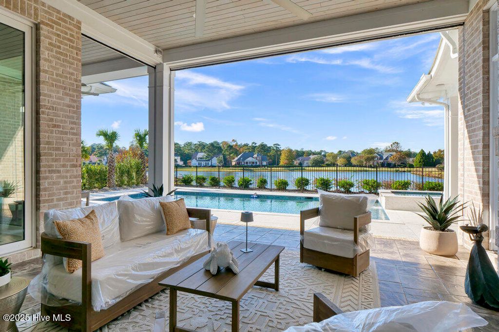 1737 S Moorings is a stunning coastal water front modern brick home with superb craftsmanship sitting on an idyllic lake front and golf course lot in the highly sought after gated community of Landfall and adjacent to Wrightsville Beach and endless amenities and restaurants. This beautiful home by Blanton Building features a spacious ''to die for'' chef's kitchen with stacked 2 level cabinetry, a huge island with farm sink, wet bar with wine and beverage refrigerators as well as a 48'' Wolf gas stove with double ovens and a separate Wolf wall oven and microwave, a 60'' Subzero refrigerator and 2 cove dishwashers. The 3 car garage and 10 driveway parking areas welcome all visitors to this modern craftsman style. The first level boasts floating stairs with glass rails, 12+ ceilings with trays, beams and wood details. The first level also encompasses an exquisite master suite with floating vanities, large walk in shower with multiple shower heads and body sprayers and his and her closets with direct access to the laundry. There is also 3 additional bedrooms and baths on the first level. On the second level, there are 2 other bedrooms and baths, a home gym, home theater, additional living area and a separate recreation room. Above the 3 car garage is a bonus room suite with an additional bedroom, living area, full bath, laundry, and full kitchen. To add to the breathtaking water views, is a rear yard oasis complete with a pool, hot tub, covered lanai, and best of all- an outdoor kitchen. Another bonus of this property is the natural conservation area across the street providing extra privacy and walking paths. This is truly a show stopping property that checks all the boxes and much more!