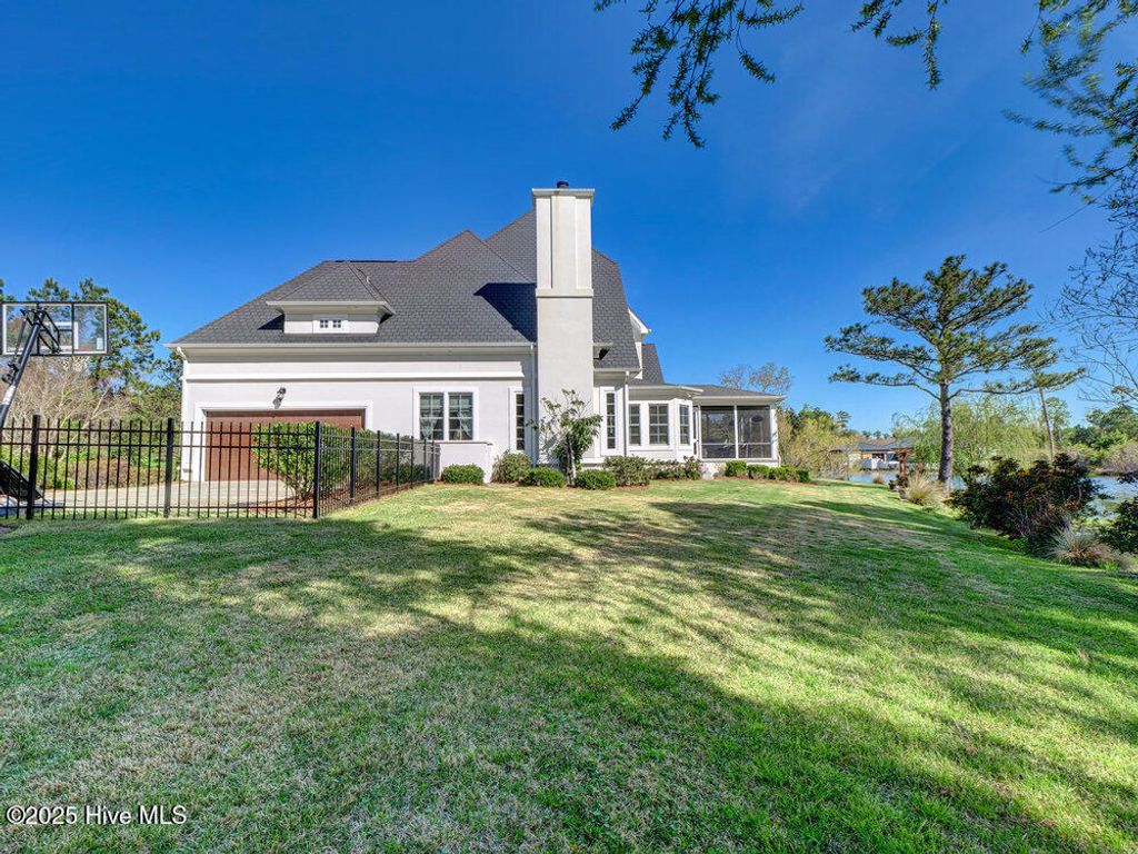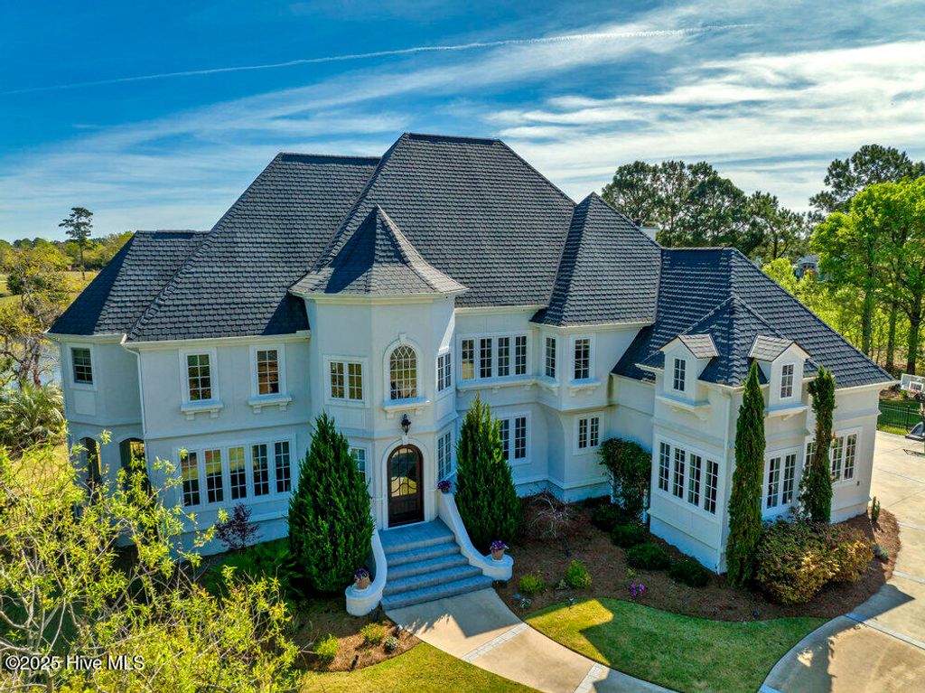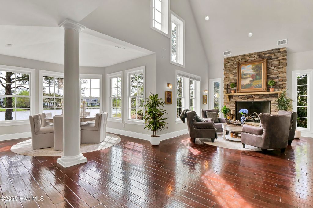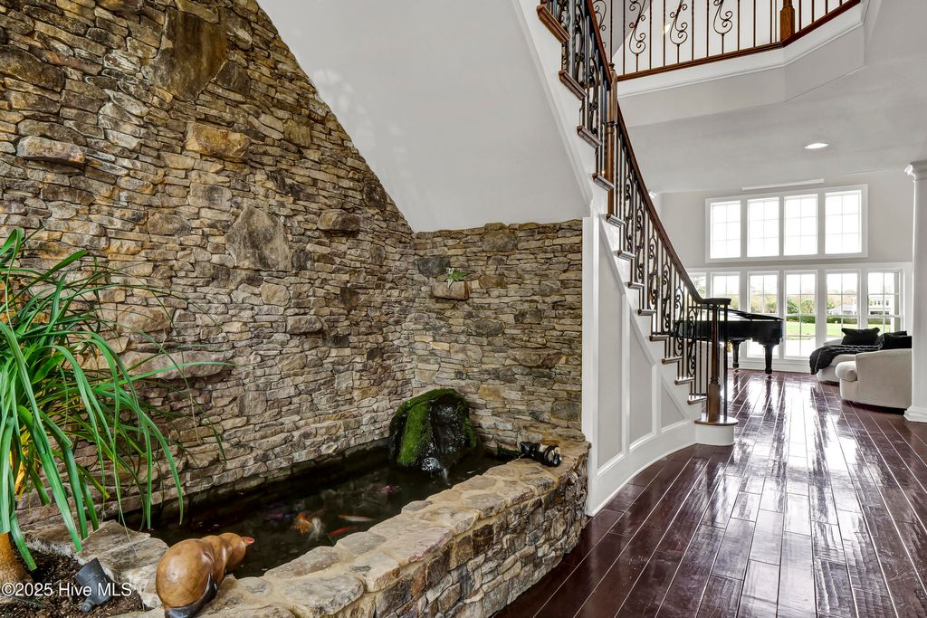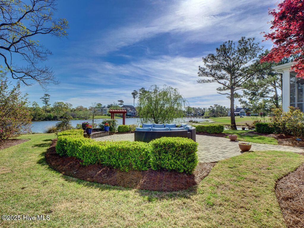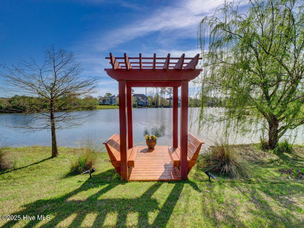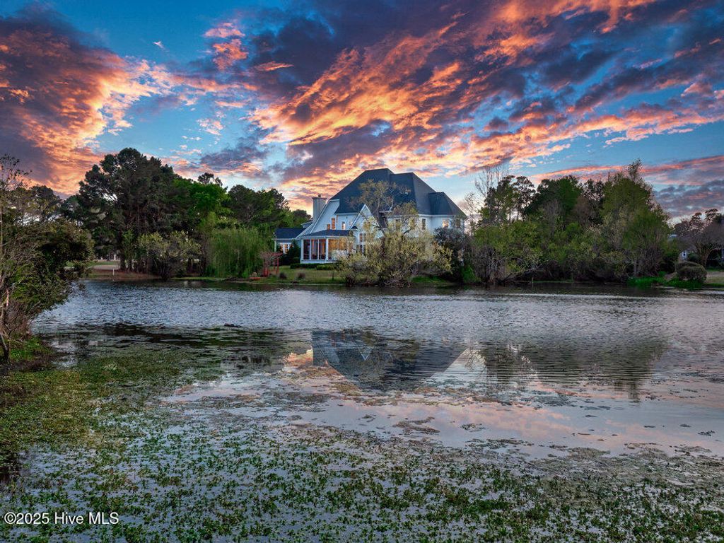 Situated on a quiet, private cul-de-sac in a peaceful peninsula-like setting is where you'll find this lovely lake front Landfall sanctuary with Marsh #8 golf course views. Let your cares slip away as you gaze at swans gliding across the water, turtles basking in the sun or a variety of birds dancing in the breeze. The interior is equally as serene, as a Koi pond with fountain greets you in the foyer along with wood floors & soft, soothing colors that carry throughout formal and informal areas of this stunning residence. You'll love hosting memorable gatherings with family & friends in your gorgeous gourmet Kitchen complete with beautiful new quartz countertop, a Thermador professional series 6 burner natural gas range & 2 ovens, Thermador refrigerator, new dishwasher new microwave, beverage refrigerator, even reverse osmosis, a prep sink & roll out shelves. The generous Kitchen opens to formal & informal living & dining spaces with a stacked stone natural gas or woodburning fireplace. You'll find 2 offices/bedrooms with adjoining balcony and full bath on the first level; upstairs enjoy 4 bedrooms including the oversized Primary Suite with vaulted ceilings, a reading/exercise/meditation area, spacious walk-in closet, sizable jetted tub AND separate jetted shower. Heaven inside & out. Instantly fall in love with the incredible outdoor space - whether entertaining on your lanai, telling tales around the firepit, or simply sitting under the arbor near the water feeling the sunshine. Other special features of this amazing home include 107 windows including floor to ceiling in the Great Room offering abundant natural light, repainted interior, 2 on-demand hot water systems, whole house water filtration system, irrigation system on a well, efficient geothermal heating & cooling for very low energy bills, Laundry Room with sink & cabinets, wired for sound, oversized 2 car garage and fenced backyard. Wow.