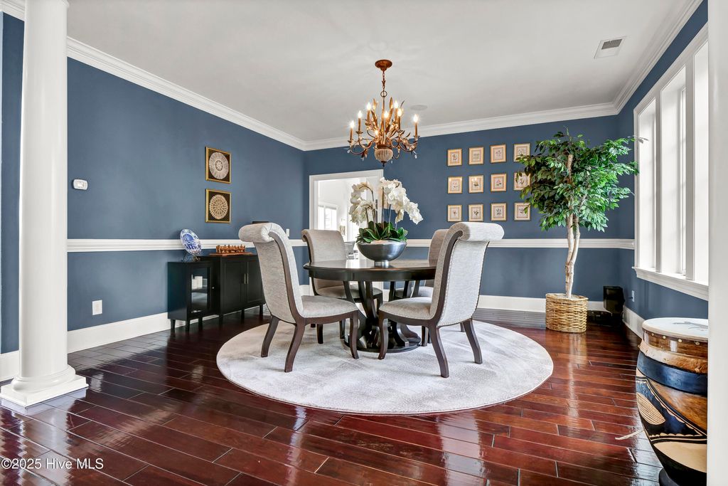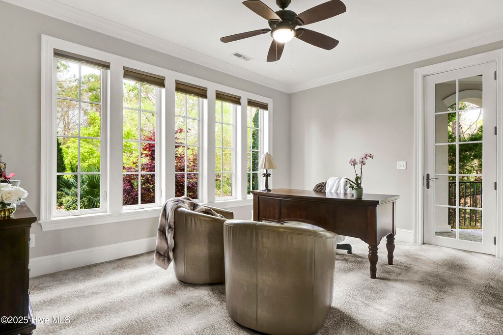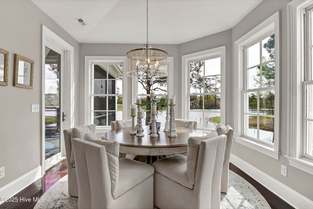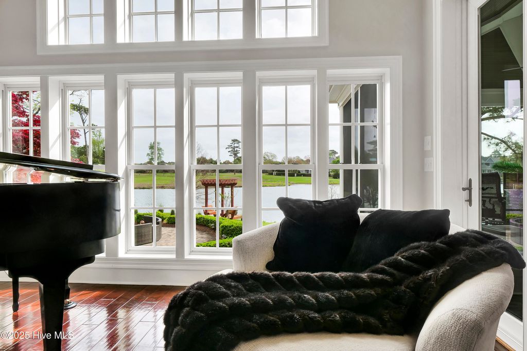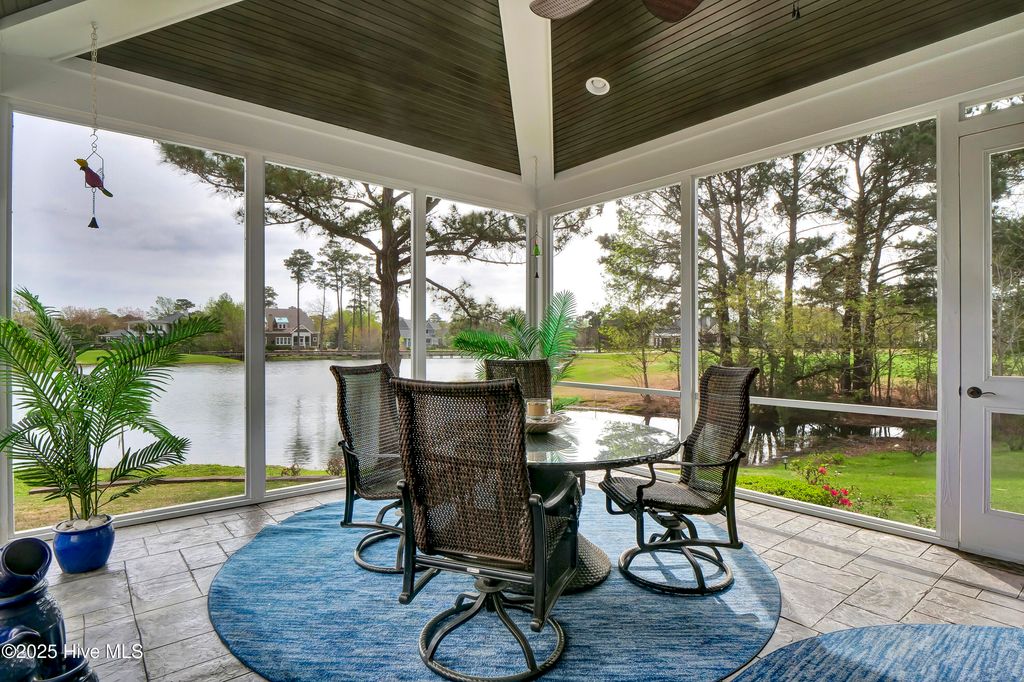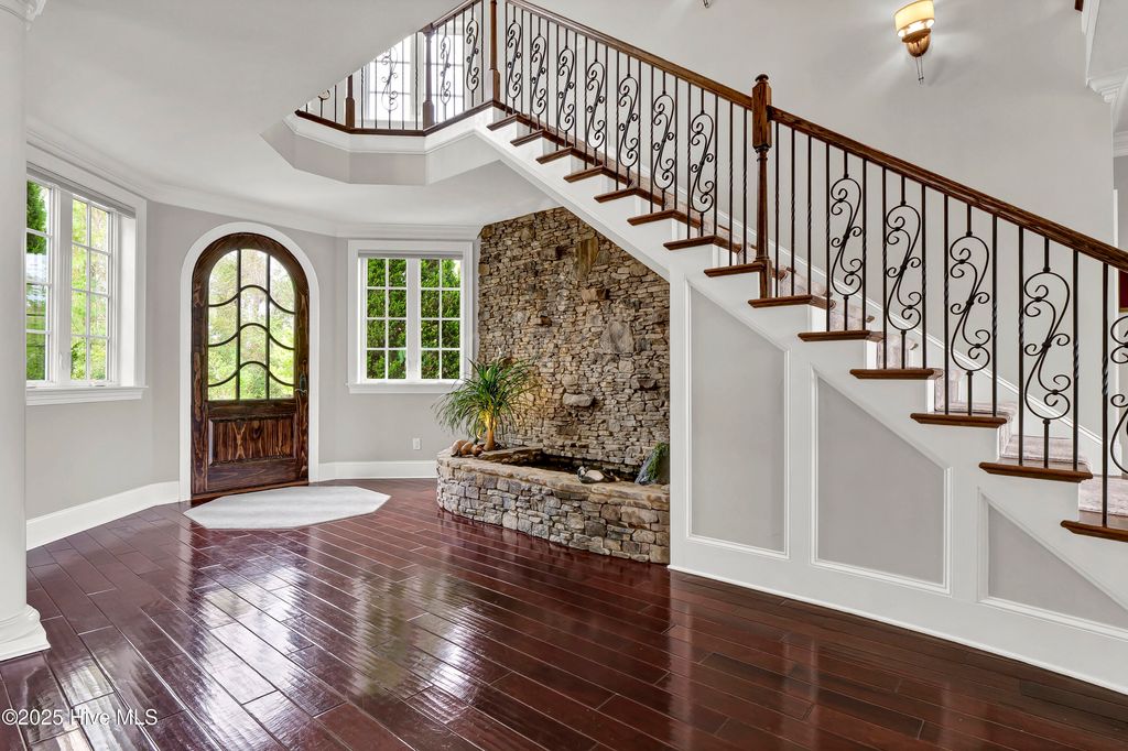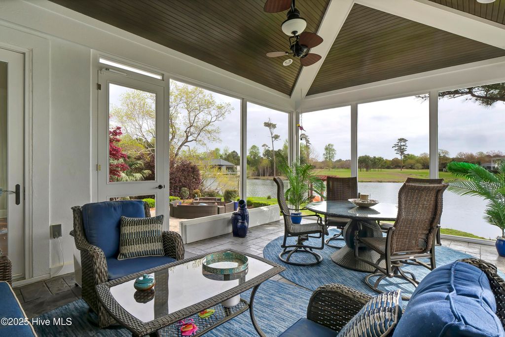 Situated on a quiet, private cul-de-sac in a peaceful peninsula-like setting is where you'll find this lovely lake front Landfall sanctuary with Marsh #8 golf course views. Let your cares slip away as you gaze at swans gliding across the water, turtles basking in the sun or a variety of birds dancing in the breeze. The interior is equally as serene, as a Koi pond with fountain greets you in the foyer along with wood floors & soft, soothing colors that carry throughout formal and informal areas of this stunning residence. You'll love hosting memorable gatherings with family & friends in your gorgeous gourmet Kitchen complete with beautiful new quartz countertop, a Thermador professional series 6 burner natural gas range & 2 ovens, Thermador refrigerator, new dishwasher new microwave, beverage refrigerator, even reverse osmosis, a prep sink & roll out shelves. The generous Kitchen opens to formal & informal living & dining spaces with a stacked stone natural gas or woodburning fireplace. You'll find 2 offices/bedrooms with adjoining balcony and full bath on the first level; upstairs enjoy 4 bedrooms including the oversized Primary Suite with vaulted ceilings, a reading/exercise/meditation area, spacious walk-in closet, sizable jetted tub AND separate jetted shower. Heaven inside & out. Instantly fall in love with the incredible outdoor space - whether entertaining on your lanai, telling tales around the firepit, or simply sitting under the arbor near the water feeling the sunshine. Other special features of this amazing home include 107 windows including floor to ceiling in the Great Room offering abundant natural light, repainted interior, 2 on-demand hot water systems, whole house water filtration system, irrigation system on a well, efficient geothermal heating & cooling for very low energy bills, Laundry Room with sink & cabinets, wired for sound, oversized 2 car garage and fenced backyard. Wow.