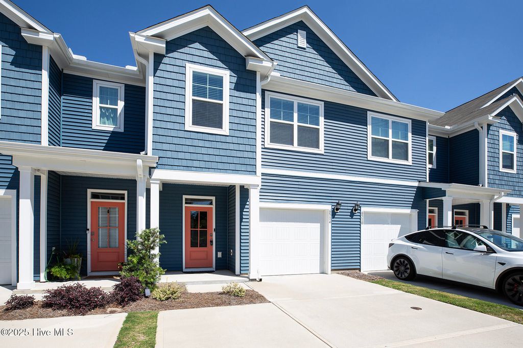 Discover coastal living at its finest in this beautifully designed townhome in the desirable Grand Bay community. Offering low-maintenance living and timeless curb appeal, this home features a one-car garage and a welcoming open-concept layout perfect for the modern lifestyle. The stylish kitchen is a chef's dream, complete with sleek quartz countertops, stainless steel appliances, and a seamless flow into the spacious living room, which creates a space ideal for entertaining. A convenient half bath completes the main floor. Upstairs, retreat to the expansive master suite with vaulted ceilings, a luxurious en suite bathroom, and a generous walk-in closet. Two additional guest bedrooms share a well-appointed full bathroom, providing comfort and privacy for family or visitors. On the main floor, step outside through the sliding doors to a private deck overlooking the tranquil beauty of River Road Park, a perfect setting for morning coffee or evening relaxation. Residents of Grand Bay enjoy a true waterfront lifestyle with amenities that include a riverfront pool area, a scenic community pier, a peaceful gazebo, convenient kayak storage, and a private beach area. Just a quick kayak or boat ride away lies Shark Tooth Island, a local treasure known for its abundance of fossilized shark teeth. Ideally located with the perfect blend of convenience and coastal charm, this community is just minutes from Carolina Beach and surrounded by numerous restaurants, shops, and coastal attractions. Don't miss the chance to own a piece of paradise in this vibrant and sought-after community!