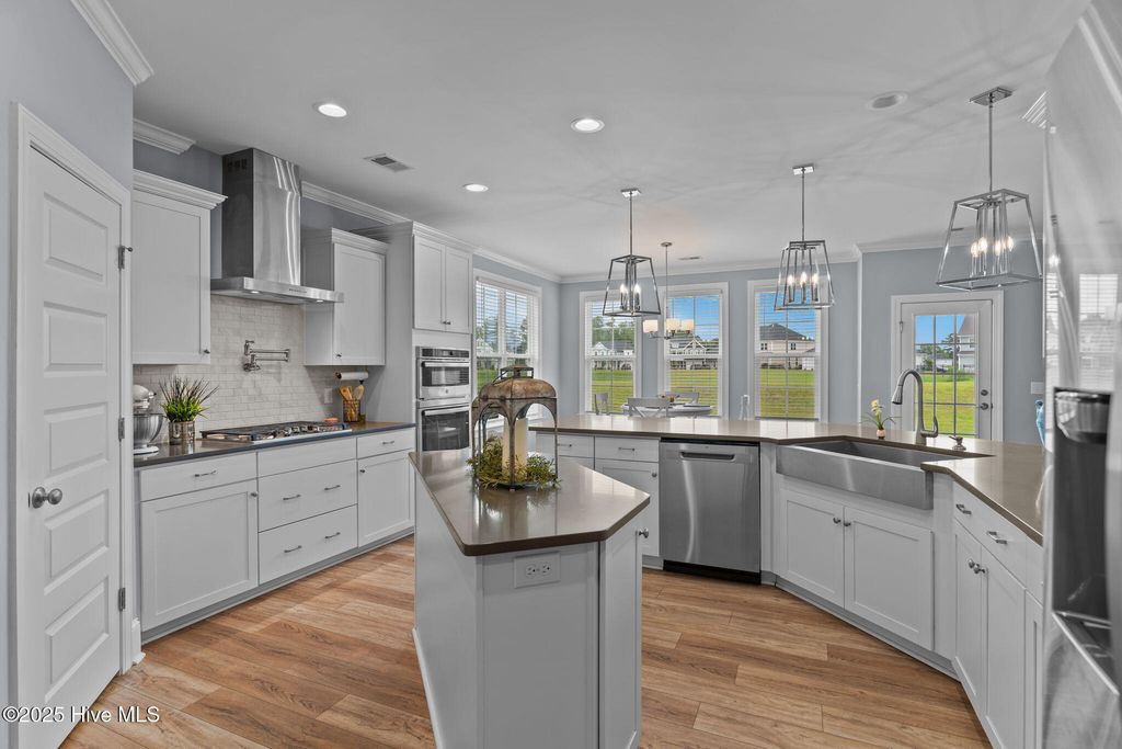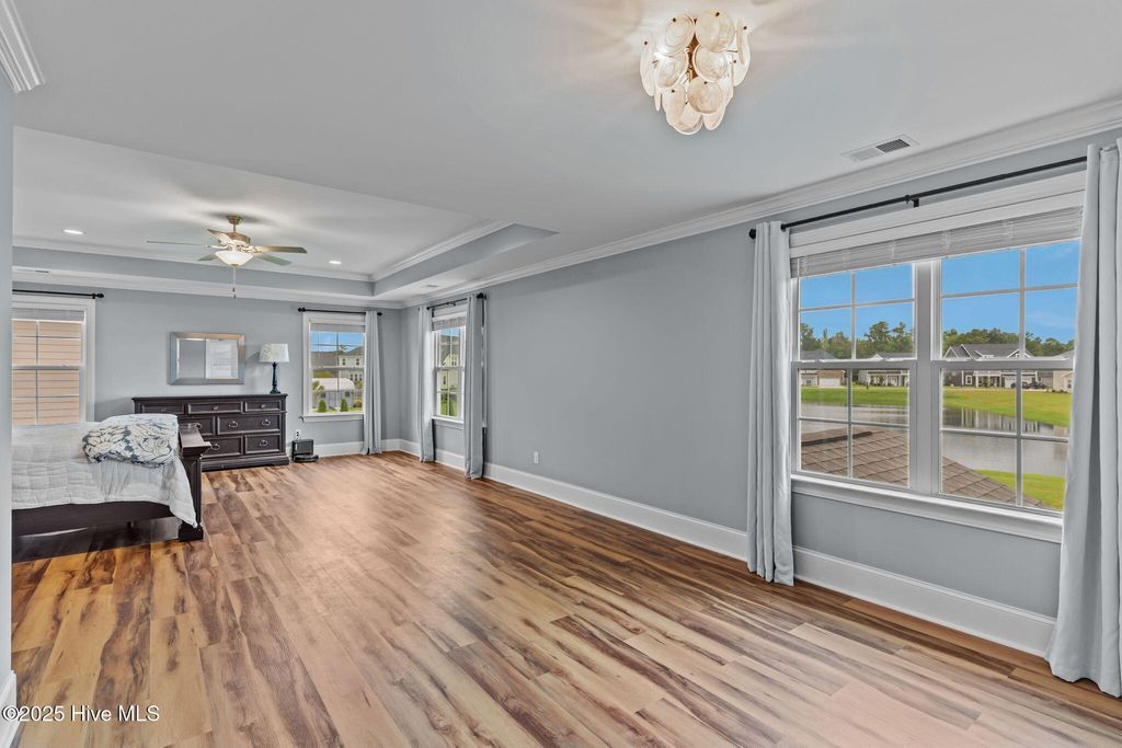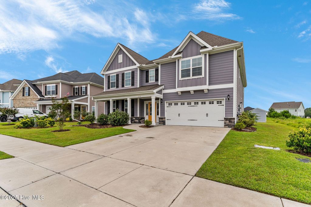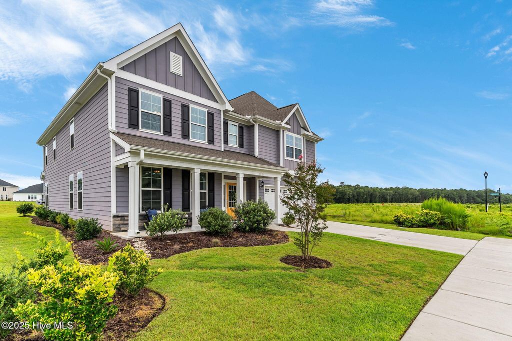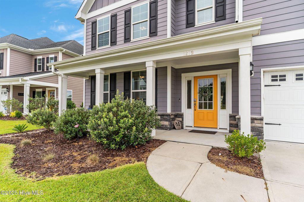 MOTIVATED SELLER! Seller to offer rate buy-down and or closing cost with preferred lender, not to exceed $5,000. Experience coastal elegance in this exquisite 6-bedroom, 4-bath residence, boasting over 4,000 square feet! Upon entering, you are welcomed by a stately foyer, immediately leading to a dedicated home office/flex space, complete with French doors, an ideal setting for productivity or creativity. This home is designed with entertaining in mind, featuring a beautifully appointed formal dining room with coffered ceilings, perfect for hosting dinner parties and holiday gatherings. Between the formal dining area and the kitchen, there is a charming space for a dedicated wine or coffee bar. At the heart of the home lies the impressive epicurean kitchen, equipped with a gas stove, a pot filler, a large walk-in pantry, abundant cabinetry, and expansive quartz countertops, ensuring seamless entertaining. The open layout flows effortlessly into the living areas, where natural light and thoughtful design create an inviting ambiance. Everyone can have their own space here, including pets! There is a built-in hideaway under the stairs that serves as the perfect ''Paw-Suite''. What truly makes this house special is the upstairs primary suite. It is extraordinary, offering 472 square feet of space! Multiple windows frame expansive pond views, flooding the room with natural light and creating a serene, tranquil atmosphere. This suite is not just spacious; it's enormous, a private haven you'll never want to leave. With a total of six bedrooms, the home provides comfort and privacy for both family and guests. The four beautifully appointed bathrooms feature designer fixtures and spa-like details, ensuring that every moment spent at home feels indulgent. Recent upgrades include upgraded lighting fixtures in the kitchen, new carpet in the bedrooms, new blinds throughout, and a new storage building in the backyard. Additionally, the home boasts a tankless water heater, irrigation, and plenty of storage. The home has approval for an aluminum fence and extended patio, and is NOT in a flood zone! Pools are also allowed! Residents can enjoy resort-style amenities, including a sparkling pool, firepit, sidewalks, and plans for a kayak launch on scenic Futch Creek. The neighborhood offers unmatched convenience, being just steps away from Novant Health's Scotts Hill Medical Plaza, with a new state-of-the-art hospital slated to open in 2026, and only minutes from top-rated schools. Blending timeless coastal architecture with easy access to healthcare, education, dining, and recreation, Scotts Hill Village is more than just a neighborhood; it's a lifestyle.