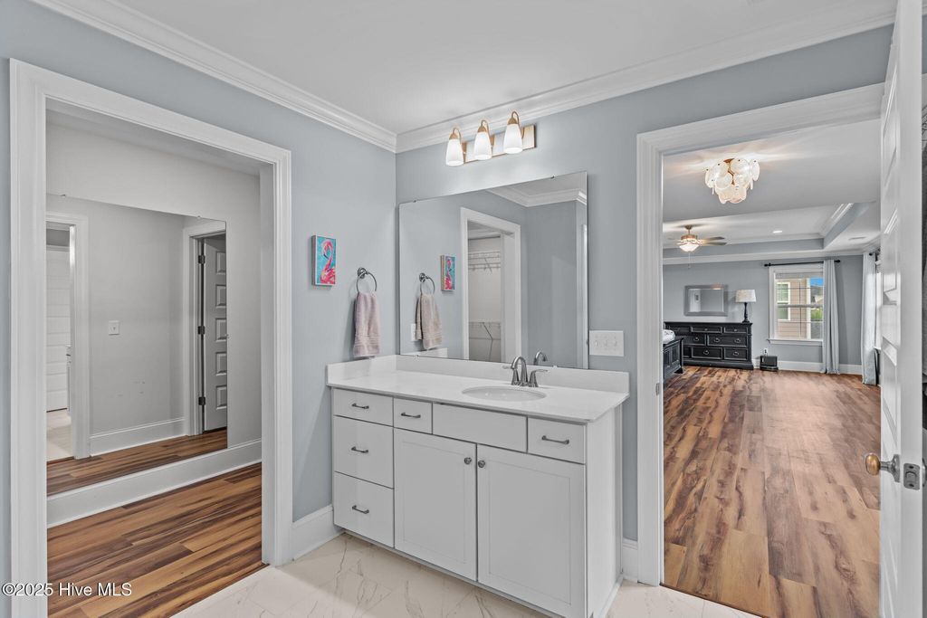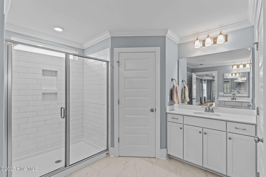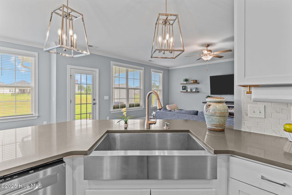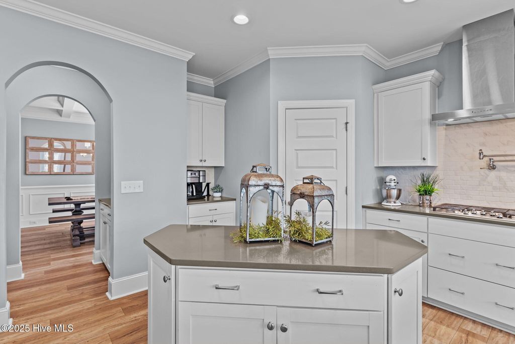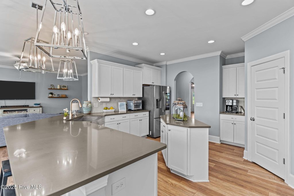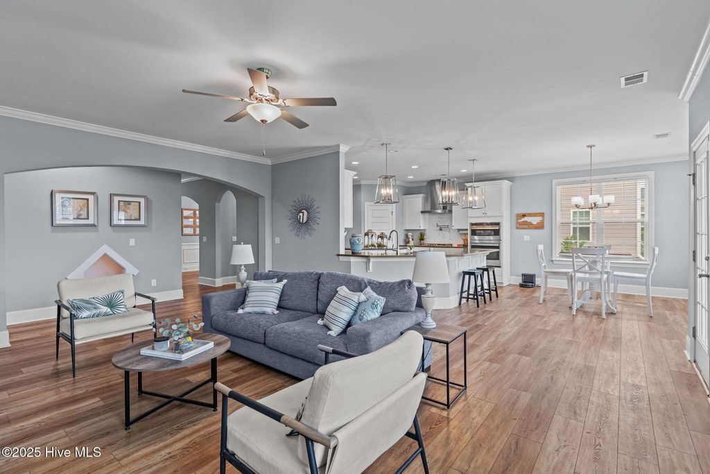 MOTIVATED SELLER! Seller to offer rate buy-down and or closing cost with preferred lender, not to exceed $5,000. Experience coastal elegance in this exquisite 6-bedroom, 4-bath residence, boasting over 4,000 square feet! Upon entering, you are welcomed by a stately foyer, immediately leading to a dedicated home office/flex space, complete with French doors, an ideal setting for productivity or creativity. This home is designed with entertaining in mind, featuring a beautifully appointed formal dining room with coffered ceilings, perfect for hosting dinner parties and holiday gatherings. Between the formal dining area and the kitchen, there is a charming space for a dedicated wine or coffee bar. At the heart of the home lies the impressive epicurean kitchen, equipped with a gas stove, a pot filler, a large walk-in pantry, abundant cabinetry, and expansive quartz countertops, ensuring seamless entertaining. The open layout flows effortlessly into the living areas, where natural light and thoughtful design create an inviting ambiance. Everyone can have their own space here, including pets! There is a built-in hideaway under the stairs that serves as the perfect ''Paw-Suite''. What truly makes this house special is the upstairs primary suite. It is extraordinary, offering 472 square feet of space! Multiple windows frame expansive pond views, flooding the room with natural light and creating a serene, tranquil atmosphere. This suite is not just spacious; it's enormous, a private haven you'll never want to leave. With a total of six bedrooms, the home provides comfort and privacy for both family and guests. The four beautifully appointed bathrooms feature designer fixtures and spa-like details, ensuring that every moment spent at home feels indulgent. Recent upgrades include upgraded lighting fixtures in the kitchen, new carpet in the bedrooms, new blinds throughout, and a new storage building in the backyard. Additionally, the home boasts a tankless water heater, irrigation, and plenty of storage. The home has approval for an aluminum fence and extended patio, and is NOT in a flood zone! Pools are also allowed! Residents can enjoy resort-style amenities, including a sparkling pool, firepit, sidewalks, and plans for a kayak launch on scenic Futch Creek. The neighborhood offers unmatched convenience, being just steps away from Novant Health's Scotts Hill Medical Plaza, with a new state-of-the-art hospital slated to open in 2026, and only minutes from top-rated schools. Blending timeless coastal architecture with easy access to healthcare, education, dining, and recreation, Scotts Hill Village is more than just a neighborhood; it's a lifestyle.