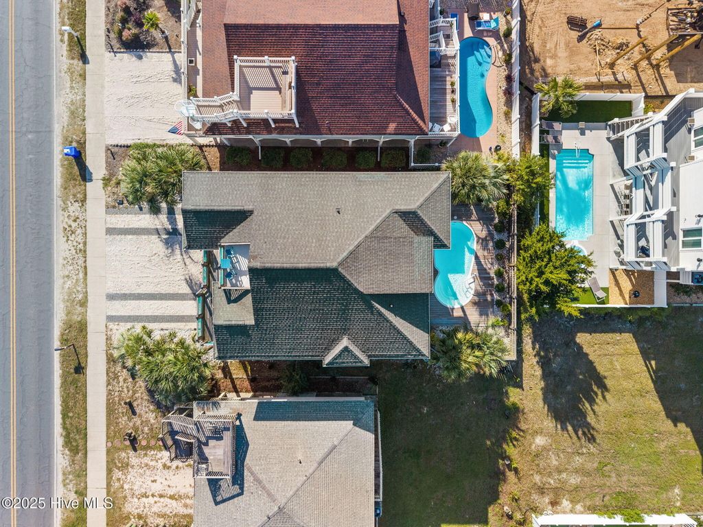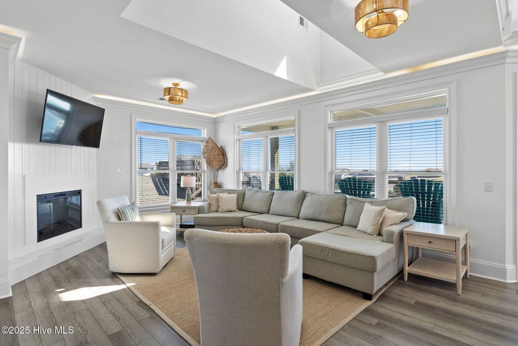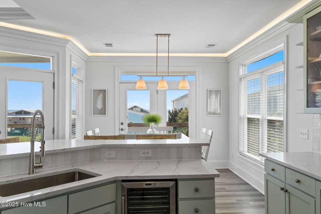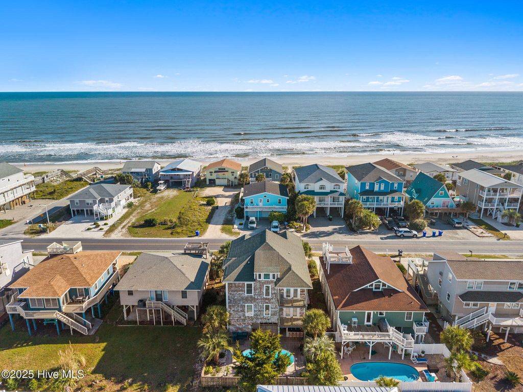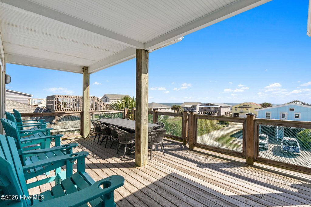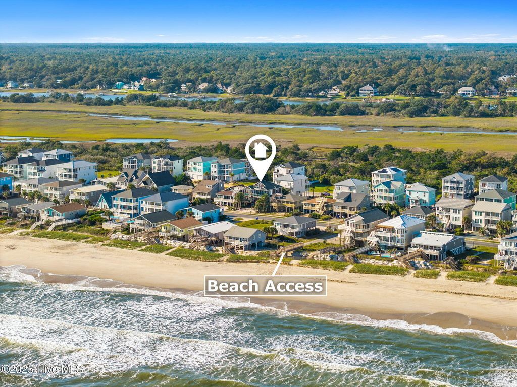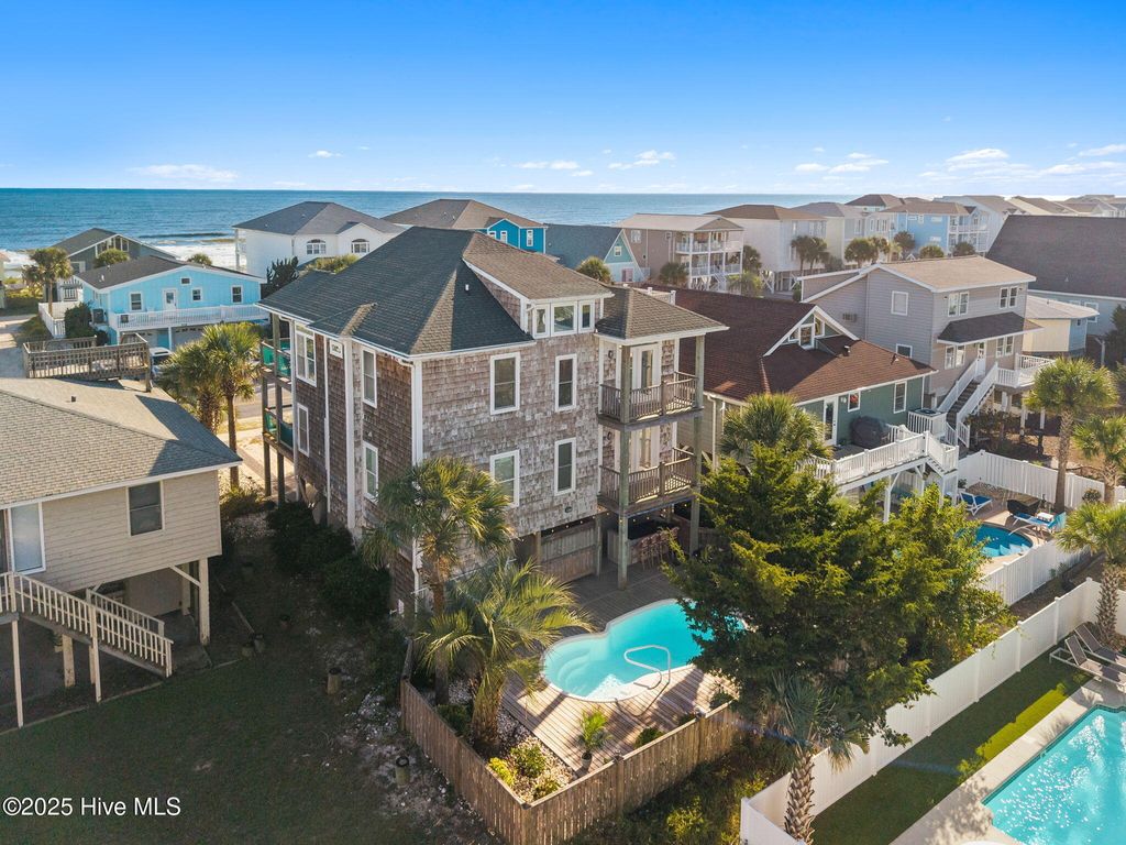 Beautifully updated coastal retreat just steps from the beach with panoramic ocean views! This 5BR/5BA home offers an inviting open layout with numerous interior updates including new LVP flooring, fresh paint, updated lighting & stylish coastal decor. On the main level, enjoy a stunning kitchen featuring a spacious island with gorgeous quartz countertops and premier stainless-steel appliances. The kitchen is also open to a bright and airy living room and dining with windows surrounding to enhance all the views of Ocean Isle Beach. 2 bedroom/2 bath suites finish off the main floor while the remaining 3 bedroom/3 bath suites are found on the bottom floor along with a second living area and wet bar. Up top, enjoy a quaint bunk area on your way to the Crow's Nest to watch the sun rise over the Atlantic while sipping your morning coffee. Outdoors--sit and relax on one of the many covered decks, get ready for a game of pool, enjoy a drink at the bar and a meal on the grill, or take a dive in the crisp swimming pool. 397 E Second has the perfect outdoor space to host and entertain or relax after a long day of sunshine and sand! Sold fully furnished with high-end furniture and decor, this home is truly turnkey and ready for making memories. Ideal for a vacation rental, second home, or full-time coastal living in a prime OIB location!