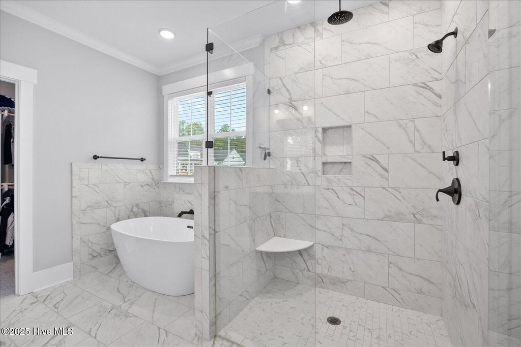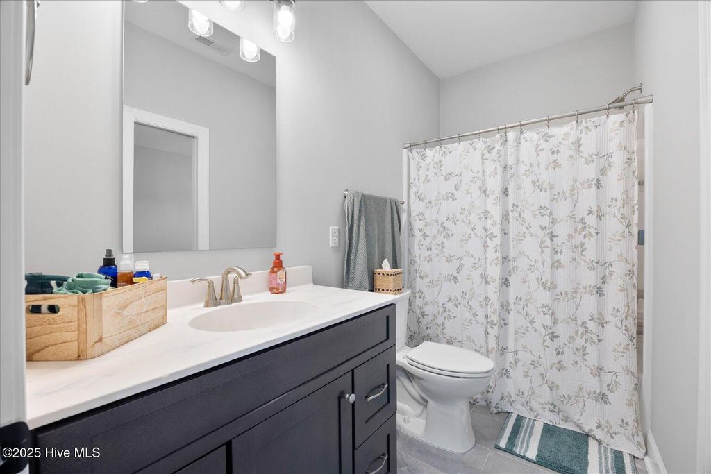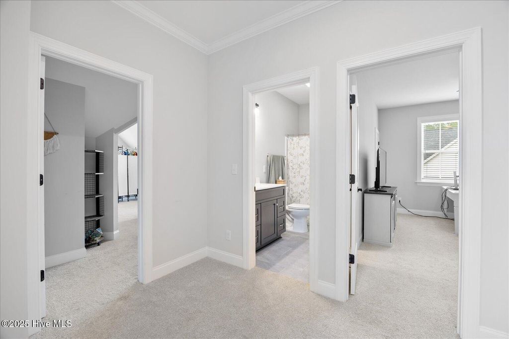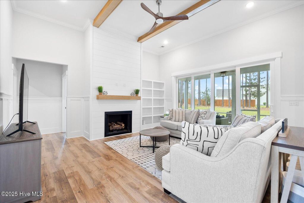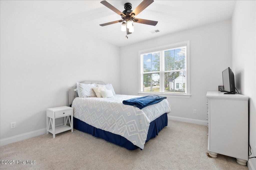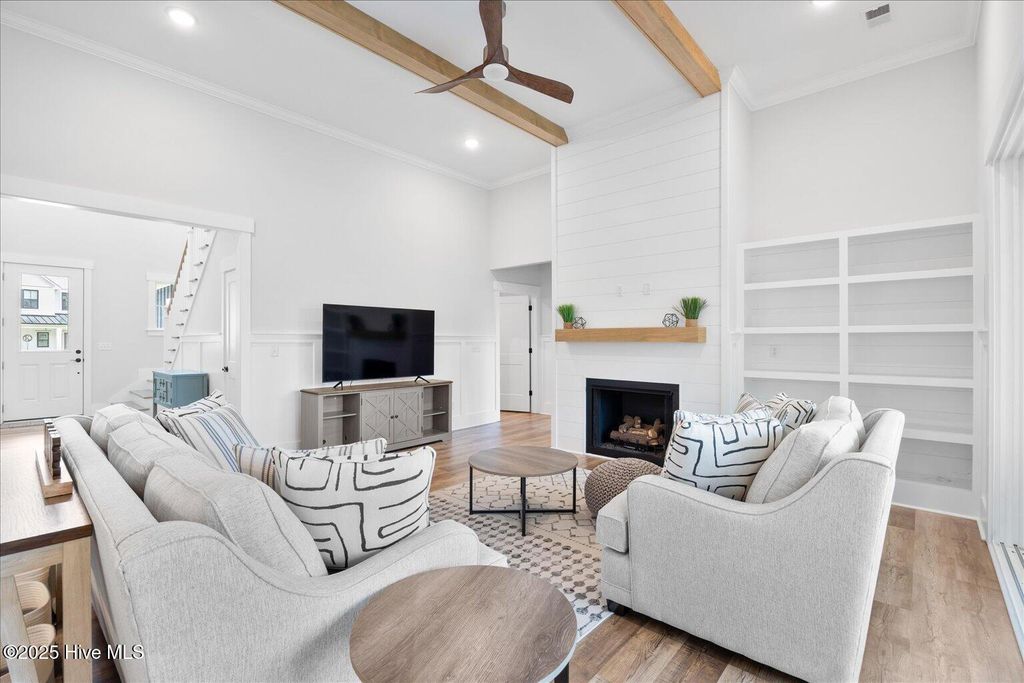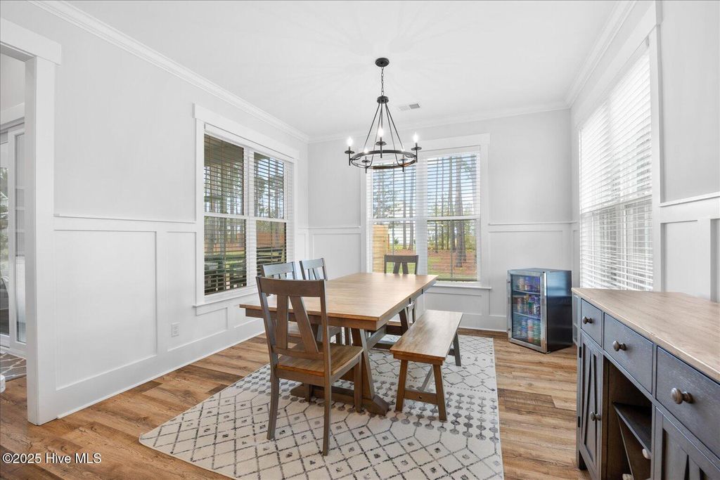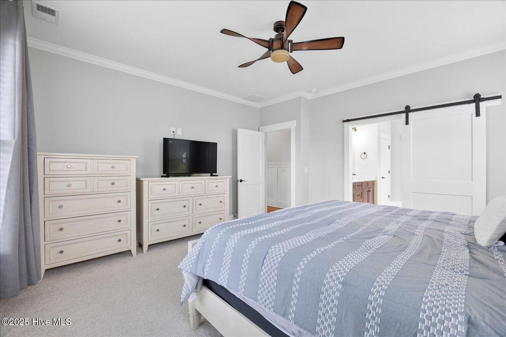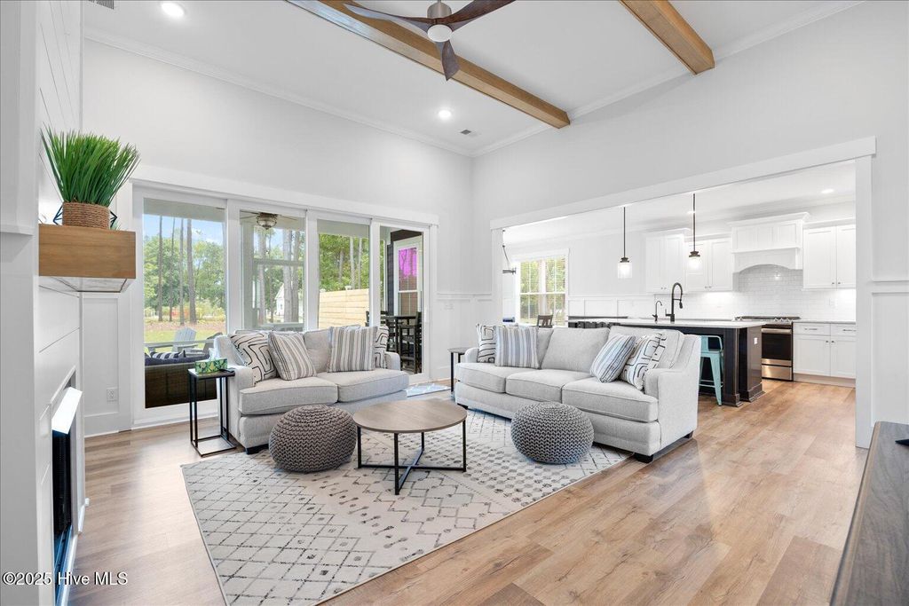 This beautifully crafted home sits on a corner estate lot overlooking scenic Virginia Creek and offers the perfect blend of elegance and functionality. A welcoming covered front porch leads into a grand two-story foyer filled with natural light and custom trim details throughout. The spacious main living area features an open concept design ideal for gatherings and everyday living. The great room includes a cozy gas fireplace with shiplap surround and opens through large telescoping sliders to an expansive screened porch"”perfect for enjoying the coastal breeze. The chef's kitchen is designed for both style and convenience, featuring quartz countertops, a large island with farmhouse sink, custom soft-close cabinetry, and under-cabinet lighting. A nearby dining nook and walk-in pantry with space for a coffee or wine bar make entertaining effortless. The first-floor primary suite provides a relaxing retreat with a dual vanity, custom tile shower, and walk-in closet with wood shelving. Upstairs are two spacious bedrooms, two full baths, and a versatile bonus room offering plenty of flexibility for guests, hobbies, or media. Additional highlights include both full house filtration and reverse osmosis system under kitchen sink, a mudroom and laundry area off the main living space, full yard irrigation with a dedicated well, and a fully sodded lawn. Crown Pointe residents enjoy a true coastal lifestyle with double sidewalks, a community pool and clubhouse, and access to a dock, gazebo, and day dock for boating. Ideally located just seven minutes from Topsail Island and Surf City beaches and within the highly rated Topsail School District.