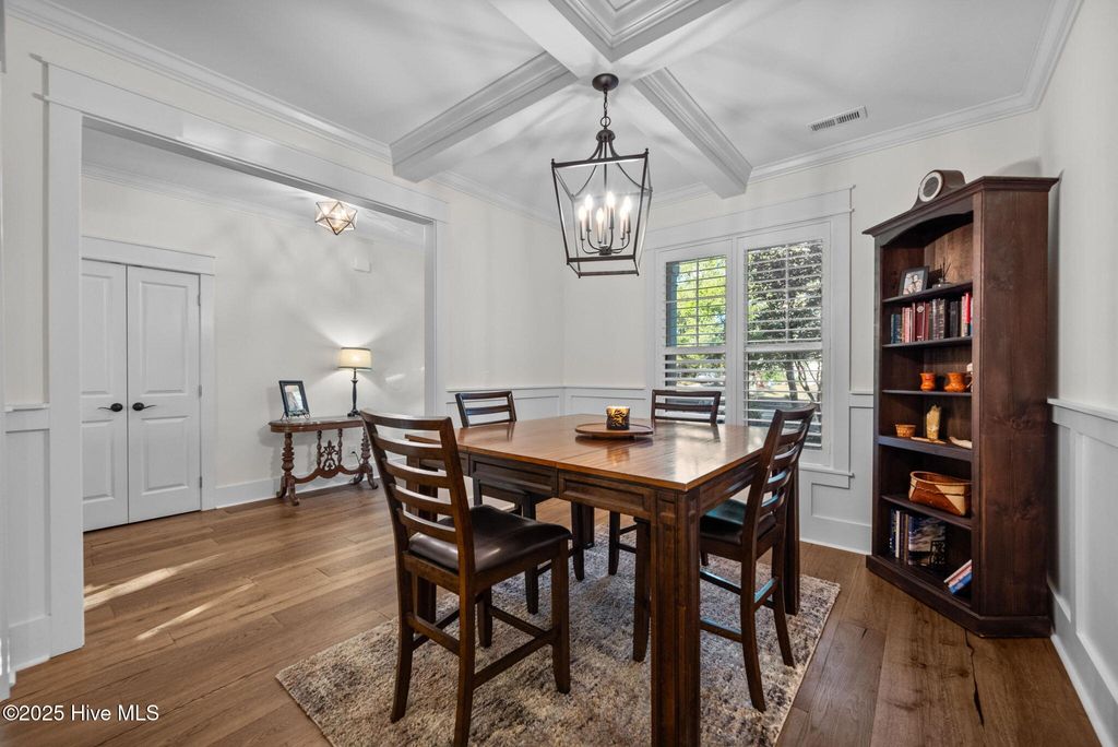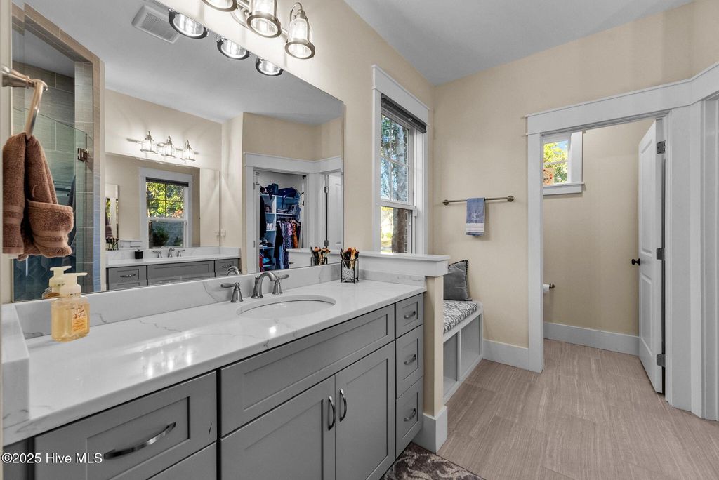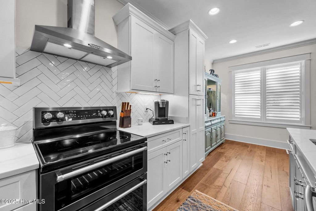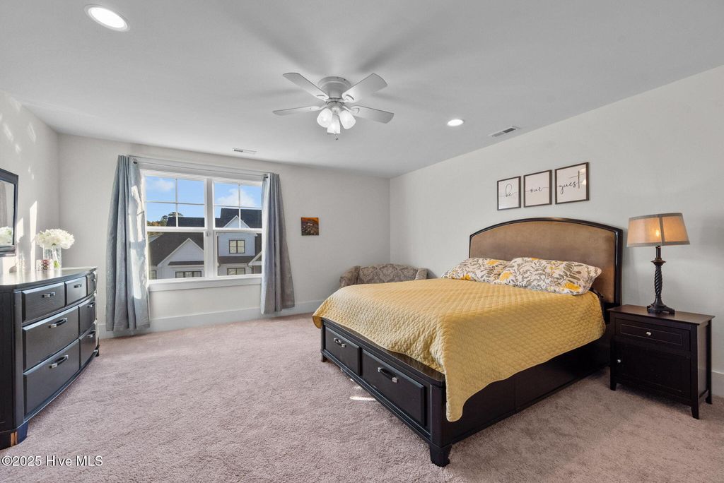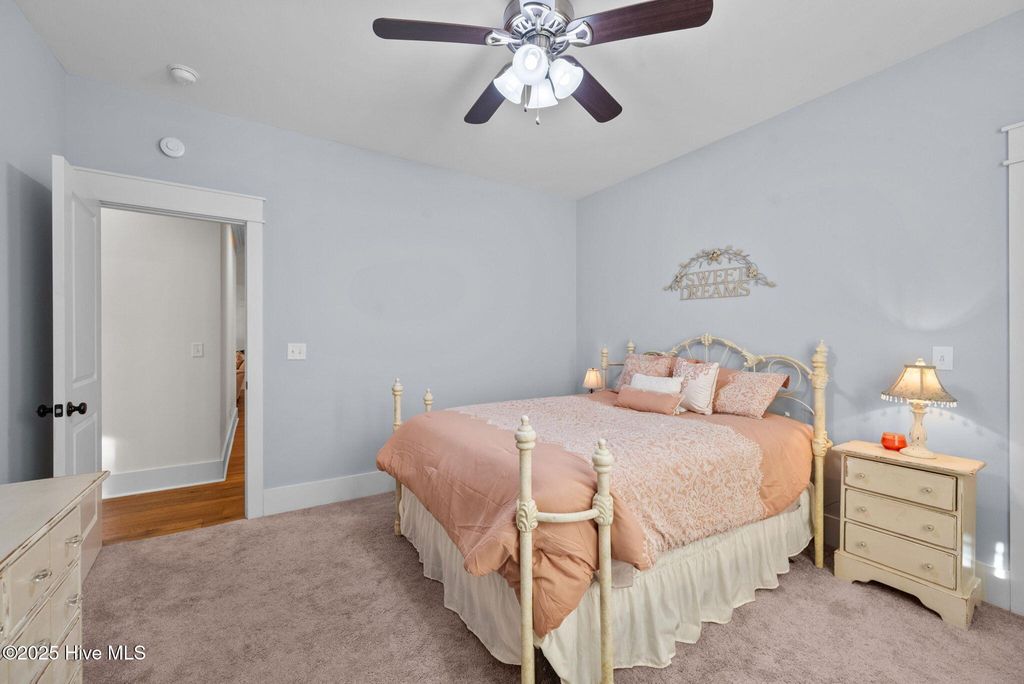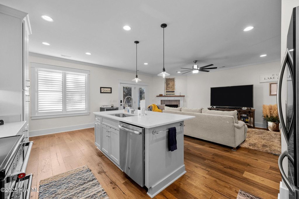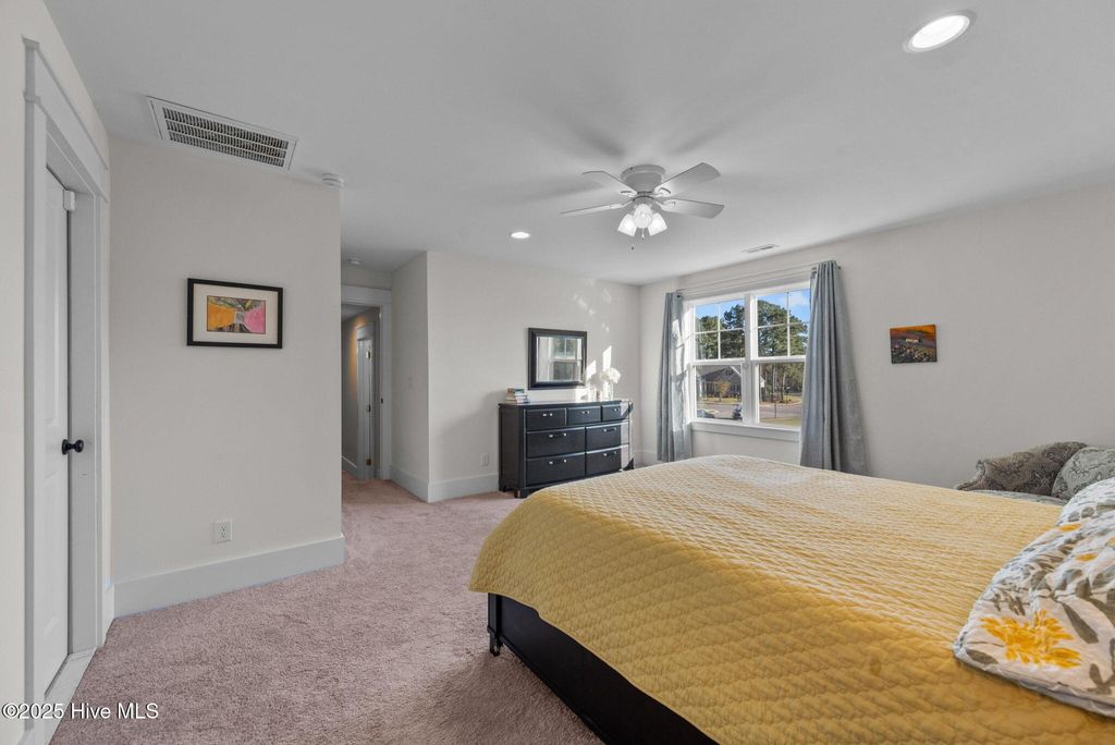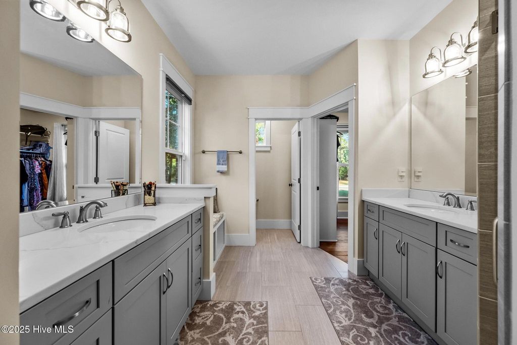 Welcome home to refined coastal living in the sought-after waterfront community of Crown Pointe, where residents enjoy resort-style amenities including a pool, clubhouse, fitness center, and private pier with kayak launch"”all just minutes from Sloop Point Marina and the award-winning Topsail Beaches. This stunning 3,000+ square foot brick residence where main level offers 3 bedrooms, 2 full bathrooms, and an additional 2 spacious bonus rooms and a full bathroom on the second level, perfectly blending timeless elegance with modern comfort. The oversized rocking-chair front porch welcomes you with Southern charm and leads into a grand foyer showcasing exceptional craftsmanship with wainscoting, 7-inch trimmed wood floors, and oversized windows dressed with plantation shutters. The chef's kitchen is a true centerpiece, featuring quartz countertops, white shaker cabinetry, and a stylish herringbone tile backsplash. High-end stainless-steel appliances, including a double oven and designer hood, pair beautifully with thoughtful details like pendant lighting, a single-basin sink, and a custom two-tier lazy Susan. Entertain guests at your 6-foot kitchen island, formal dining area boasting coffered ceilings, cozy up to your gas fireplace in the heart of the home, living room or take the party outside to your 15x12 screened in porch overlooking your private backyard. The Primary Suite serves as a tranquil retreat with hardwood floors, double windows, and a luxurious ensuite boasting dual separated vanities, a walk-in tile shower with built-in seating, and a custom wood-shelved closet. Two guest bedrooms share a beautifully tile accented bath, and the spacious laundry room off the garage includes LG appliances, cabinetry, and extra storage. Upstairs, two versatile bonus rooms with a full bath provide endless flexibility for a home office, gym, or guest suite, along with a walk-in floored attic for abundant storage. Additional highlights include a Rainbird irrigation system with private well, LeafFilter gutter system with lifetime warranty, ADT security system, and a side-load 2-car garage.