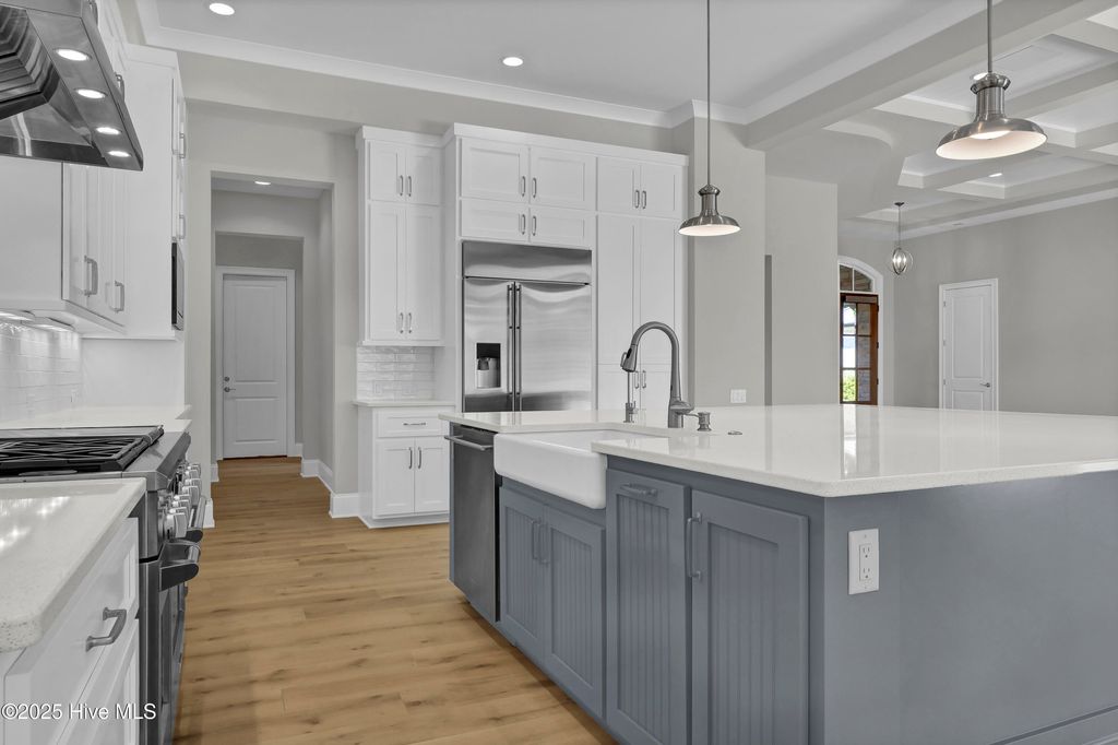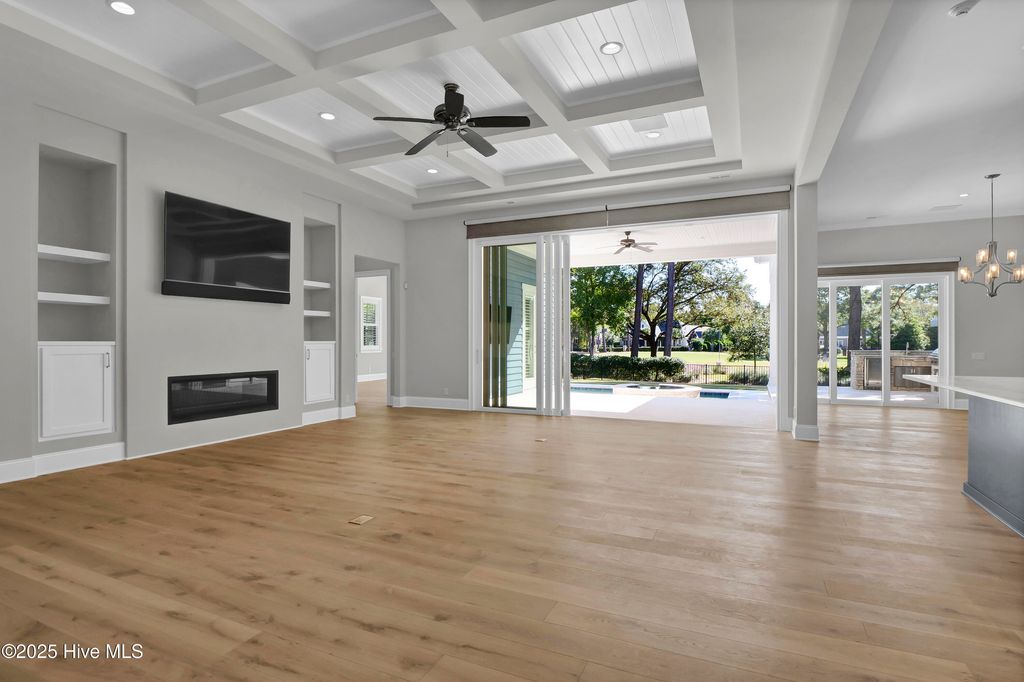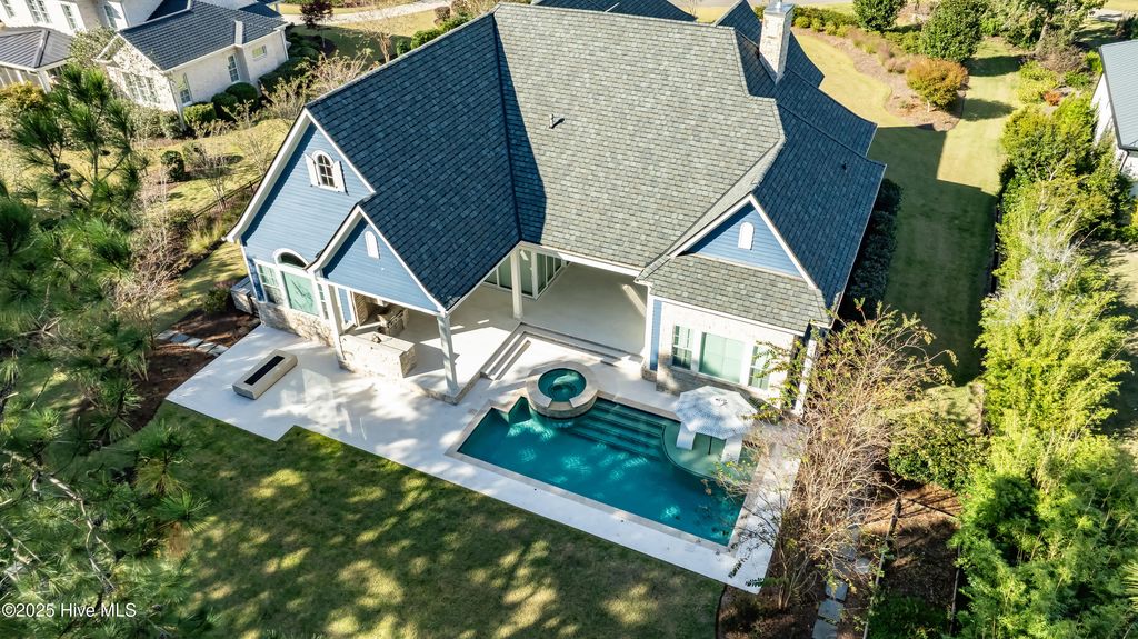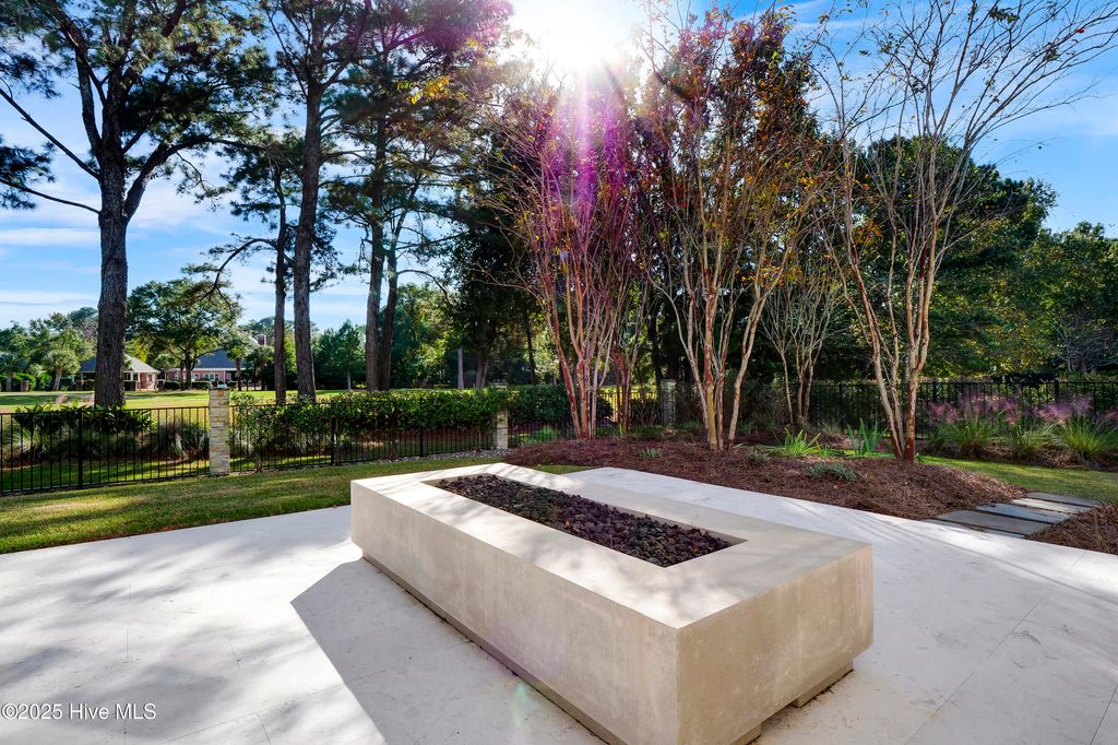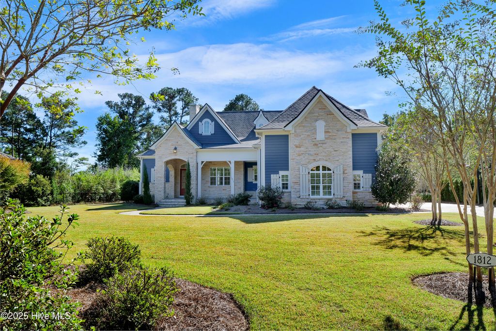 The easy life beckons! This gorgeous coastal home offers one-level course-front living in a prime location within one of Wilmington's most coveted gated communities. Just moments from Wrightsville Beach and all of the area's wonderful shopping and dining amenities, you will find this gorgeous custom 2017 home on a 3/4 acre lot in a quiet cul-de-sac overlooking the 5th hole of the Pete Dye Course. Featuring beautiful new white oak hardwood flooring throughout, the open floor plan consists of 3556 sq ft, 3 bedrooms, 3.5 baths, two office or flex spaces, a spacious kitchen with enormous island, hidden walk-in pantry, and 48'' gas range. The living and dining area both feature expansive sliding doors that open to your own private outdoor oasis beyond with spacious multi-level terrace, outdoor kitchen, fire pit, pool, and spa, all taking advantage of serene course-front views. Mud-room space at the rear entry, a substantial laundry room, three-car garage, and a generous attic that spans the entire home offer additional storage and complete the atmosphere of convenient, put-together, easy living that you'll find in this gorgeous property. Make it yours today!