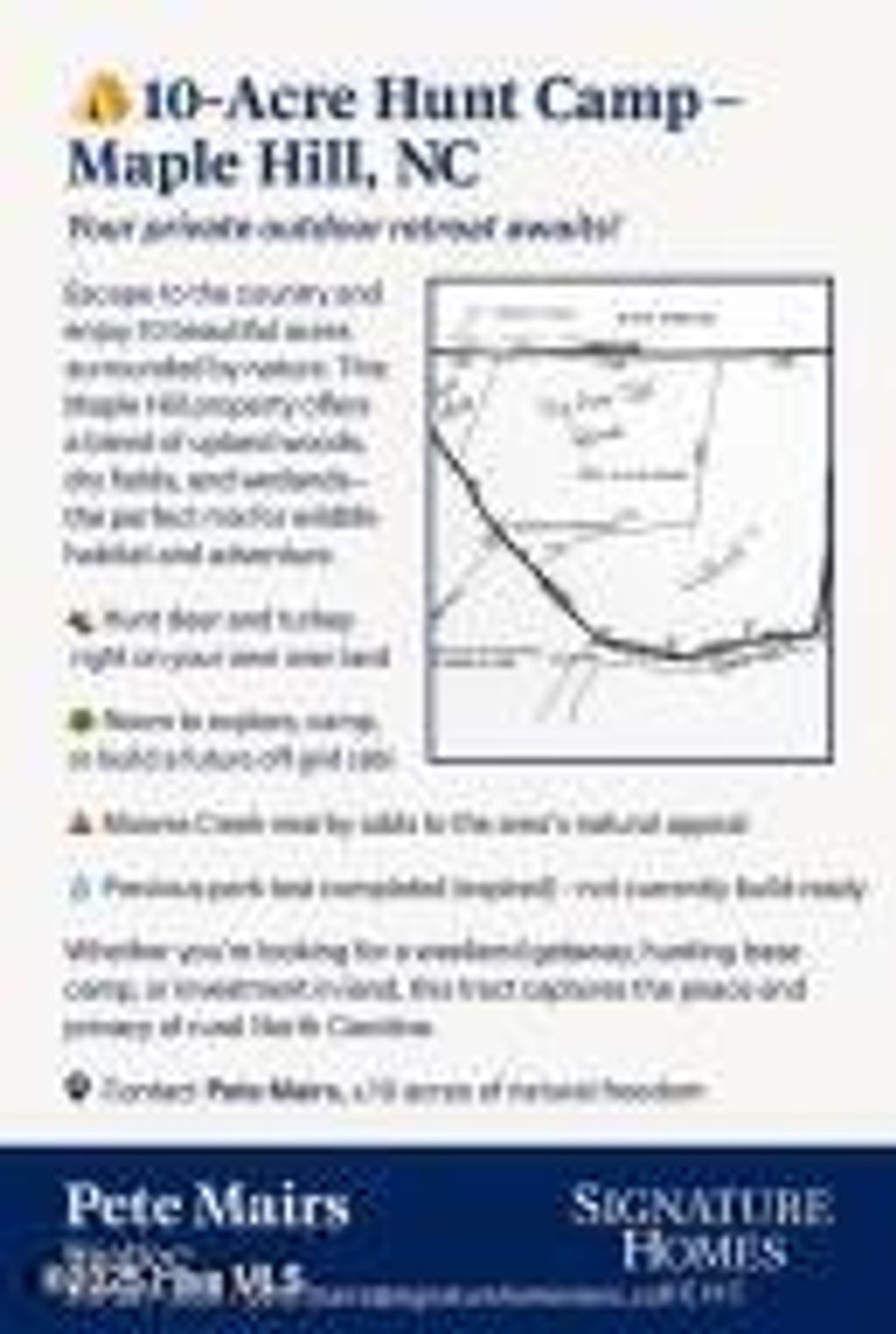 10-Acre Hunt Camp - Maple Hill, NC Your private outdoor retreat awaits! Escape to the country and enjoy 10 beautiful acres surrounded by nature. This Maple Hill property offers a blend of upland woods, dry fields, and wetlands "” the perfect mix for wildlife habitat and adventure. 🦌 Hunt deer and turkey right on your own land 🌳 Room to explore, camp, or build a future off-grid cabin 💧 Moores Creek nearby adds to the area's natural appeal Previous perk test completed (expired) - not currently build-ready Whether you're looking for a weekend getaway, hunting base camp, or investment in land, this tract captures the peace and privacy of rural North Carolina. Agent Remark