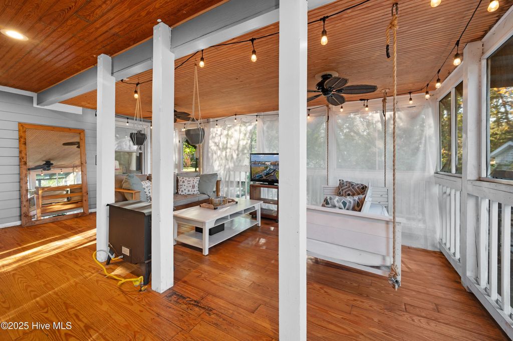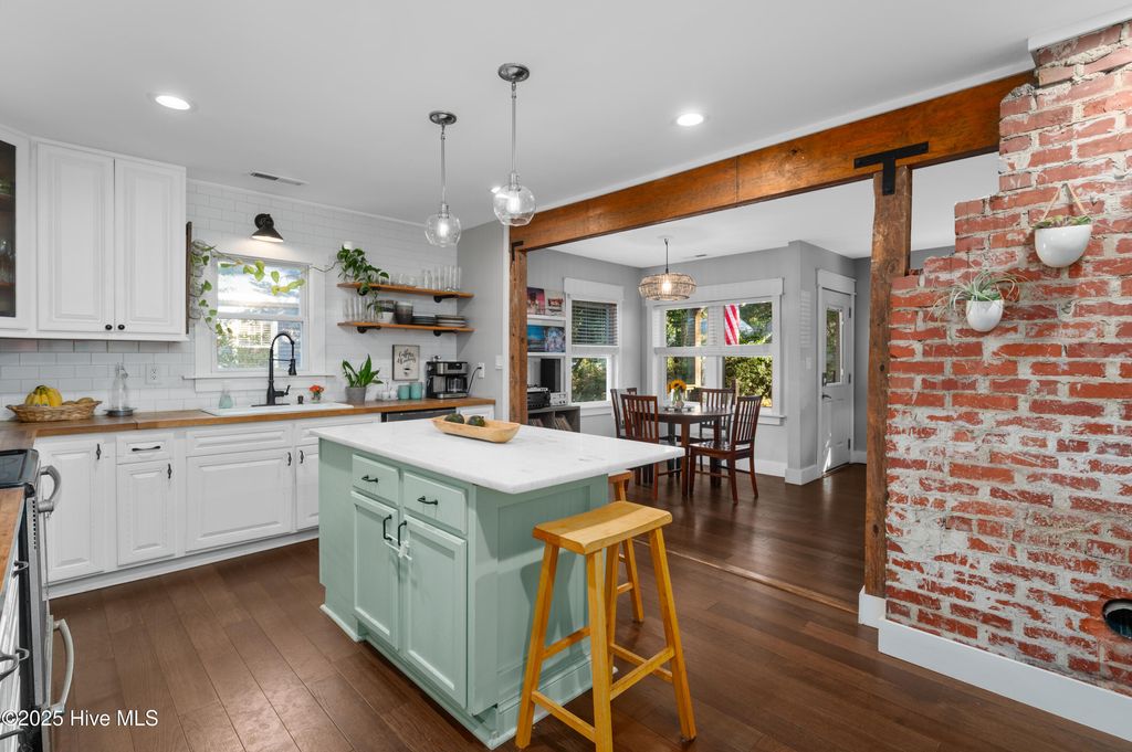 Beautifully updated cottage tucked inside one of Wilmington's most peaceful loop-style neighborhoods. With no through-traffic, a playground at the entrance, and the Cross City Trail just steps away, this location is ideal for morning walks, bike rides, and quick access to the lake or nearby brewery. Inside, the home feels bright and inviting with an open-concept layout, new hardwood floors, and an exposed brick fireplace with a cozy stove insert. The renovated kitchen features butcher block counters, a marble-topped island, and a brand-new refrigerator (2024). The spacious primary suite sits privately at the rear of the home and offers vaulted ceilings, his-and-hers walk-in closets, a large full bathroom, and French doors that lead directly to the screened-in porch. The outdoor spaces truly make this home special. Step into your own backyard oasis featuring a large fenced-in yard, deck, patio, outdoor shower, and multiple areas for relaxing or entertaining. A versatile detached utility building currently used as a gym and storage offers endless potential to transform the space into whatever fits your lifestyle. The property also includes dual driveways for convenient parking and rear access. Major improvements include a new roof (2024) and new water heater (2025), ensuring worry-free living in a move-in ready home just minutes from both downtown Wilmington and Wrightsville Beach.