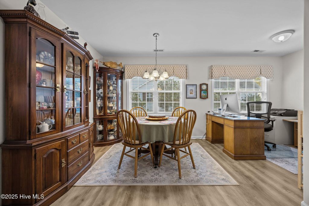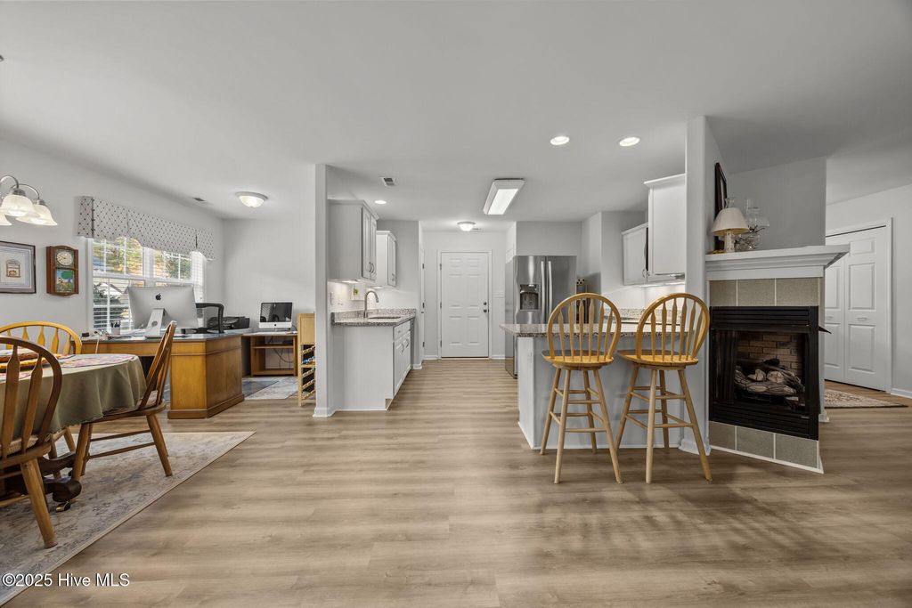 Welcome home to The Villages at Swansboro, a 55+ quaint community located in the desirable ''Friendly City by The Sea''. Upon walking in, you'll notice the spacious open Model G two-bedroom floorplan with over 1,370 heated square feet. To the left of the entryway is the first full bedroom and adjacent bathroom with walk-in shower. The oversized living area can accommodate even the largest of furniture, whether it be a sectional or multi-piece set with recliners. The larger primary bedroom is found off the living area and includes a walk-in closet, en suite bathroom with walk-in shower, and unhindered view to the backyard. On the other side of the home are the dining area, sitting area/formal dining/office space, and kitchen. Whether you're an occasional recreational chef, taste-tester, or pro, the kitchen can satisfy many different skill levels. Boasting TWO pantries, granite countertops, updated cabinetry, a bar top for stools, and stainless-steel appliances, this is perhaps the showstopper of the home! Enjoy the cool Carolina days under the covered front porch or catch up on the latest novel on the serene back deck. The home's gas fireplace has been maintained, and ample heat permeates during those chilly winter evenings to keep you extra cozy. Mature trees provide shade over the backyard so you can listen to the sounds of nature while relaxing and feeling comfortable. Just a short drive away is city center, shopping, grocery stores, restaurants, thrift shops, parks, walking trails, the waterfront of Swansboro and local islands, the hospital, medical practices, and more. New features include fresh paint throughout, new luxury-vinyl plank (LVP) flooring throughout, dishwasher, range, microwave, sink, disposal, gutter guards, garage door hardware (with new motor, key fob, and pad), new HVAC unit, and water heater. With all this new, the only thing missing is you! Call today to schedule a showing!