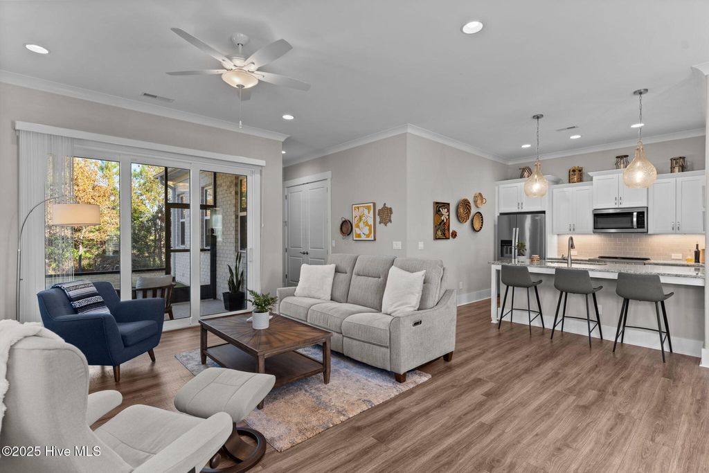 Enjoy low-maintenance living in this beautifully maintained townhome located in the desirable gated community of Whiskey Branch. Built in 2021, this nearly new home offers 1,352 sq ft with 2 bedrooms, 2 full bathrooms, and a cozy screened porch. With the HOA covering all exterior building maintenance and landscaping, you'll enjoy a truly worry-free lifestyle. A charming covered front porch welcomes you inside, where 10-foot ceilings and luxury vinyl plank floors set the tone for the bright, open layout. The kitchen features granite countertops, a subway tile backsplash, stainless steel appliances, a large pantry, and a spacious island overlooking the living room-perfect for everyday living or entertaining guests. The primary suite provides a peaceful retreat with plush carpet, dual closets, and an en suite bath complete with granite counters and a tiled walk-in shower. A comfortable second bedroom and full bath offer ideal space for guests, a home office, or hobbies. Extend your living space outdoors on the private screened porch, ideal for morning coffee, quiet evenings, or relaxed weekend gatherings. The townhome also includes an exterior storage closet for bikes, beach gear, or seasonal items, plus ample parking right out front. Residents of Whiskey Branch enjoy outstanding amenities, including a community pool, clubhouse, sidewalks, and gated access for added privacy and security. All of this in a prime location-less than 2 miles from shopping, dining, and everyday conveniences, and just a short drive to both downtown Wilmington and Carolina Beach. Call today to make this beautiful home yours!