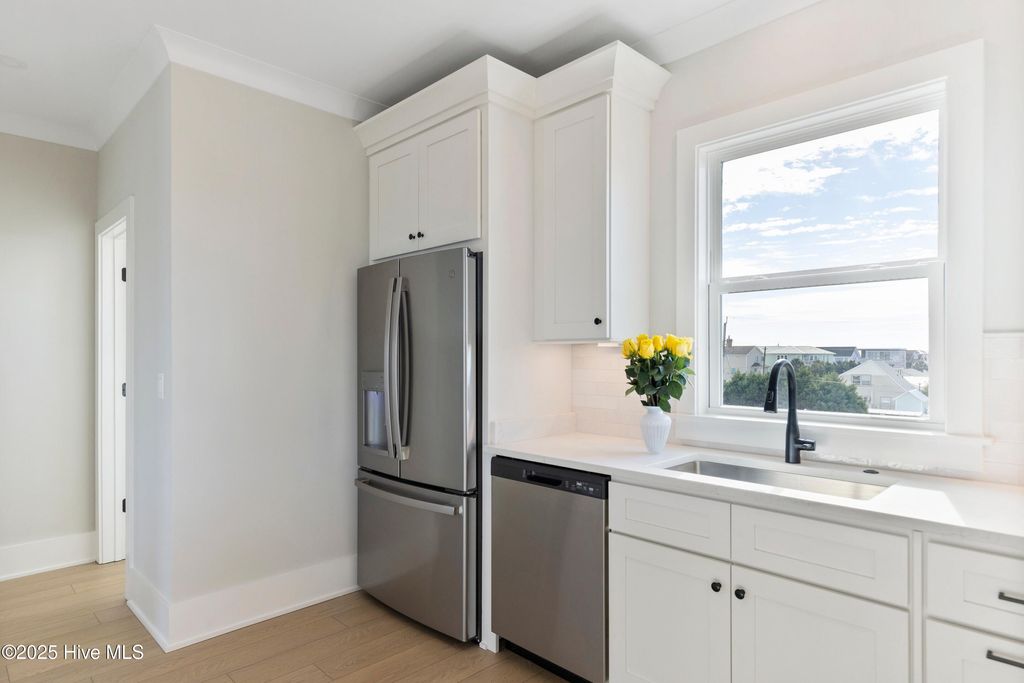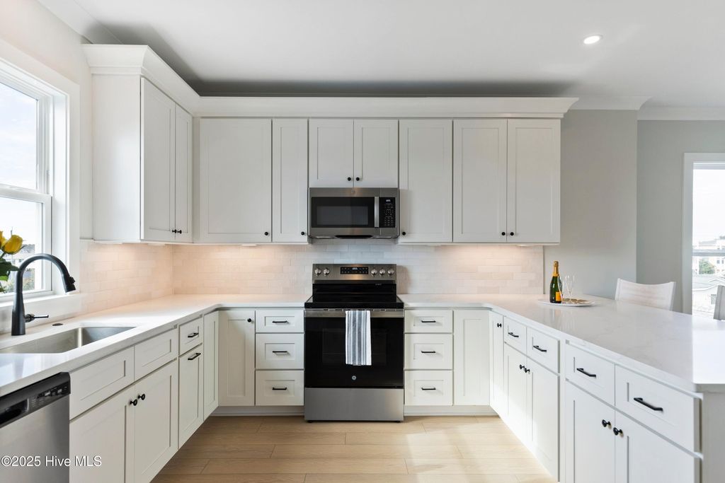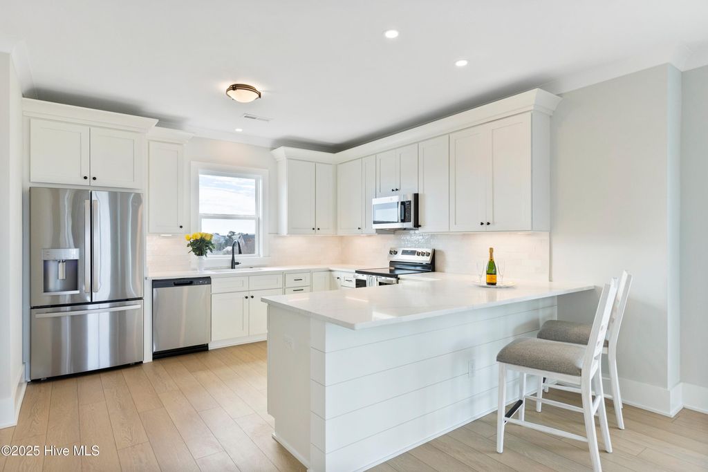 Embrace the coastal lifestyle in this brand-new, low-maintenance home designed for comfort and effortless beach living. Ideal as a primary residence, second home, vacation rental, or snowbird retreat, it's built for coastal resilience with Hardie Plank cement siding, Balau decking, 40-year architectural shingles, and wind-rated windows. Inside, a contemporary yet classic aesthetic features soft coastal paint colors, quartz countertops, sleek stainless steel appliances, crown molding and durable Shaw Polaris LVP floors. The reverse floor plan showcases a spacious, well-equipped kitchen on the top floor, flowing into a large dining area and generous living room with 10-foot tray ceilings opening to a covered deck"”perfect for entertaining. One floor below, you'll find the private primary suite, with a luxurious zero-entry tile shower and it own deck for catching ocean breezes. Two guest rooms share a bath that features a traditional tub, ideal for families with kids or grandkids. The included washer and dryer are conveniently located adjacent to the bedrooms, making laundry a breeze. Abundant storage includes a kitchen pantry, large bedroom closets, and a ground-level storage area for beach gear. An adjacent outdoor shower smooths the ''Après beach'' routine. Located steps from the ocean and two public beach accesses, this home has ample parking with three covered spots and two driveway spaces. Plus there are no HOA dues and flood insurance is optional as the home sits outside the high risk flood zone. Set on a quiet Kure Beach street yet close to the shopping, dining, and attractions of Carolina Beach, plus the island's state parks, boardwalks, marina and piers, this home provides sunrise and sunset views and the laid-back charm of true coastal living. So what are you waiting for? Kick off your flip-flops and relax"”your beach retreat awaits!