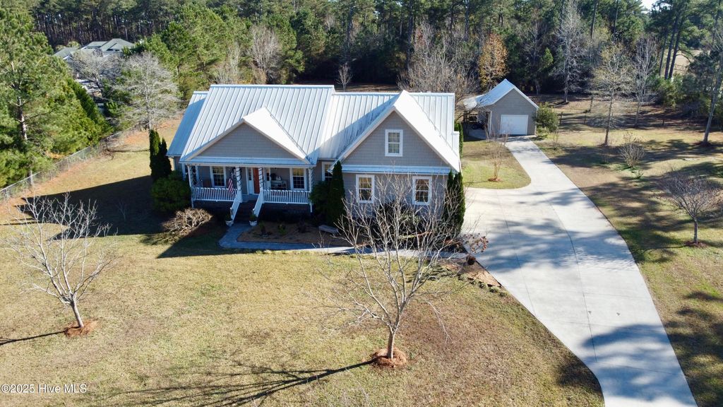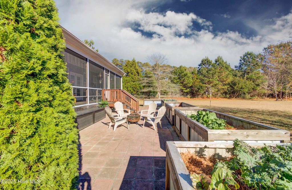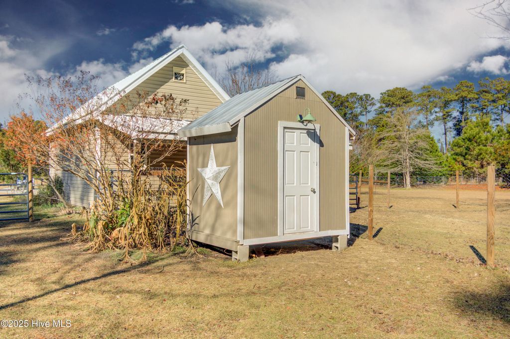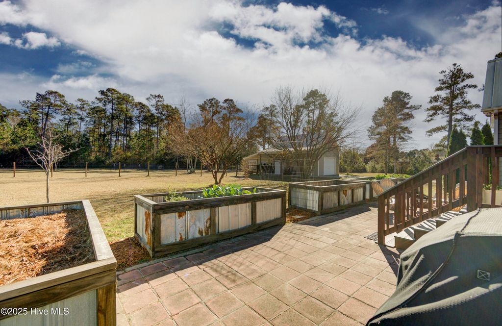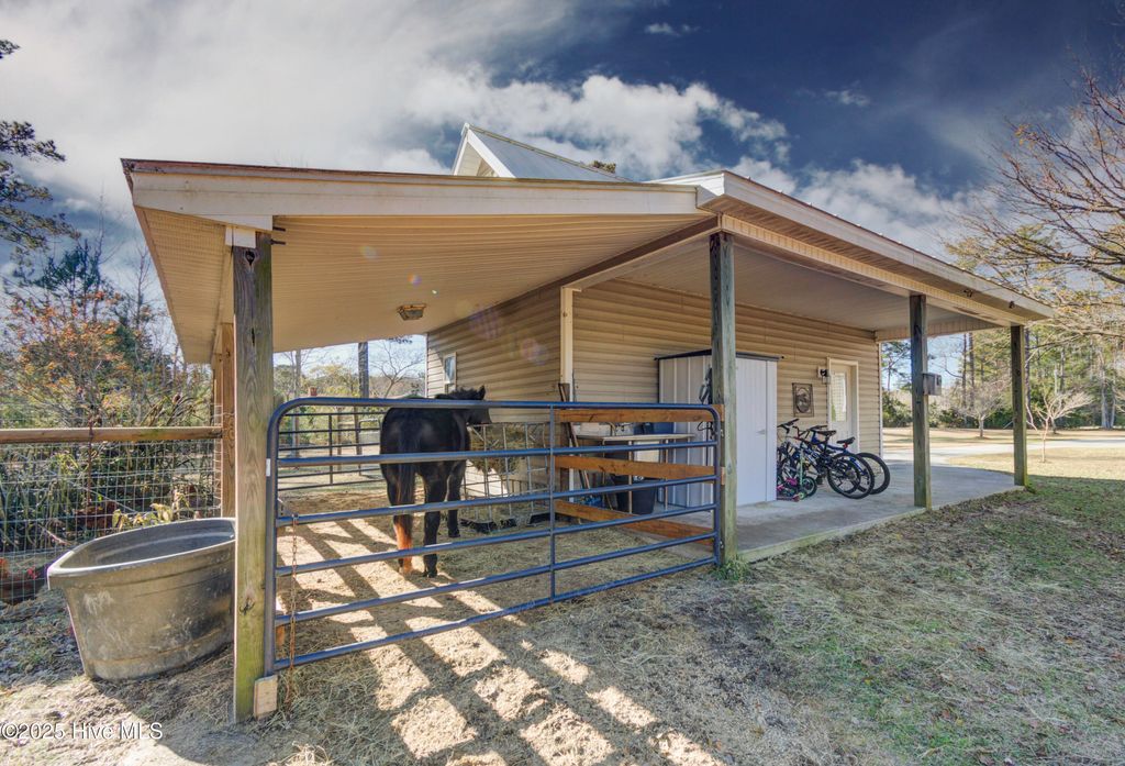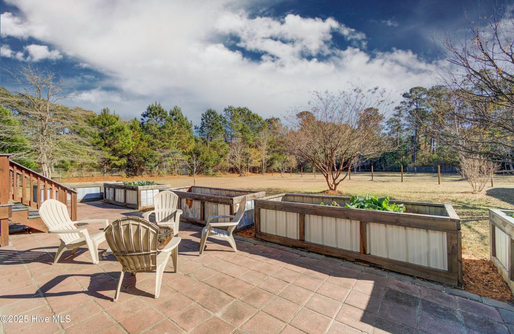 Welcome to 102 Plantation Drive, a rare opportunity to own over 2.5 fully fenced acres just minutes from downtown Swansboro and a short drive to Emerald Isle's beaches. This spacious 3-bedroom home offers more than 2,300 square feet of comfortable living with the added flexibility of a bonus room above the two-car garage, complete with its own cooling zone. Horse-friendly and thoughtfully set up for a variety of uses, the property is fully fenced and cross-fenced, offering plenty of room for animals, gardening, hobbies, or simply enjoying the privacy of the acreage. The home has been well maintained with major upgrades already in place, including a durable metal roof, professionally encapsulated crawl space, tankless water heater, full-house water filtration, UV HVAC enhancement, and a Generac whole-home generator. Inside, you'll find granite counters, bamboo flooring, stainless steel appliances, and an open floor plan centered by a gas fireplace. Outdoor features include large custom raised garden beds, multiple mature fruit and nut trees (fig, pecan, and persimmon), and a detached lofted garage that makes an excellent workshop. A covered stall and matching chicken coop provide additional flexibility for animals or storage. Whether you're enjoying the screened back porch, tending your garden, or taking a peaceful stroll down to the water within the community, this property offers the perfect blend of space, convenience, and coastal charm.