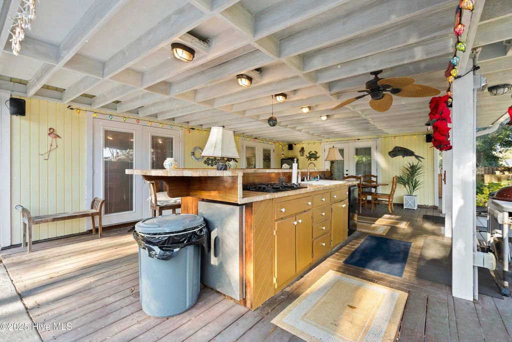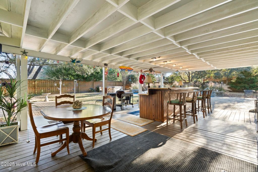 Live the Southern Coastal Lifestyle from this beautifully updated patio style home where warm ocean breezes and everyday relaxation set the tone. Perfectly situated on a nearly half acre of private landscaped grounds. This well maintained property is just a short stroll or golf cart ride to boating access at Marsh Creek Marina and waterfront dining at the Sailfish Restaurant on the Intracoastal Waterway. Inside, the award winning floorplan shines with modern coastal charm. Bamboo flooring, shiplap accents, and vibrant fresh paint create an inviting flow through the living and dining areas. The fully updated kitchen features solid surface counters, designer cabinetry, tile backsplash and a convenient bar pass thru to the dining area. The greatroom exudes a relaxed coastal vibe with its wood slat vaulted ceiling, beadboard trim, sky light and cozy corner gas log fireplace. The master suite includes custom storage cabinetry for added convenience. Step outside to your true coastal oasis - an entertainers dream. Over 600 sqft of covered patio space showcases a custom cypress and mahogany bar with a full outdoor kitchen. Overlooking the refreshing inground pool, the space is made more captivating with a stunning stacked stone triple waterfall and adjoining hot tub for year round enjoyment. Relax under the iconic shade of a 100 year old live oak, lounge on the paver patio or gather around the oyster pit and rotisserie grill for unforgettable evenings. Additional features include a wired workshop, fully privacy fenced, 22KW whole house generator, newer roof and vinyl tilt windows. With no HOA and low county taxes this coastal retreat offers exceptional value and lifestyle convenience.