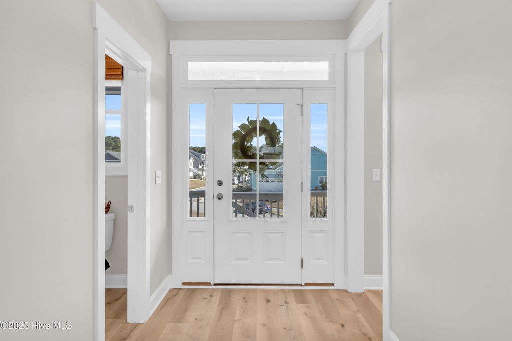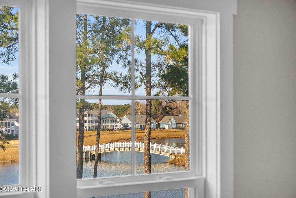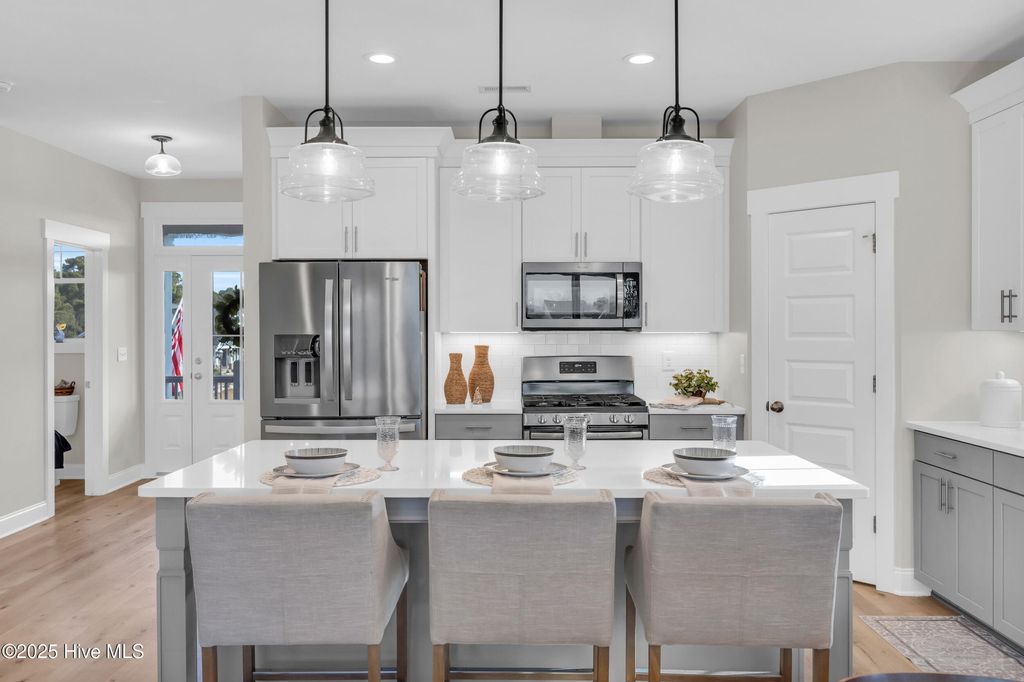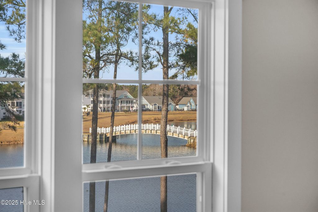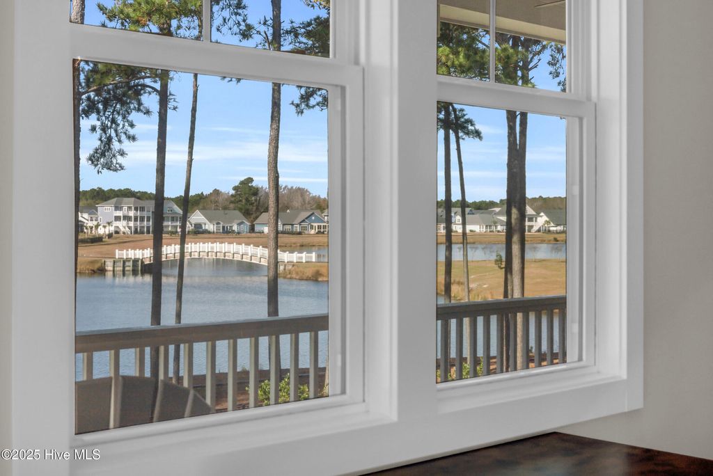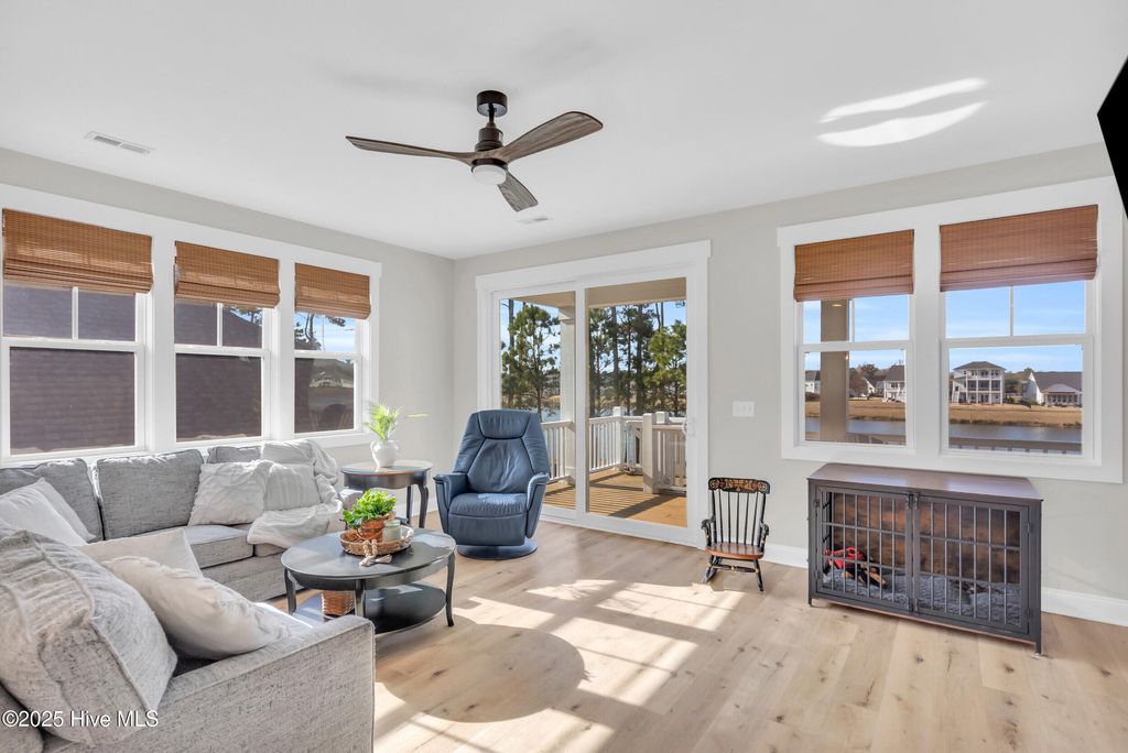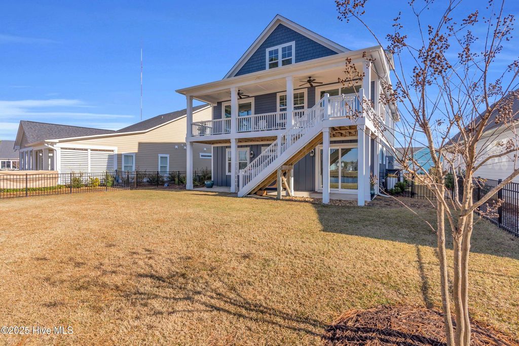 Welcome to sought-after Summerhouse on Everett Bay, where sunsets over Spicer Lake, affectionately known by residents as 'The Big Lake' become part of your daily routine. Perfectly positioned in one of the most coveted settings in the community, this home truly offers one of the best seats in Summerhouse. Built in 2019 by Reeves Custom Homes, this popular and highly functional 4-bedroom, 3.5-bath floorplan delivers curb appeal, thoughtful design, and incredible flexibility for everyday living and entertaining. A welcoming second-level front porch sets the tone, inviting you inside where light-filled living spaces and panoramic lake views immediately draw you in. The heart of the home is the expansive great room, where the kitchen shines with soft grey cabinetry, quartz countertops, a gas range, ample storage, and a walk-in pantry. The generously sized living area features a gas fireplace and sliding doors that open to an expansive deck, the perfect vantage point to soak in the serene lake views and spectacular sunsets Summerhouse is known for. The primary suite is a spacious retreat, complete with deck access, and an ensuite bath offering a soaking tub, glass walk-in shower, dual vanities, and quartz countertops. A convenient laundry room and half bath complete the main living level. The lower level, flanked by two garage bays, offers exceptional versatility with its own entrance, a spacious second living area, bedroom, and full bath making it ideal for guests, multigenerational living, or a private getaway. Sliding doors open to a covered patio and level, fenced backyard overlooking Spicer Lake. Upstairs, you'll find two additional bedrooms and a full bath, providing comfortable accommodations for family or visitors. Additional highlights include LVP flooring, board and batten wainscoting, bamboo roman shades throughout, floored attic storage, and thoughtful upgrades throughout. Living in Summerhouse on Everett Bay means embracing a true coastal lifestyle with resort-style amenities including a spectacular clubhouse, resort pool, fitness center, pickleball courts, playground, walking trails, boat launch, day docks, and secure boat storage all within a vibrant, social waterfront community. A short drive to the pristine beaches of Topsail Island and situated between Wilmington and Jacksonville, NC. More than a home this is the Summerhouse lifestyle at its finest.
