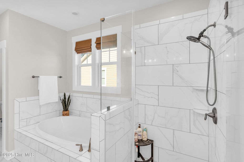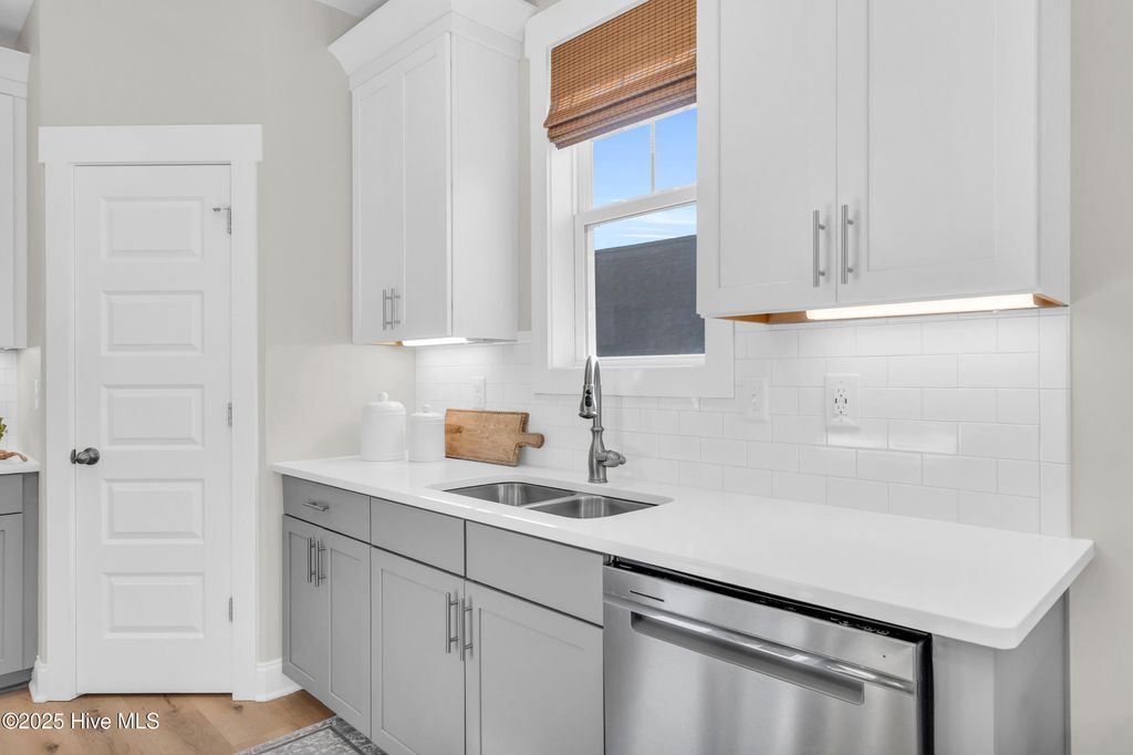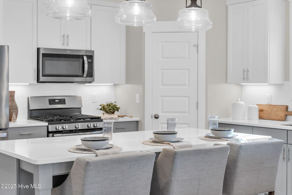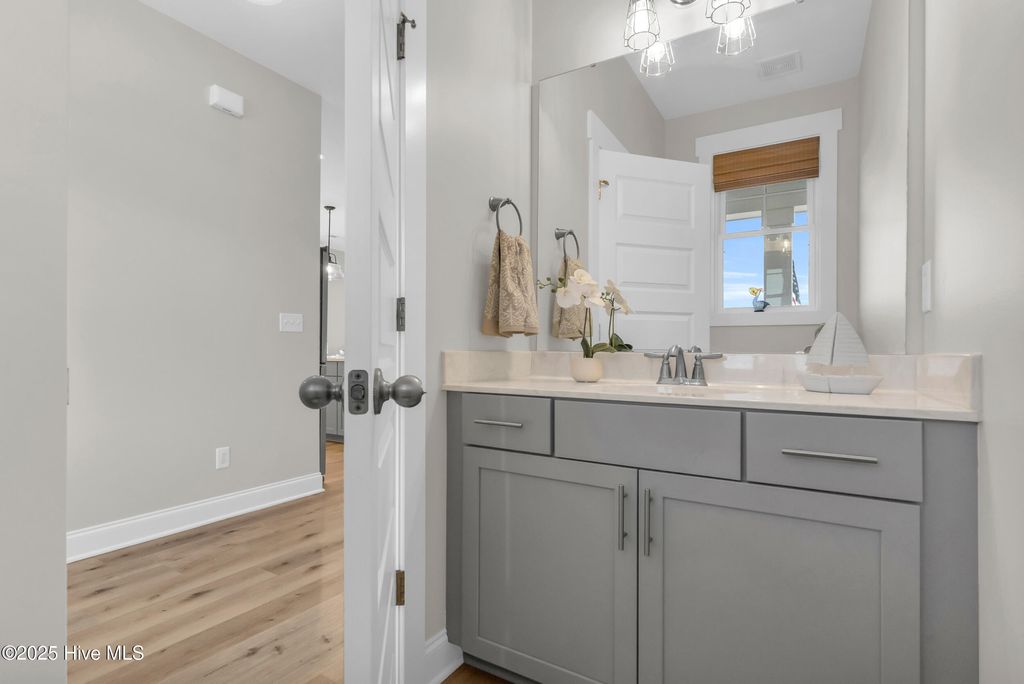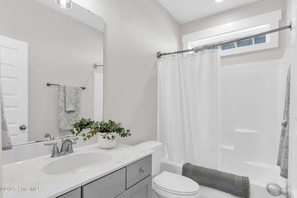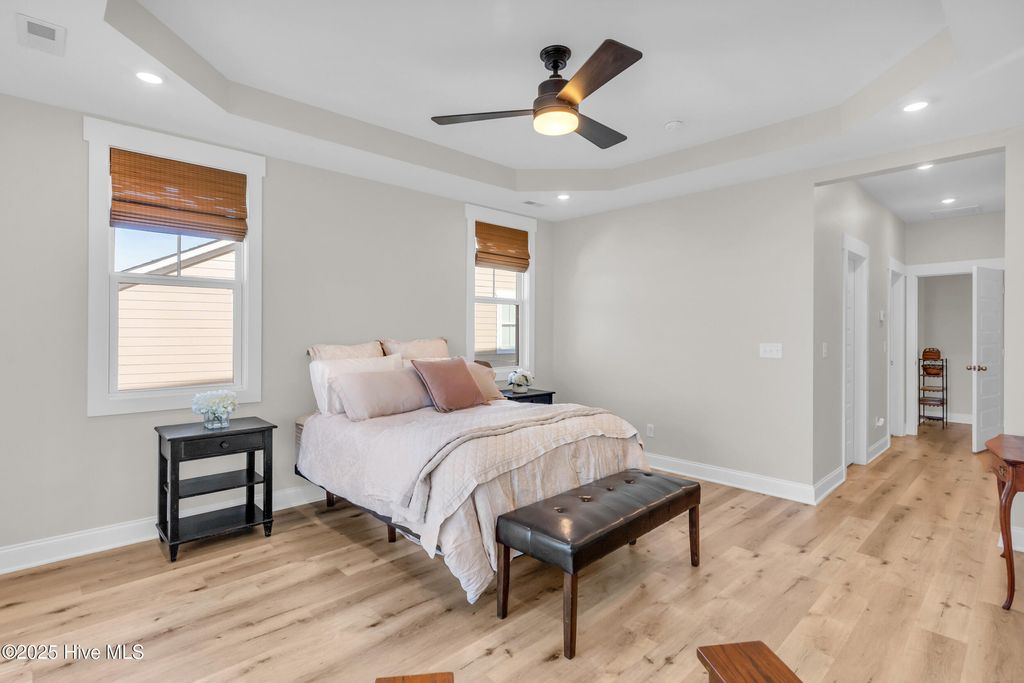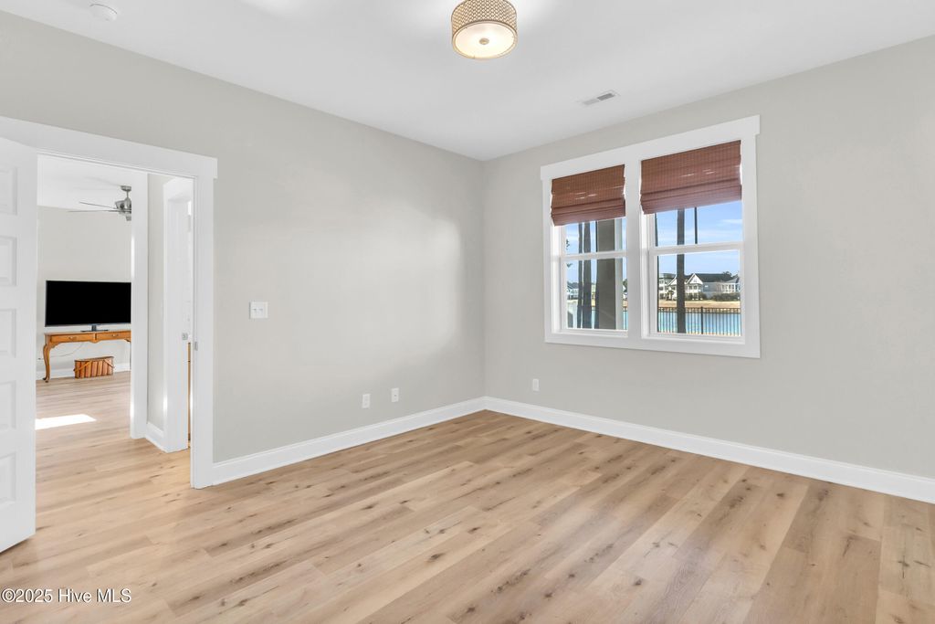 Welcome to sought-after Summerhouse on Everett Bay, where sunsets over Spicer Lake, affectionately known by residents as 'The Big Lake' become part of your daily routine. Perfectly positioned in one of the most coveted settings in the community, this home truly offers one of the best seats in Summerhouse. Built in 2019 by Reeves Custom Homes, this popular and highly functional 4-bedroom, 3.5-bath floorplan delivers curb appeal, thoughtful design, and incredible flexibility for everyday living and entertaining. A welcoming second-level front porch sets the tone, inviting you inside where light-filled living spaces and panoramic lake views immediately draw you in. The heart of the home is the expansive great room, where the kitchen shines with soft grey cabinetry, quartz countertops, a gas range, ample storage, and a walk-in pantry. The generously sized living area features a gas fireplace and sliding doors that open to an expansive deck, the perfect vantage point to soak in the serene lake views and spectacular sunsets Summerhouse is known for. The primary suite is a spacious retreat, complete with deck access, and an ensuite bath offering a soaking tub, glass walk-in shower, dual vanities, and quartz countertops. A convenient laundry room and half bath complete the main living level. The lower level, flanked by two garage bays, offers exceptional versatility with its own entrance, a spacious second living area, bedroom, and full bath making it ideal for guests, multigenerational living, or a private getaway. Sliding doors open to a covered patio and level, fenced backyard overlooking Spicer Lake. Upstairs, you'll find two additional bedrooms and a full bath, providing comfortable accommodations for family or visitors. Additional highlights include LVP flooring, board and batten wainscoting, bamboo roman shades throughout, floored attic storage, and thoughtful upgrades throughout. Living in Summerhouse on Everett Bay means embracing a true coastal lifestyle with resort-style amenities including a spectacular clubhouse, resort pool, fitness center, pickleball courts, playground, walking trails, boat launch, day docks, and secure boat storage all within a vibrant, social waterfront community. A short drive to the pristine beaches of Topsail Island and situated between Wilmington and Jacksonville, NC. More than a home this is the Summerhouse lifestyle at its finest.