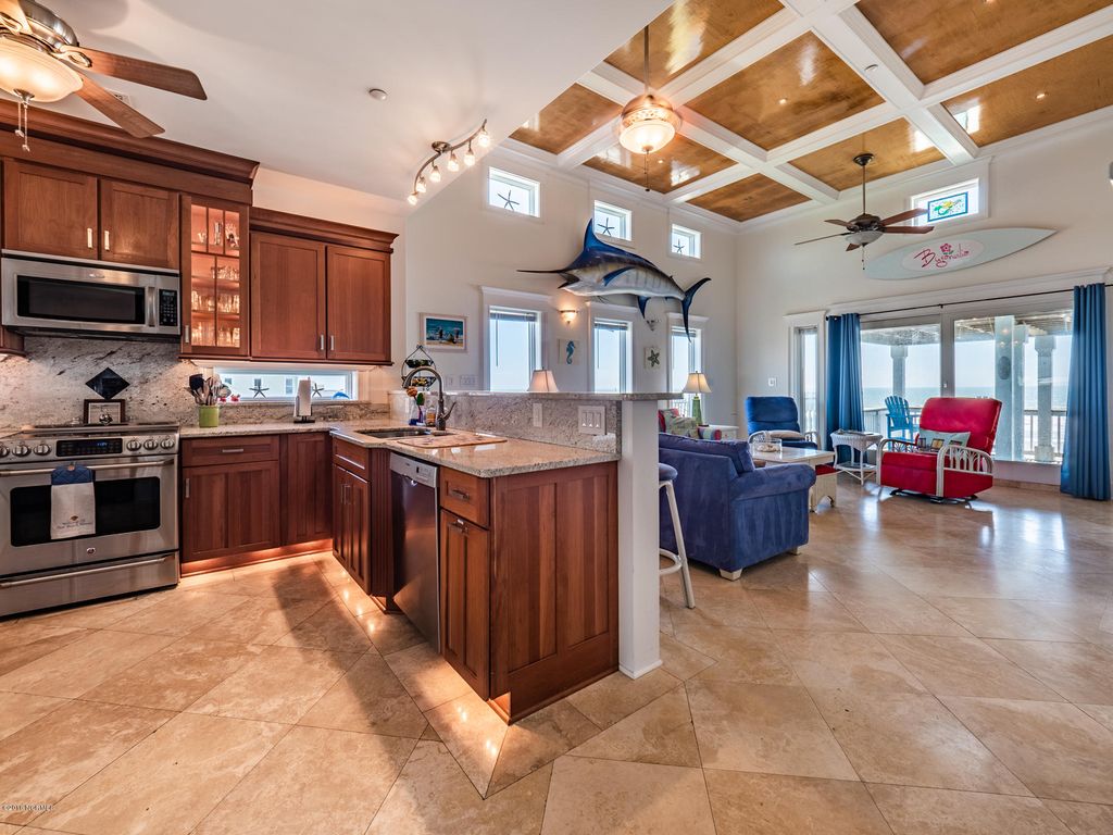 The View is a majestic oceanfront property offering unparalleled views of Topsail Beach! Marble floors greet you as all living is on one level featuring three en suites. Granite counters throughout, stainless appliances, elevator, fireplace, 14 ft coffered ceilings invite you to relax and enjoy. The interior flows onto a generous covered porch facing the Ocean. The private elevator from the garage to the spacious living area assures no steps need be taken to access this beautiful home. While lightly rented, this could be an excellent income producer. The unique shared space on the top level of the building offers a living area, kitchen and half bath, perfect for the extra guests or as a retreat from the main floor. The roof top sundeck is the ideal place to soak in the panoramic views!