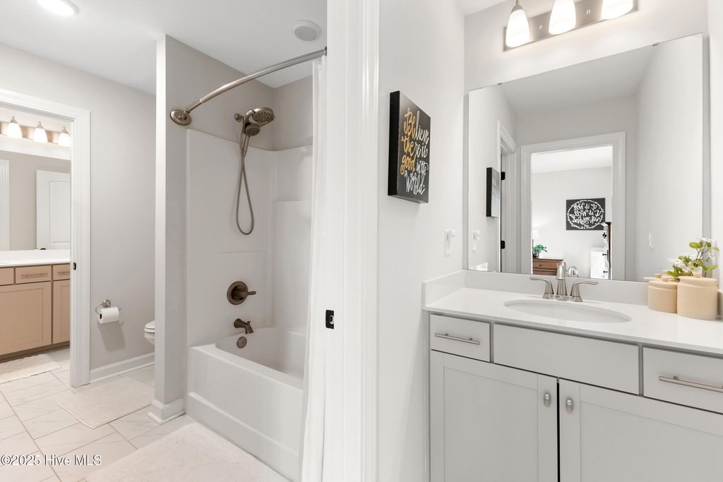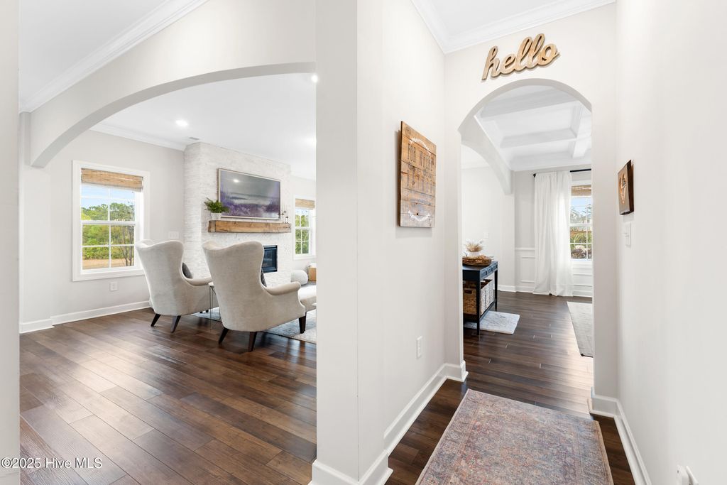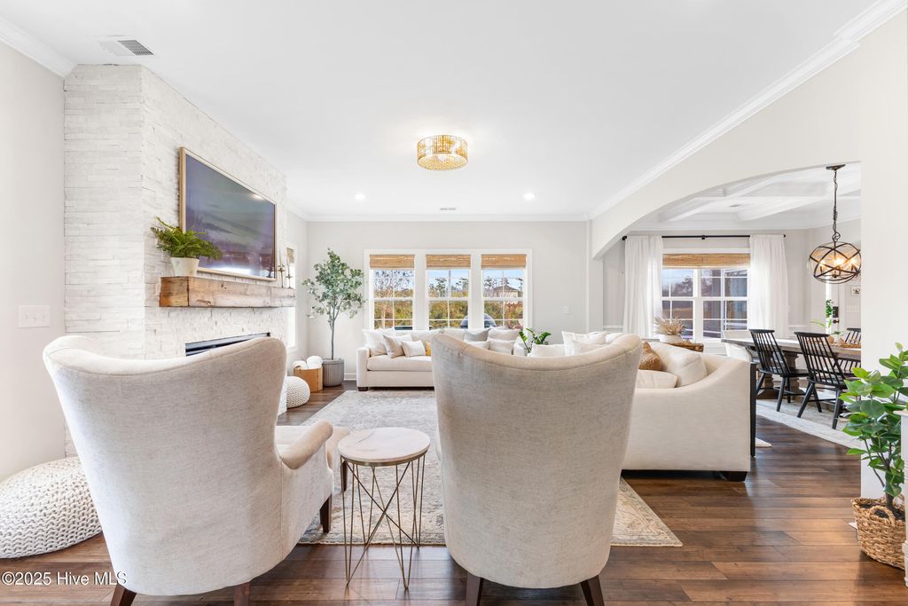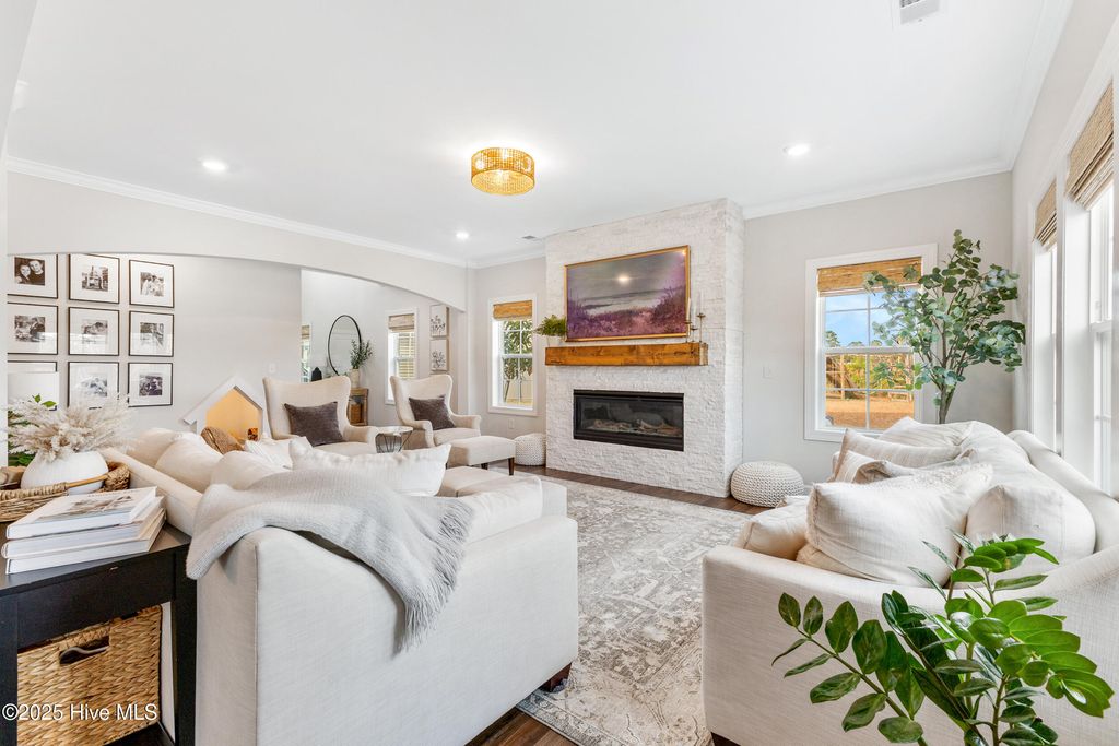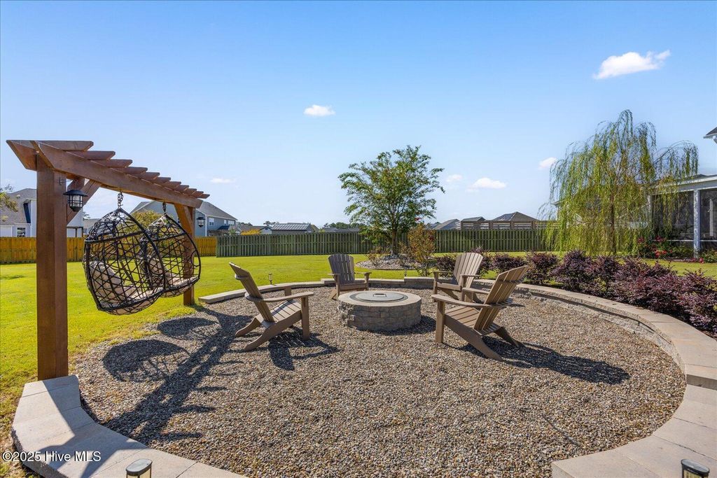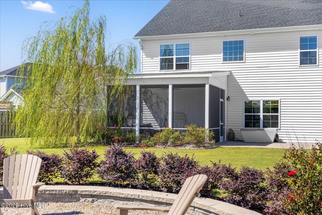 Beautifully updated and meticulously maintained, this 3,448 sq. ft. home features custom professional landscaping, a paver fire-pit patio with swings, a screened in porch, and french doors leading to a family room adjacent to the kitchen. Inside, a bright, welcoming layout flows from the foyer into the living and dining areas and a chef's white kitchen with quartz countertops, quality cabinetry, GE Café fridge, and stainless-steel appliances. The floor plan includes 4 bedrooms, two full and one half baths, an upstairs loft, and a conveniently located laundry room. A three-car garage with epoxy flooring completes the home. Located in Songbird Landing near Kiwanis Park, with quick access to Topsail Beach and the Intracoastal Waterway. Notable upgrades include a custom stone gas fireplace, extended paver patio and fire pit, screened porch addition, full-yard irrigation, landscape lighting, professional landscaping, epoxy garage floors, custom walk-in pantry, closet organizer, garage shelving, GE Café glass-front fridge, and updated blinds.