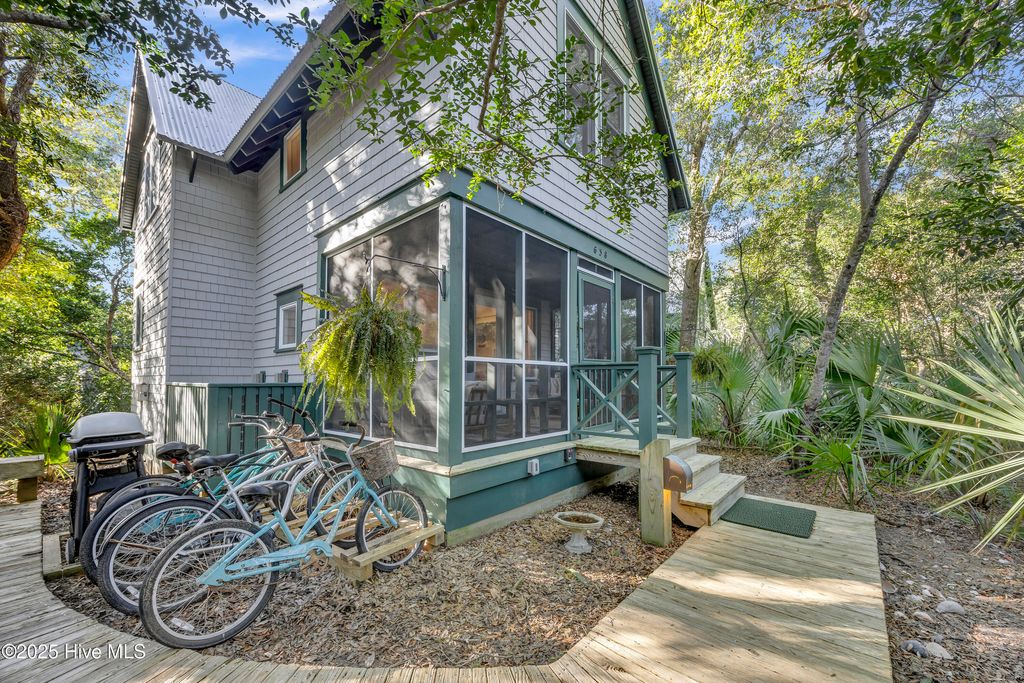 Tucked within the maritime forest and just steps from the sands of East Beach, Surfman's Walk offers a peaceful, intimate setting for classic Bald Head Island living. This charming enclave is known for its quiet streets, pedestrian-friendly design, and easy access to beach boardwalks that wind through live oaks and native palms. Nestled in the heart of Surfman's Walk, 638 Chicamacomico Way presents a relaxed island retreat surrounded by the island's natural beauty. The home blends coastal charm with a comfortable, easy-living floor plan well suited for both everyday enjoyment and island getaways. This is a 3 bedroom, 3 1/2 bath home with two bedrooms in the main house and a third bedroom in the crofter over the garage, giving you an additional 242 square feet. Light-filled living spaces flow effortlessly for entertaining or quiet evenings at home, while inviting porches create exceptional outdoor living, perfect for morning coffee, catching ocean breezes, or unwinding after a day at the beach. The home also includes bikes for exploring the island, and the bedrooms feature added bunk beds to accommodate additional guests, enhancing both flexibility and rental appeal. With convenient access to scenic biking paths, pristine beaches, and the island's many amenities, this location offers both comfort and convenience. Whether you're seeking a primary residence, second home, or investment property, 638 Chicamacomico Way captures the essence of Bald Head Island living, where coastal simplicity and natural tranquility come together just minutes from the shoreline. An Equity Lifestyle Membership to the BHI Club is available for separate purchase.