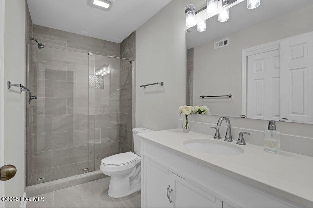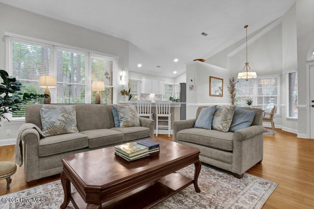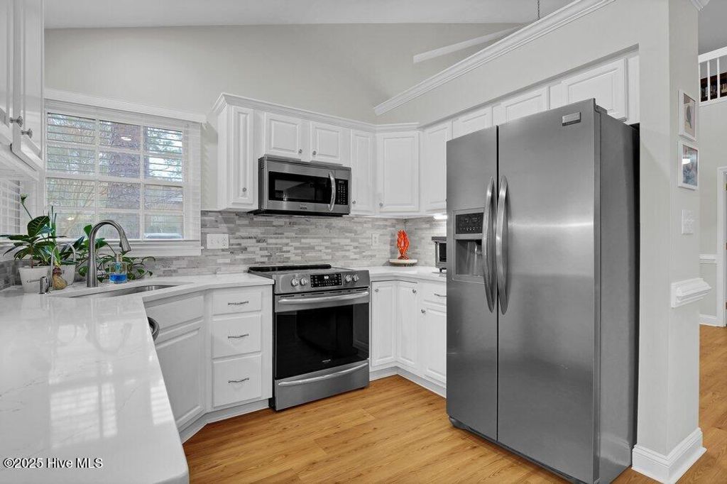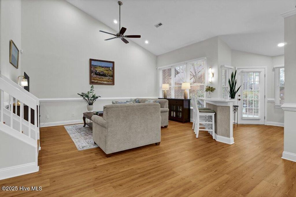 This townhome is located in Jumpin Run, a community known for its mature landscaping and established tree canopy. The brick exterior offers inviting curb appeal with a welcoming walkway, azaleas, and shaded surroundings. Across from the unit is a landscaped circular green space featuring crepe myrtles, layered plantings, and a central water fountain that adds visual interest to the street. Inside, the home includes three bedrooms, three bathrooms, and a one-car attached garage. The open floor plan is finished with updated warm-toned luxury vinyl flooring with wood-grain detail throughout the main living areas and bedrooms, along with updated tile flooring in two bathrooms. The kitchen, primary bathroom, and second bathroom were renovated in 2020. The kitchen features quartz countertops, white cabinetry, stainless steel appliances, and a linear mosaic tile backsplash. Vaulted ceilings in the living and dining areas create a bright, open feel. The primary suite and second bedroom are located on the first floor. The primary suite includes vaulted ceilings, large windows with a built-in bench, an oversized single vanity, and a tiled shower with a frameless glass door. The second first-floor bathroom also features an updated walk-in tiled shower and vanity. Just outside the primary suite is a laundry closet and spacious linen closet, along with convenient access to the garage, making it easy to shed dirty outerwear before entering the rest of the home. Upstairs, the loft works well as a third bedroom with a walk-in closet, attached bathroom, and access to a walk-in attic. A private rear courtyard includes garden beds and space for outdoor dining. Jumpin Run includes a community pool and clubhouse and is so well tucked away off 17th Street that many people don't realize the community is there, while still offering easy access to the hospital, medical offices, shopping, and dining.