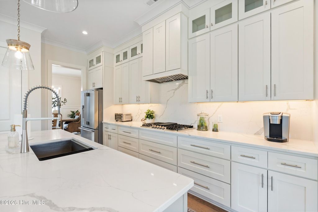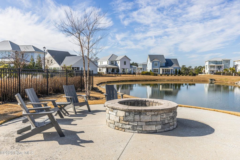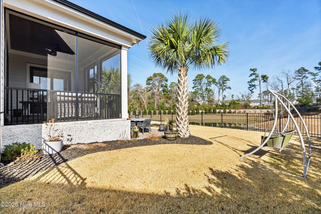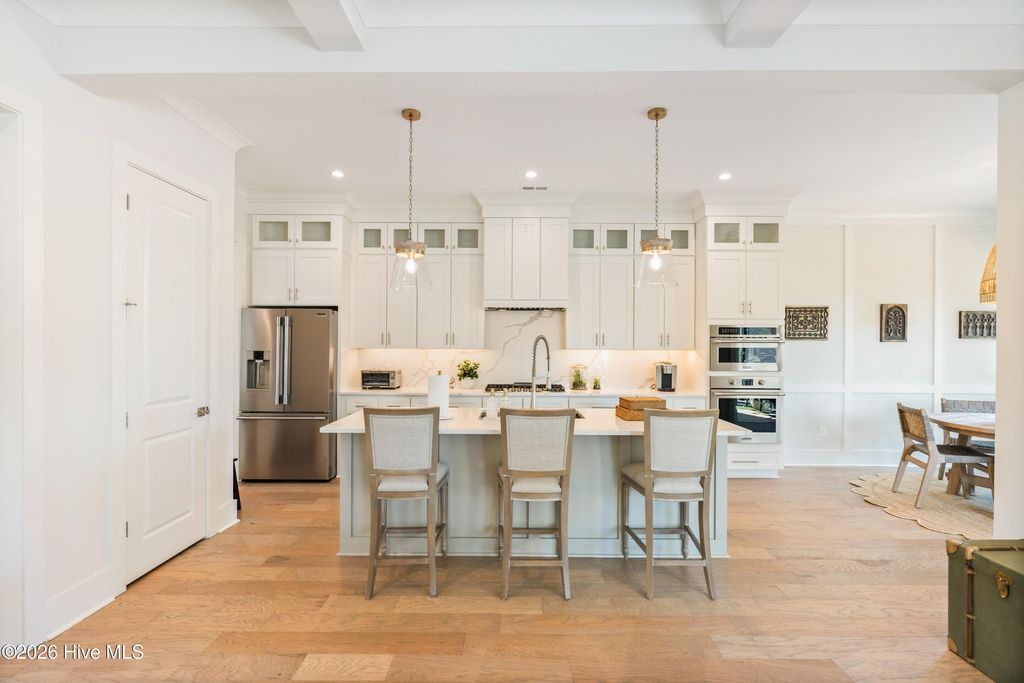 Nestled in the charming community of Waterstone, this stunning 4-bedroom, 4 full-bath home offers exceptional space, elegance, and thoughtful design. From the moment you arrive, the stone rocking chair front porch sets a welcoming tone and hints at the beauty within. Inside, the open dining room comfortably accommodates a large table, perfect for hosting dinner parties or can easily function as a home office or study if a formal dining space isn't needed. The great room is equally impressive, featuring custom wood beams, built-ins surrounding the fireplace, and a sliding glass door that fills the space with natural light. The chef's dream kitchen is designed for both style and function, showcasing stainless steel appliances including a built-in wall oven and microwave, a 36'' gas cooktop, stunning quartz countertops and backsplash, abundant counter space, and a large island that serves as the heart of the home, ideal for cooking, gathering, and entertaining. From the kitchen nook or great room, step outside to the upgraded stone patio and screened-in back porch overlooking a serene pond with a fountain. It's the perfect way to unwind and the added privacy from the trees around the pond are an added bonus. The first-floor primary suite offers the ease of single-level living. The spacious bedroom features a tray ceiling, a custom wood accent wall, along with dual closets, one walk-in and another generously sized secondary closet ideal for extra storage. The ensuite bathroom is thoughtfully designed with a tiled zero-entry walk-in shower, double vanity, modern fixtures, and a private water closet. Throughout the main level, 10-foot ceilings, 8-foot interior doors, custom accent walls, and wood flooring create a spacious and elegant atmosphere. Beyond the laundry room and convenient landing-zone bench, the upstairs bedroom with a full bathroom offers incredible versatility. With ample space and a built-in bench, it can easily serve as a bedroom, cozy lounge, home