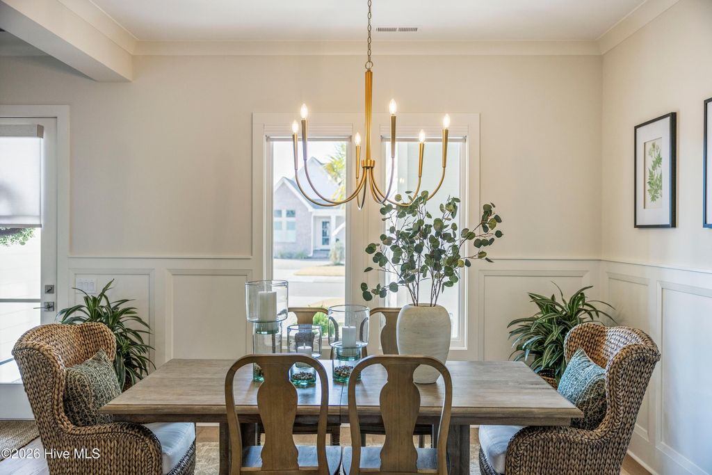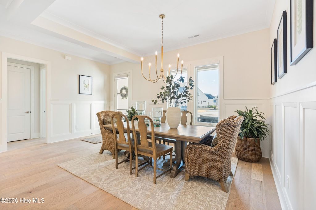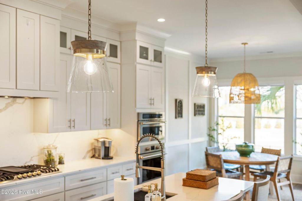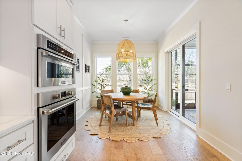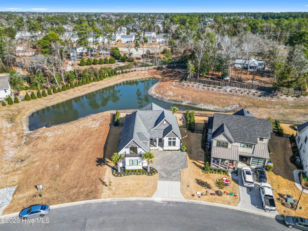 Nestled in the charming community of Waterstone, this stunning 4-bedroom, 4 full-bath home offers exceptional space, elegance, and thoughtful design. From the moment you arrive, the stone rocking chair front porch sets a welcoming tone and hints at the beauty within. Inside, the open dining room comfortably accommodates a large table, perfect for hosting dinner parties or can easily function as a home office or study if a formal dining space isn't needed. The great room is equally impressive, featuring custom wood beams, built-ins surrounding the fireplace, and a sliding glass door that fills the space with natural light. The chef's dream kitchen is designed for both style and function, showcasing stainless steel appliances including a built-in wall oven and microwave, a 36'' gas cooktop, stunning quartz countertops and backsplash, abundant counter space, and a large island that serves as the heart of the home, ideal for cooking, gathering, and entertaining. From the kitchen nook or great room, step outside to the upgraded stone patio and screened-in back porch overlooking a serene pond with a fountain. It's the perfect way to unwind and the added privacy from the trees around the pond are an added bonus. The first-floor primary suite offers the ease of single-level living. The spacious bedroom features a tray ceiling, a custom wood accent wall, along with dual closets, one walk-in and another generously sized secondary closet ideal for extra storage. The ensuite bathroom is thoughtfully designed with a tiled zero-entry walk-in shower, double vanity, modern fixtures, and a private water closet. Throughout the main level, 10-foot ceilings, 8-foot interior doors, custom accent walls, and wood flooring create a spacious and elegant atmosphere. Beyond the laundry room and convenient landing-zone bench, the upstairs bedroom with a full bathroom offers incredible versatility. With ample space and a built-in bench, it can easily serve as a bedroom, cozy lounge, home