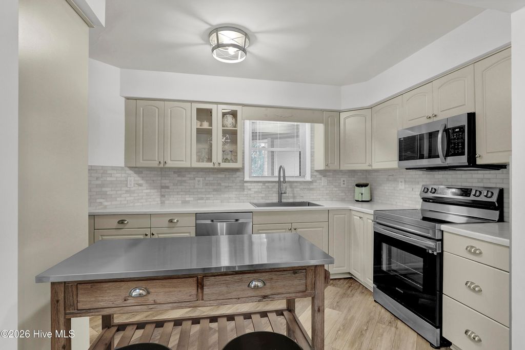 This FULLY-FURNISHED END-UNIT feels more like a ranch-style house than a condo! GOLF-COURSE FRONT, 1st-FLOOR LIVING, POND-FRONT, private with no one above you, the home is updated and modern, with GORGEOUS-KITCHEN, LVP and tile flooring, quality-furniture, FINISHED-SUNROOM, STEP-IN TILE SHOWER, with floored attic and exterior storage space! Low maintenance, with yard/exterior and most insurances maintained by HOA. 11-Miles to SURF CITY/TOPSAIL ISLAND BEACHES, PLUS 1-block from IRONCLAD 18-HOLE GOLF COURSE and Driving Range, Shaka Taco, Beer Garden with TV's and live music, Cornhole, Pickleball, Farmers Market, and adjacent to the Greenway leading to Kiwanis Park rec fields and playgrounds!