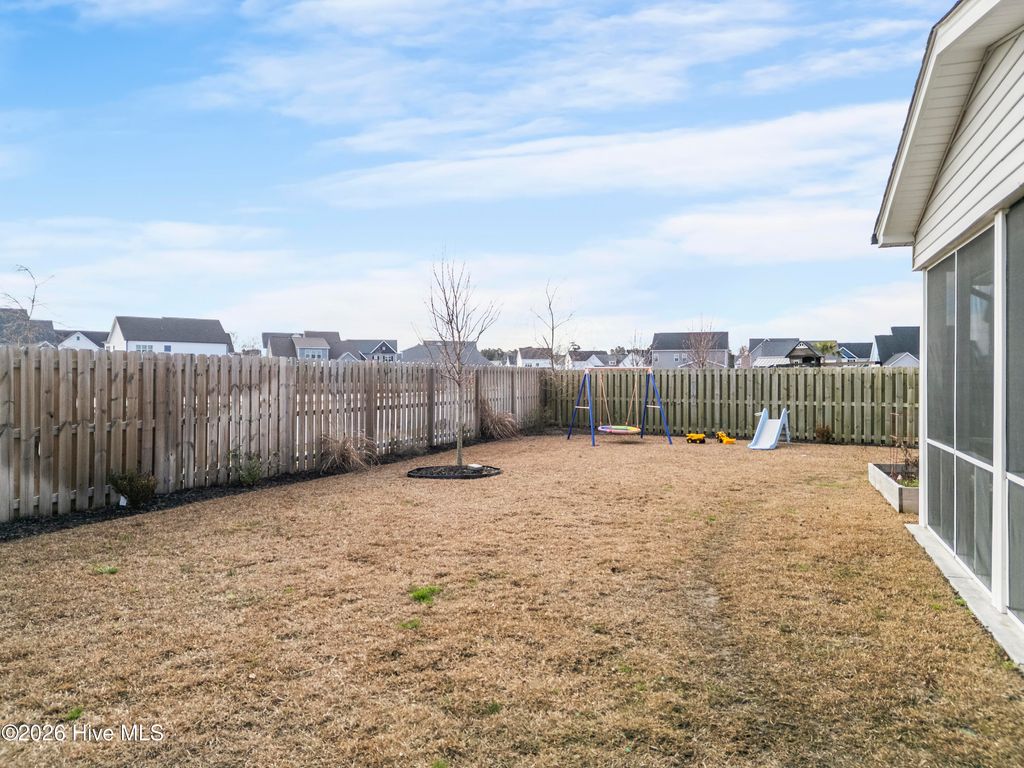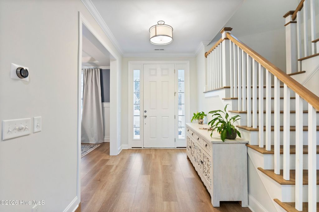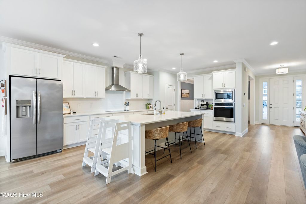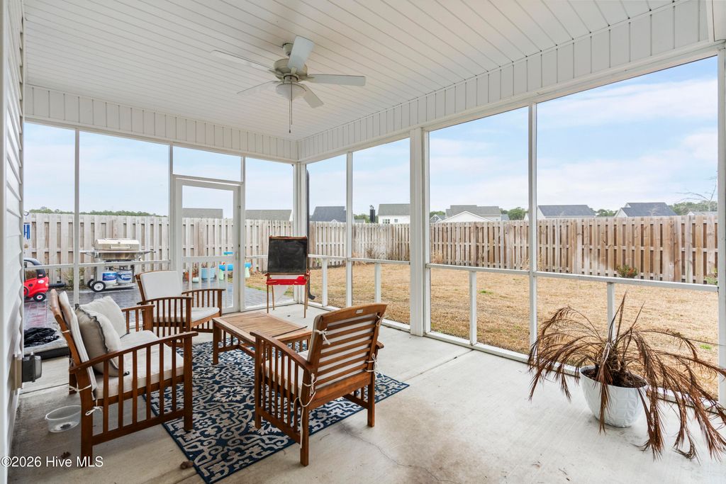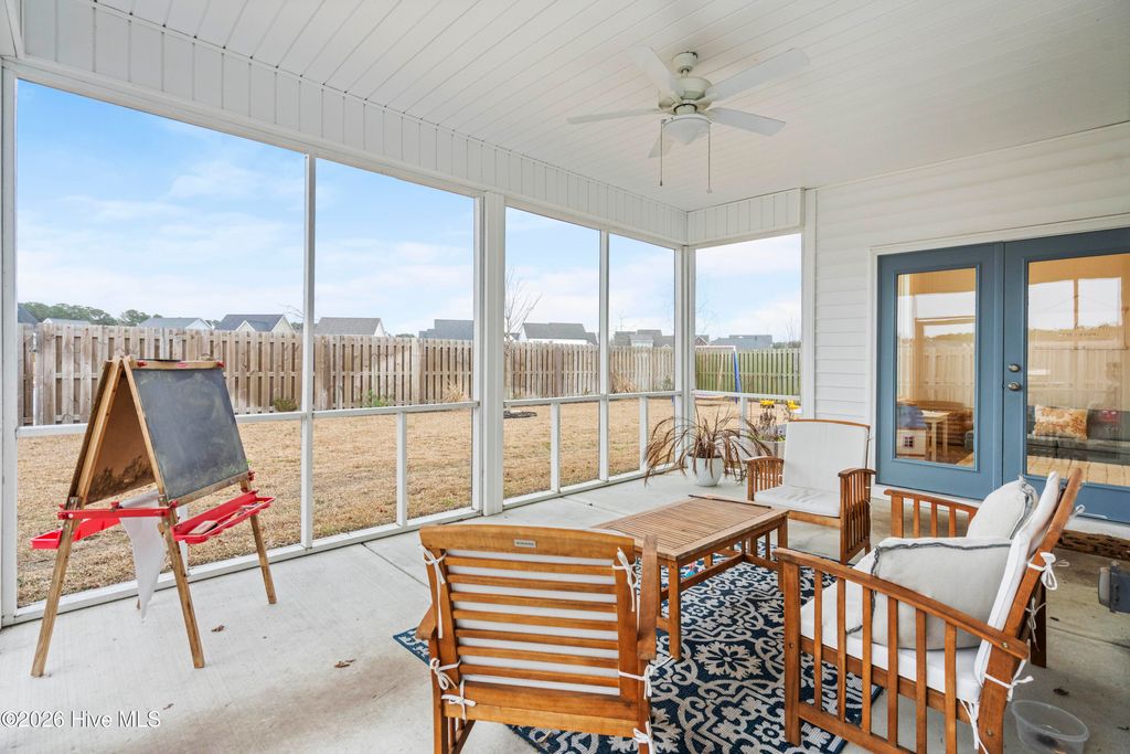 Upon arrival, the home is situated beside a neighborhood pond, offering a sense of privacy and a peaceful setting. The exterior features an inviting front porch and a screened-in rear porch with an extended patio and wooden fenced backyard, providing excellent outdoor living and entertaining space. The main level is thoughtfully designed and well maintained. It includes a guest bedroom (Bedroom #5) with a full bathroom, ideal for visitors or multi-generational living. The open staircase allows for ample natural light and leads to the upper level, where the majority of the bedrooms are located. Upstairs, to the left at the top of the stairs, is the FROG/Bedroom #5 with its own full bath. Adjacent is a dedicated office with glass French doors. The rear portion of the upper level is devoted to the primary suite, offering privacy from the other bedrooms. The primary suite includes a spacious bathroom and an oversized walk-in closet. The laundry room is also located upstairs for convenience. The main living areas feature an open and functional floor plan. The kitchen offers generous counter space, a long center island suitable for meal preparation or casual seating, and a breakfast nook with direct access to the screened-in porch. The living room is spacious enough for both entertaining and everyday living. A designated drop zone is located just inside the entry from the garage, providing space for coats, shoes, and daily essentials. Overall, the home offers a well-planned layout with flexible living spaces, abundant natural light, and indoor-outdoor flow, making it suitable for a variety of lifestyles.