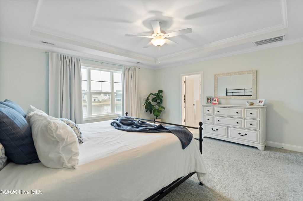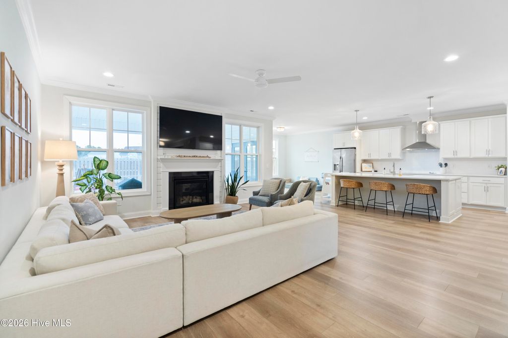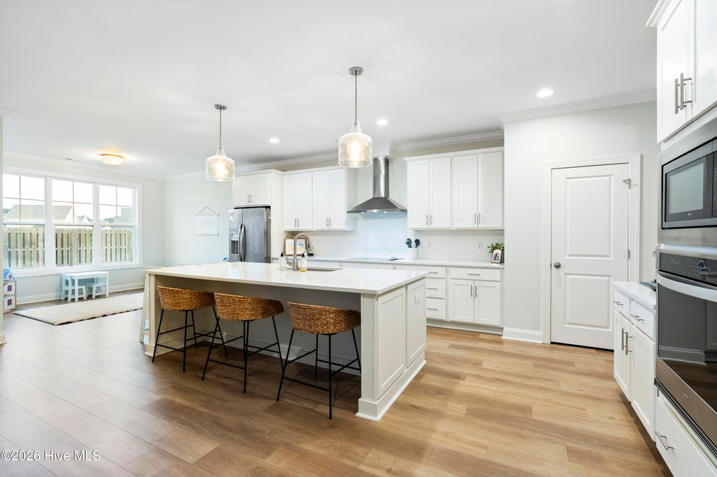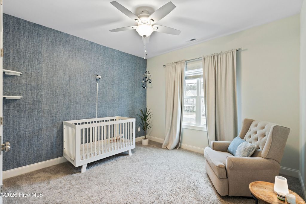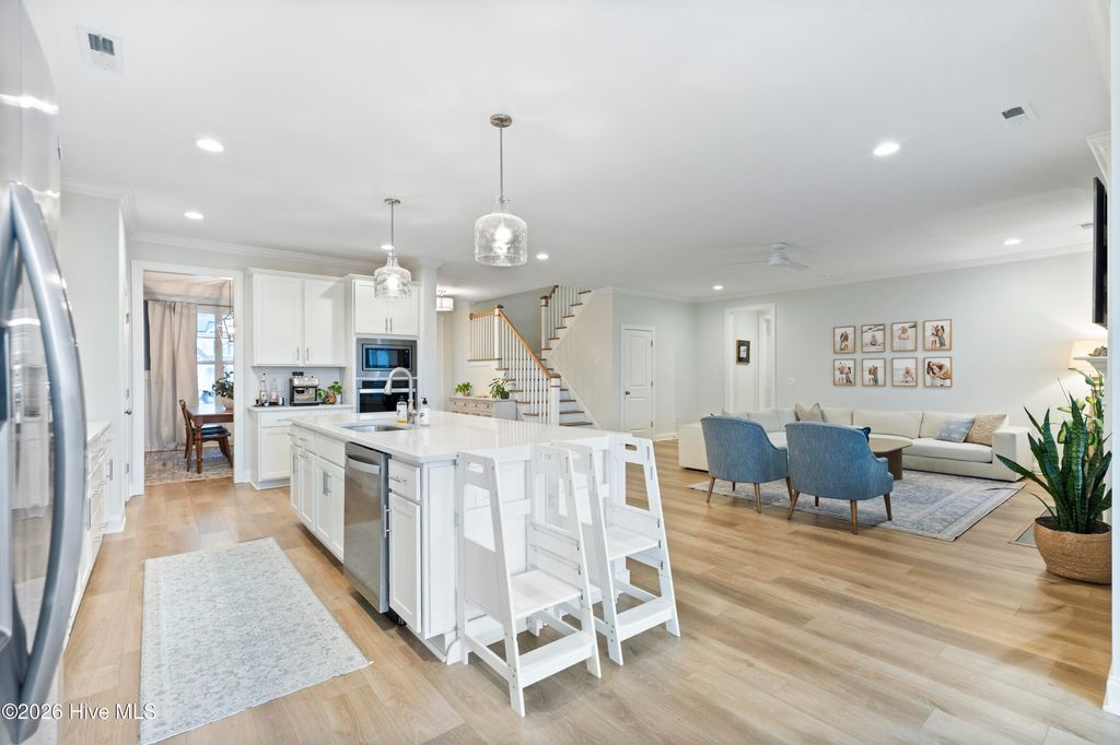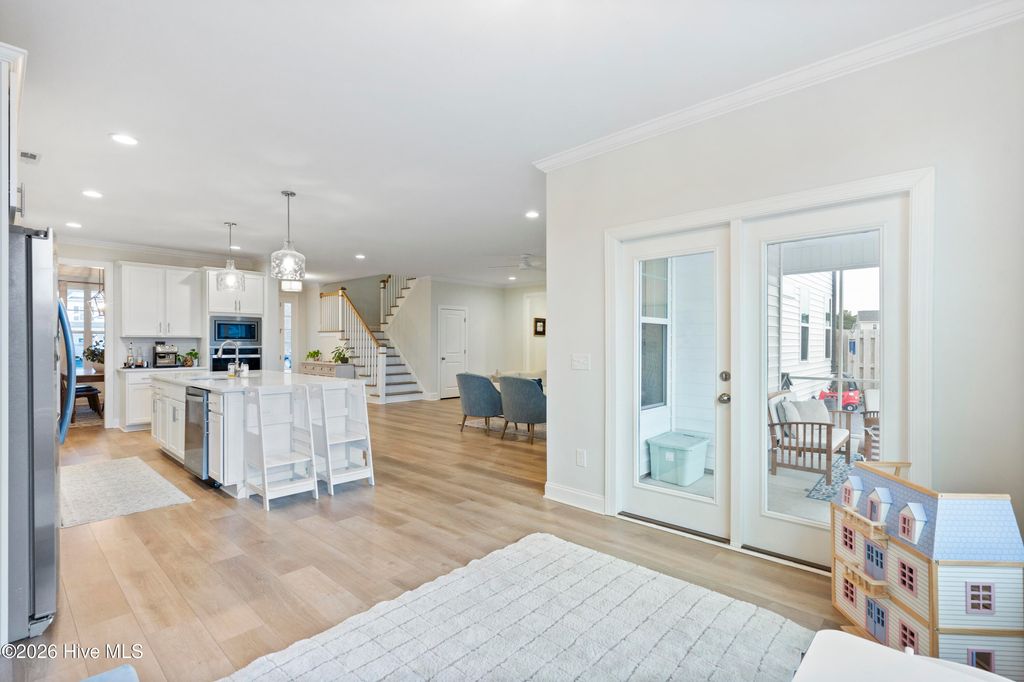 Upon arrival, the home is situated beside a neighborhood pond, offering a sense of privacy and a peaceful setting. The exterior features an inviting front porch and a screened-in rear porch with an extended patio and wooden fenced backyard, providing excellent outdoor living and entertaining space. The main level is thoughtfully designed and well maintained. It includes a guest bedroom (Bedroom #5) with a full bathroom, ideal for visitors or multi-generational living. The open staircase allows for ample natural light and leads to the upper level, where the majority of the bedrooms are located. Upstairs, to the left at the top of the stairs, is the FROG/Bedroom #5 with its own full bath. Adjacent is a dedicated office with glass French doors. The rear portion of the upper level is devoted to the primary suite, offering privacy from the other bedrooms. The primary suite includes a spacious bathroom and an oversized walk-in closet. The laundry room is also located upstairs for convenience. The main living areas feature an open and functional floor plan. The kitchen offers generous counter space, a long center island suitable for meal preparation or casual seating, and a breakfast nook with direct access to the screened-in porch. The living room is spacious enough for both entertaining and everyday living. A designated drop zone is located just inside the entry from the garage, providing space for coats, shoes, and daily essentials. Overall, the home offers a well-planned layout with flexible living spaces, abundant natural light, and indoor-outdoor flow, making it suitable for a variety of lifestyles.
