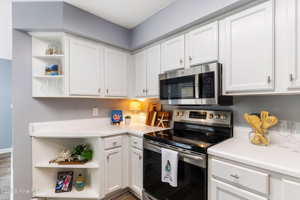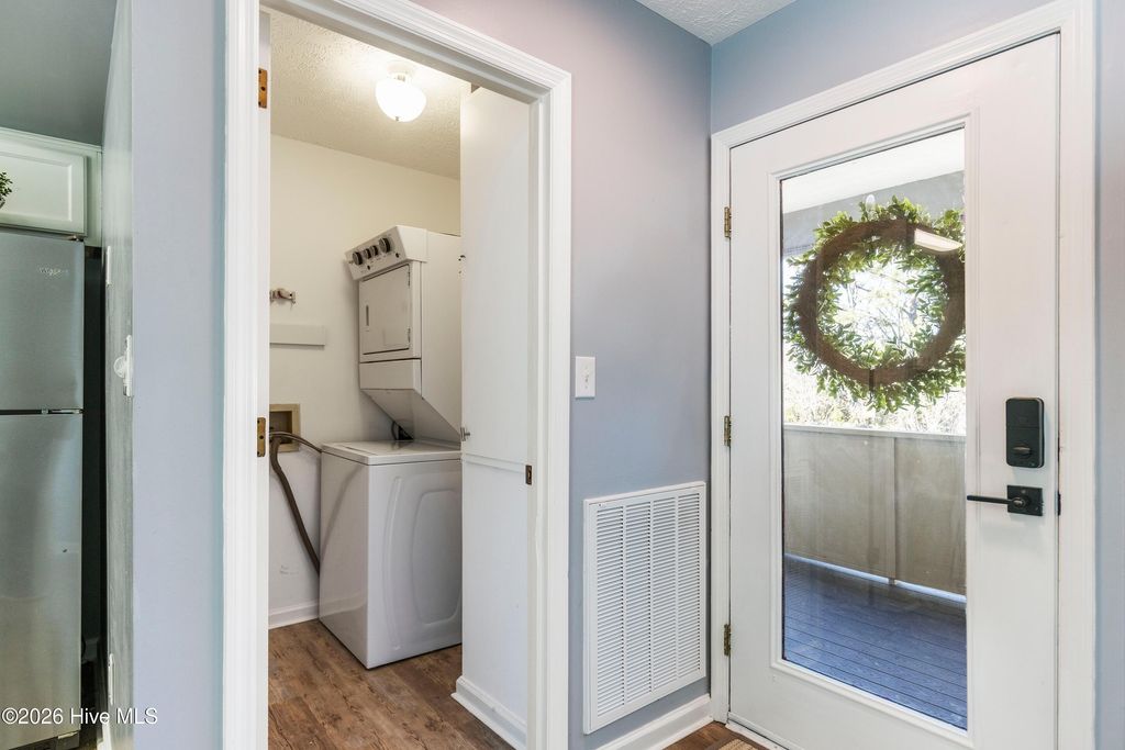 Welcome to this beautifully updated 2 bedroom, 2 bathroom condo offering relaxed coastal living in the heart of Wilmington. The open-concept layout features a spacious living area with a modern ceiling fan and a dining area highlighted by a stylish glass chandelier, all complemented by coastal paint colors and durable LVP flooring throughout. The kitchen is both functional and inviting, featuring white cabinetry, stainless steel appliances"”including refrigerator, range, dishwasher, and built-in microwave"”and plenty of counter space for cooking and entertaining. The primary bedroom offers a private bathroom and generous closet space, while the second bedroom is perfect for guests, a home office, or flex space. Both bathrooms have been refreshed with new vanity lighting. Additional highlights include an in-unit laundry room with a stackable washer and dryer, a private storage room located just outside the unit, and a private balcony overlooking peaceful tree views. Ideally located close to beaches, shopping, dining, historic downtown Wilmington, and Novant Regional Medical Center. A one-year home warranty is included for added peace of mind.