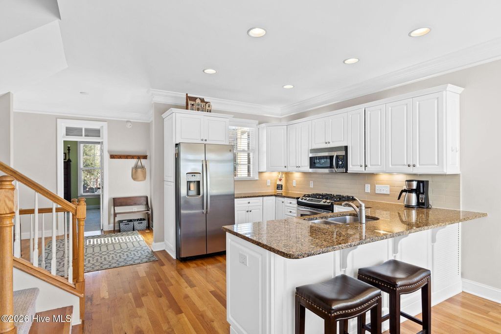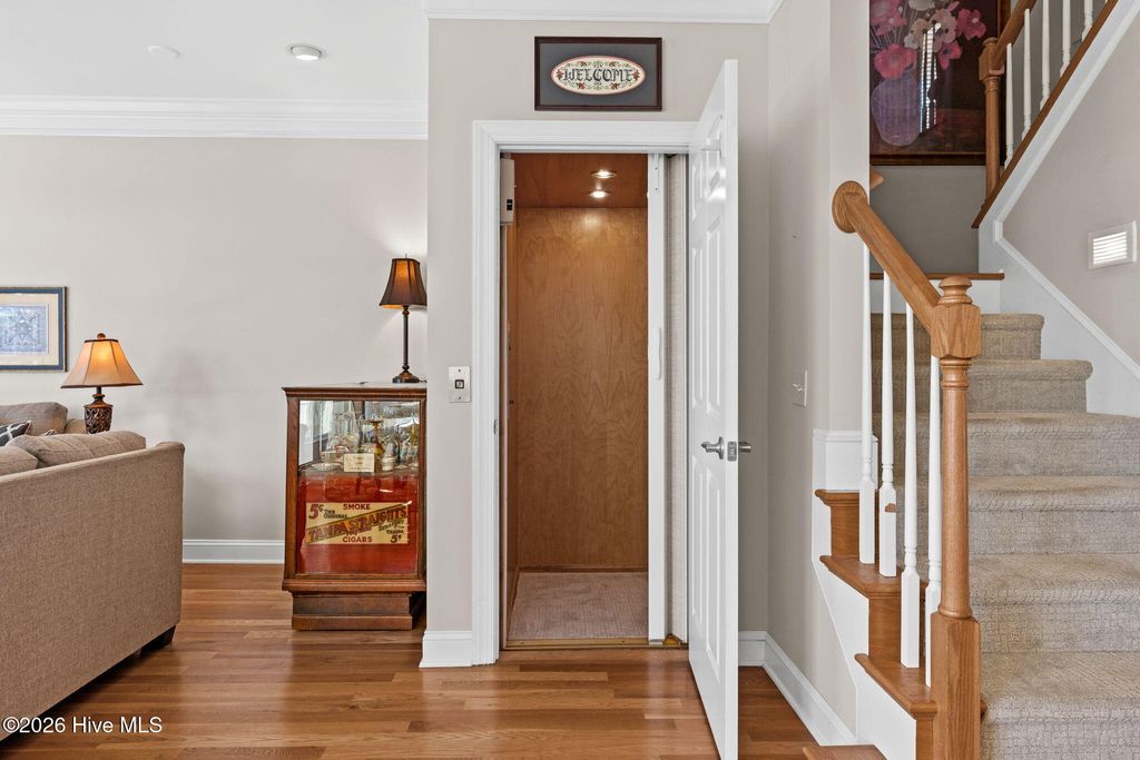 Get ready to fall in love with this luxurious townhome and the amazing lifestyle that awaits in Rivers Edge, along the Shallotte River! The award winning Arnold Palmer design golf course can be steps away from your doorstep and you can enjoy views of the #1 tee box with your morning coffee! Countless things make this one truly special! Your favorite just might be the remodeled space on the first level, use it for a MIL suite or a truly private guest space. It's complete with built in closet and storage space, a dining spot and studio style kitchen. Take the private, recently modernized elevator to the main living space on the second floor and enjoy the natural light that this southern facing home provides. Hardwood floors, high ceilings, and crown molding adorn the living room and the spacious kitchen has granite countertops and the dishwasher and refrigerator were replaced in 2021. The chef in the family will love the gas cooktop! Even better, the kitchen has Executive Kitchens Fine European Cabinetry and they were updated with fresh paint in 2023. All the living spaces were painted in 2023 as well making this home absolutely move in ready! The deck space on this floor could easily become your favorite as well! It's perfect for morning coffee or daytime reading! For convenience this floor has a bedroom with an ensuite bathroom. The third level has deck space from the primary bedroom, an amazing retreat to enjoy anytime of the day! The primary bath has a beautifully tiled large shower space and of course double sinks along the vanity. There is another bedroom for your guests on this floor as well, ensuring privacy and comfort. New roof in 2024, New exterior steps and exterior paint in 2025! Wait, there's more.. private beach club on Holden Beach as well as an owner's clubhouse complete with tennis / pickleball courts, fitness center, library and meeting space, and both an indoor and outdoor pool! Dining and shopping are close by and easy access to highway 17.