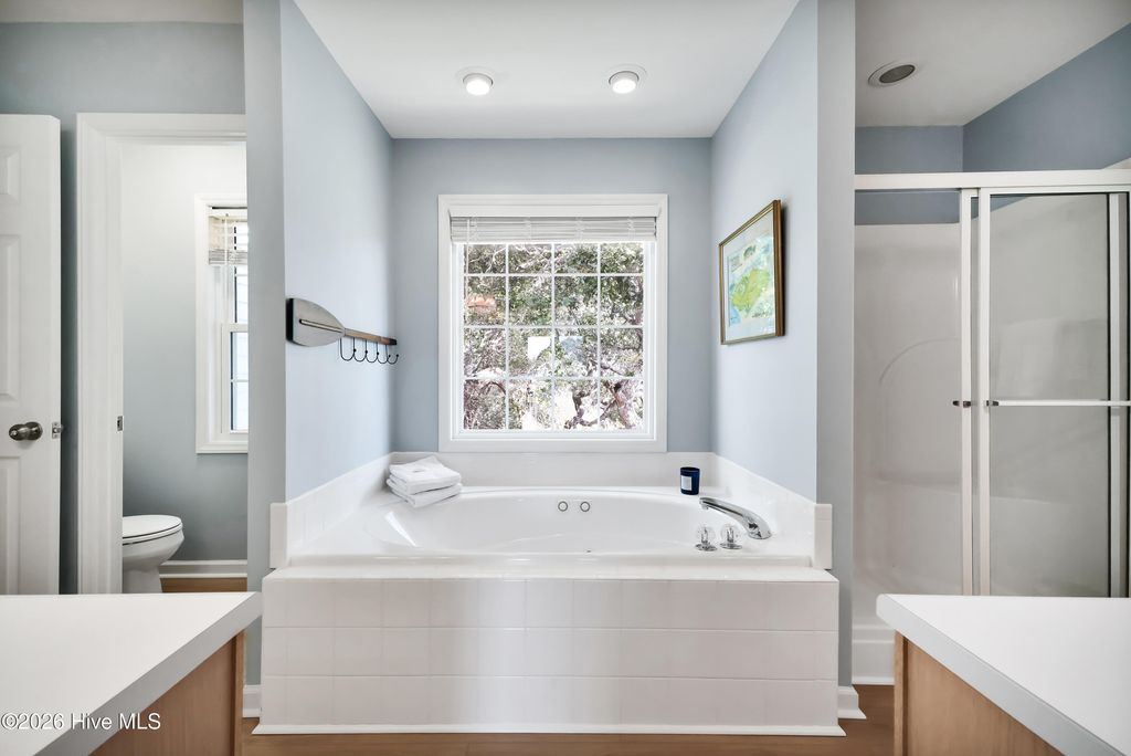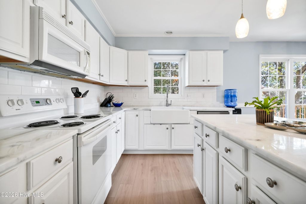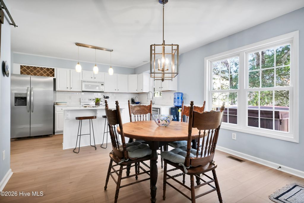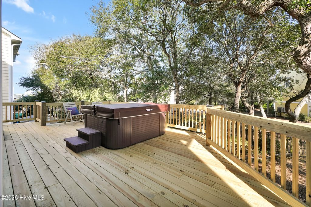 This is the one you've been waiting for! This classic beach cottage has a distinct coastal vibe and casual comfort you are sure to fall in love with. Only a short walk to the beach and in one of Surf City's few premiere water access communities, it's an even sweeter find! Shae's Landing affords you the luxury of preserving the value of your home and having pride in ownership while maintaining the integrity of a true seaside community. Only long-term rentals are allowed in this established interior neighborhood located on the desirable south side of Topsail Island. Home is a stand-out with good bones and recent transitional improvements: 2023 HVAC, new LVP flooring & hardwood stair treads, smooth ceilings, recessed lighting, new bathroom tile, spacious new deck & exterior stairs, fresh interior paint, modern ceiling fans; kitchen updates include farm sink, white Carrara marble countertops, subway tile, large island, brand new stainless refrigerator & stainless dishwasher. Other outstanding features include a large master suite w/ private porch, formal dining + breakfast room, ample closets, pantry & storage - so many closets, a cozy fireplace, relaxing hot tub, outdoor shower, fenced-in garden, patio, irrigation, & more! Fourth bedroom is a bonus with private ground floor entry -ideal for guests, in-laws or kids; even use it for an office or studio. Never rented & well-maintained with recent tastefully stylish renovations, you'll not want to miss this one! Furnished & turn-key w/ acceptable offer, make it YOUR beach retreat or permanent home before someone else does. Have it ALL - a stunning home, private beach path to the sparkling Atlantic nearby & access to the ICW to fully enjoy life and all that Topsail Island has to offer!