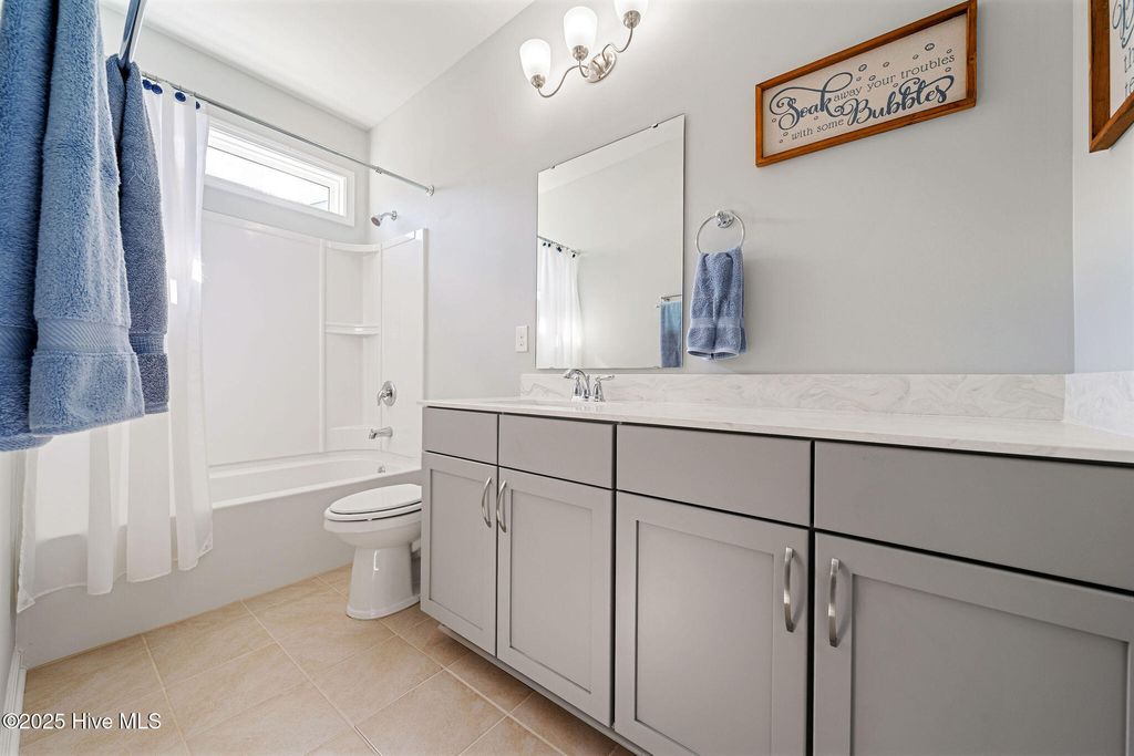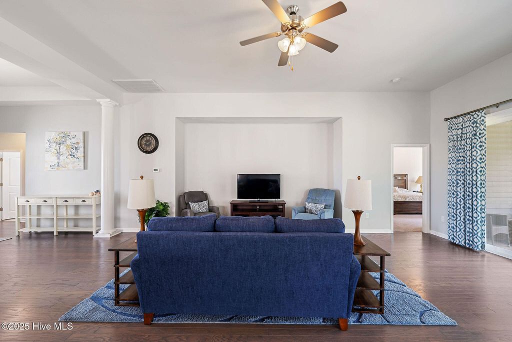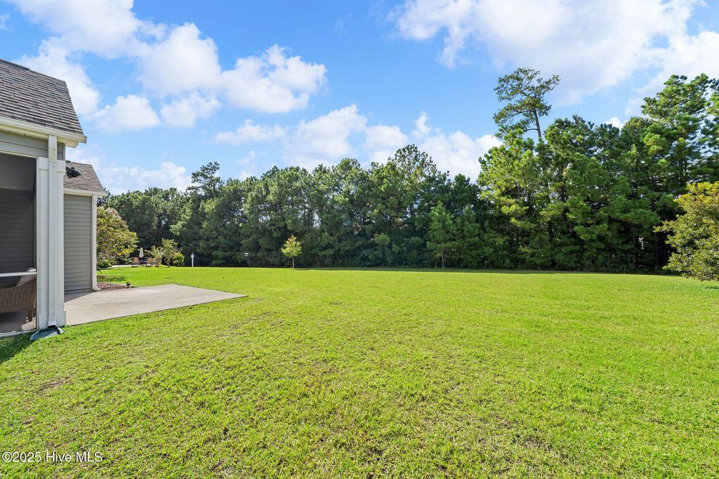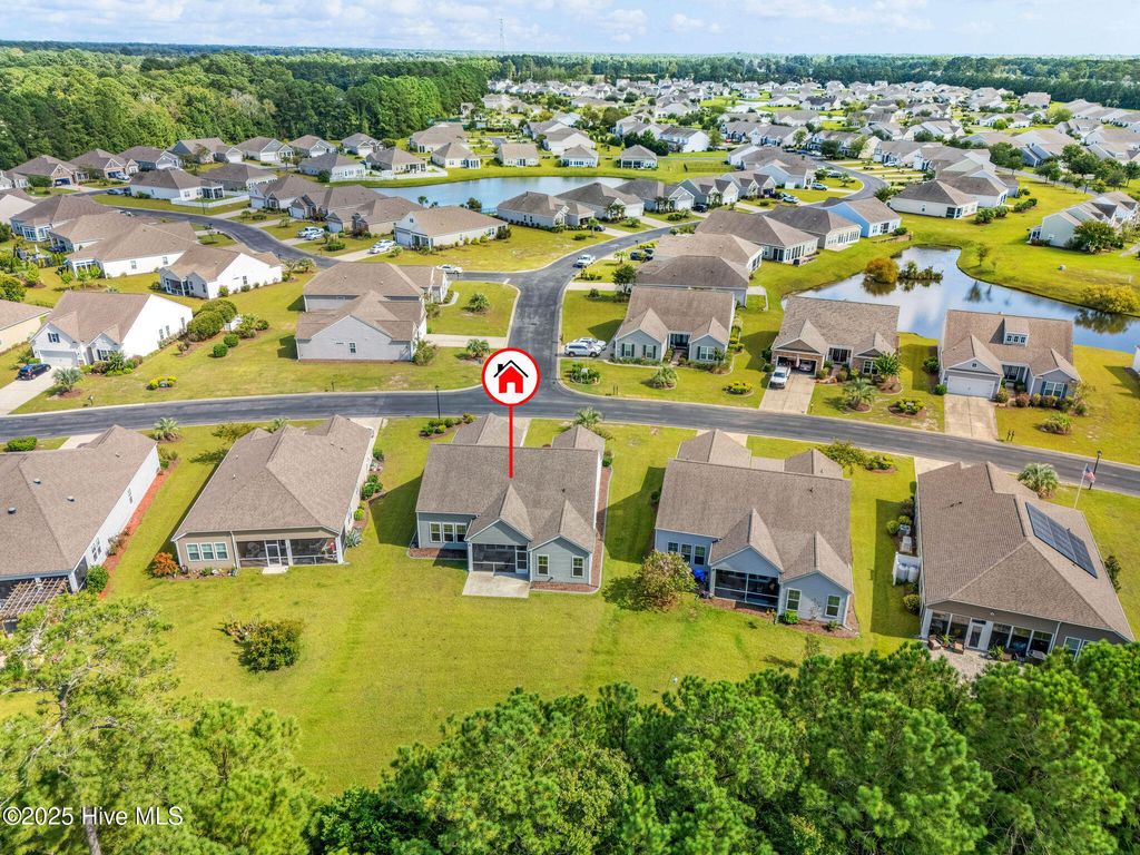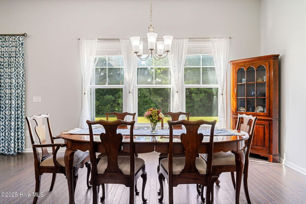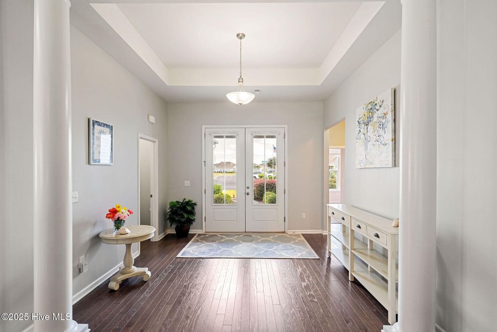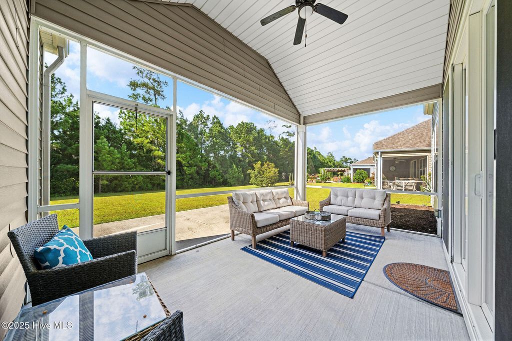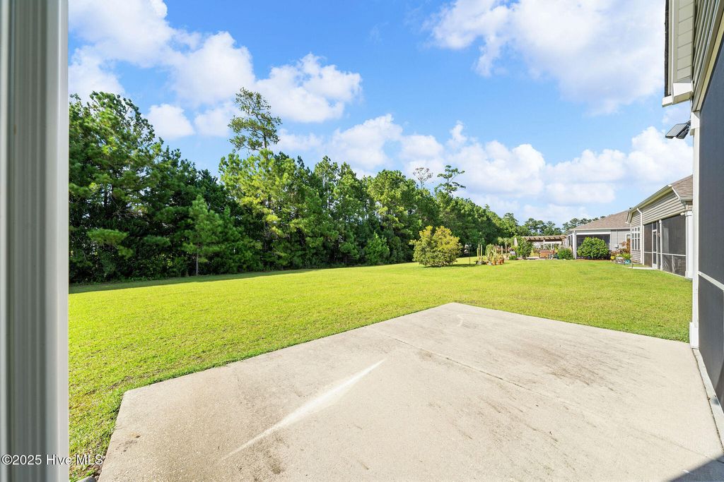 Dreaming of comfort, convenience and the coast in Carolina Shores? With thoughtful details inside and out, this 3 bedroom 2.5 bath home offers modern convenience, timeless finishes, and a layout designed for both everyday living and entertaining. With 2225 sqft this home has all the upgrades in a single story layout as well as a year home warranty for additional peace of mind. At first sight you'll be greeted by a stone accented 2 car garage, concrete stamped garden beds highlighting palms and shrubs. Step inside the double front entry doors and enter the trey ceiling foyer with soaring 11-foot ceilings, wood flooring, and classic columns that set the tone for the rest of this stylish home. The open floorpan gives way to a gourmet kitchen featuring granite countertops and kitchen island, grey cabinetry, a white subway tile backsplash, and modern pendant lighting. Stainless steel Frigidaire appliances include an electric stove, microwave, dishwasher, disposal, and refrigerator, plus a pantry for extra storage. A cozy eat-in kitchen area flows seamlessly into the dining room area and living space, with access to the screened porch and extended patio via double sliding glass doors, perfect for entertaining. The luxurious owner's suite boasts a trey ceiling, 9-foot ceilings rising to 10 feet in the tray, and a spa-like bath with dual vanities, double-door entry, toilet room, step-in shower with transom window, and a linen closet. The expansive walk-in closet completes this private retreat. One additional bedroom offers a vaulted ceiling and tons of natural light as well as while the other can be a perfect guest room, sitting area, office or den. The full hall bath features a transom window, tile flooring, and its own linen closet. The laundry room is tiled with added shelving and comes equipped with a Whirlpool washer and dryer. There is also a a powder room with a pedestal sink which is ideal for guests. The built-in mudroom is the perfect drop zone for coats and shoes and pull-down stairs in the 2 car garage provides access to additional floored storage adding convenience and organization. Throughout the home, enjoy window blinds, curtains & ceiling fans for added comfort and furnishings also negotiable if desired! Calabash Lakes features resort-like amenities including pool, clubhouse, tennis and pickleball courts and ground maintenance! The home offers the perfect location in a growing area close to grocery, shops and restaurants as well as being minutes from the South Carolina border and only a 10-minute drive to Sunset Beach!