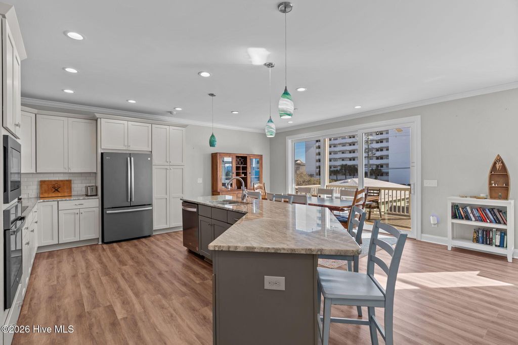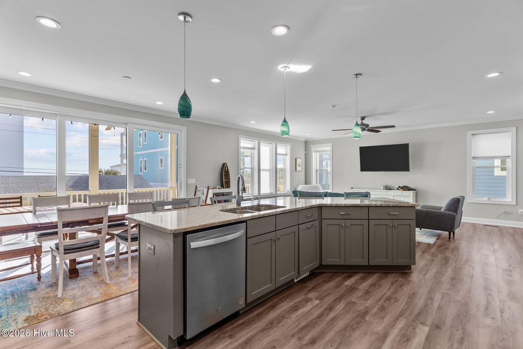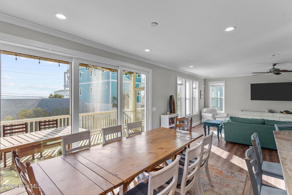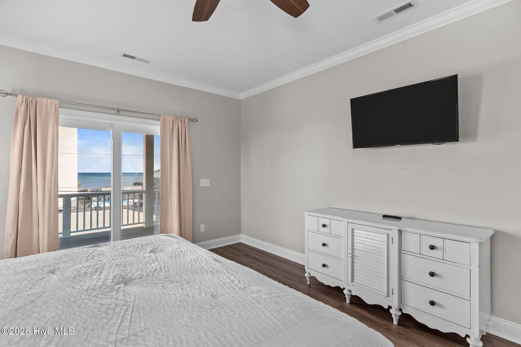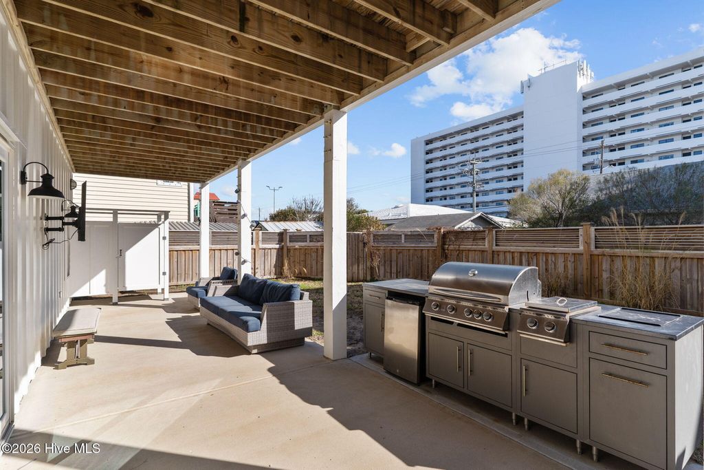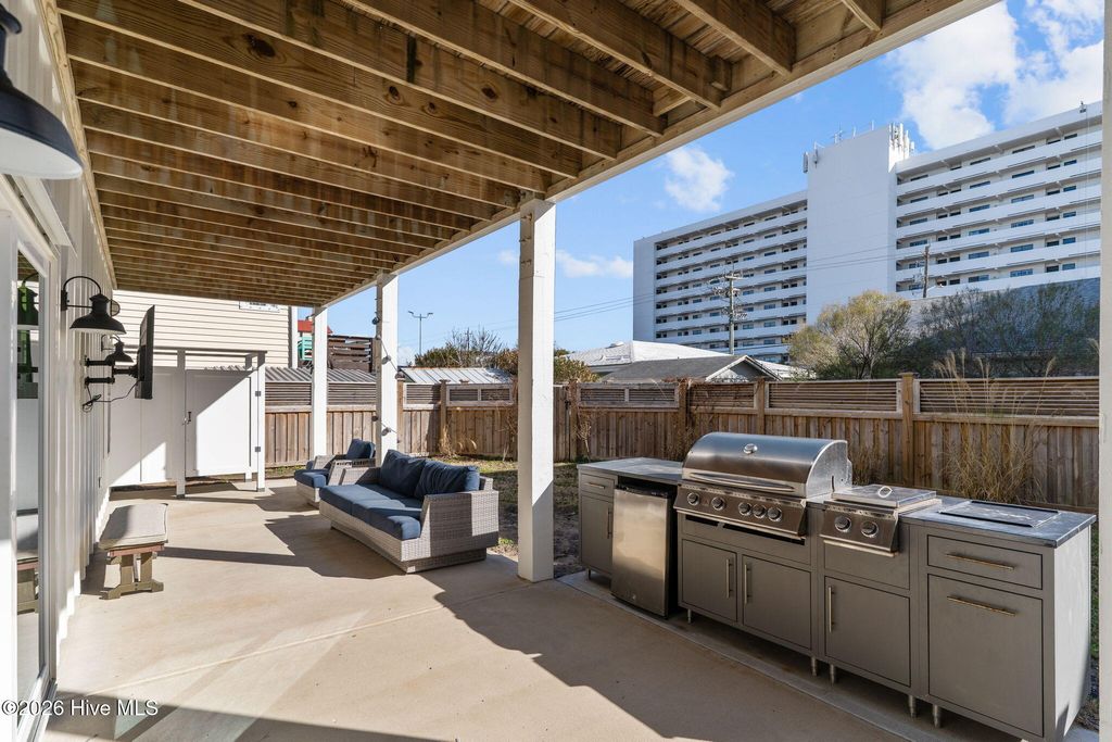 This Richard Wallace Builder home is steps away from the soft sands of Carolina Beach and feels like brand-new construction. With 4 bedrooms, each featuring its own private en suite, every family member or guest enjoys comfort and privacy. The main living areas are bright and airy, featuring 9-foot ceilings, crown molding, and an open-concept design. The chef's kitchen is a showstopper with luxurious stainless steel appliances, a large curved island with seating, and plenty of storage, perfect for entertaining friends and family. Step outside to two expansive decks with ocean views, including a screened porch off the kitchen for shaded outdoor meals. The fully fenced backyard offers privacy and security, with a new outdoor shower, outdoor kitchen complete with TV, and space for a future pool or garden oasis. This home is loaded with modern upgrades: a new GenX generator, mini-split HVAC systems, garage closets for added storage, and a Holmes security system for peace of mind. The master suite is a private retreat with a spacious deck overlooking the ocean, walk-in closet, dual vanities, and a walk-in shower. Built to Gold Fortified hurricane protection standards, this home combines luxury, safety, and coastal style for an unmatched beach lifestyle. Whether you're enjoying sunset views from the deck, cooking in the outdoor kitchen, or relaxing in your private master suite, this home is ready to deliver the ultimate Carolina Beach experience.