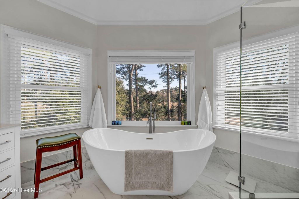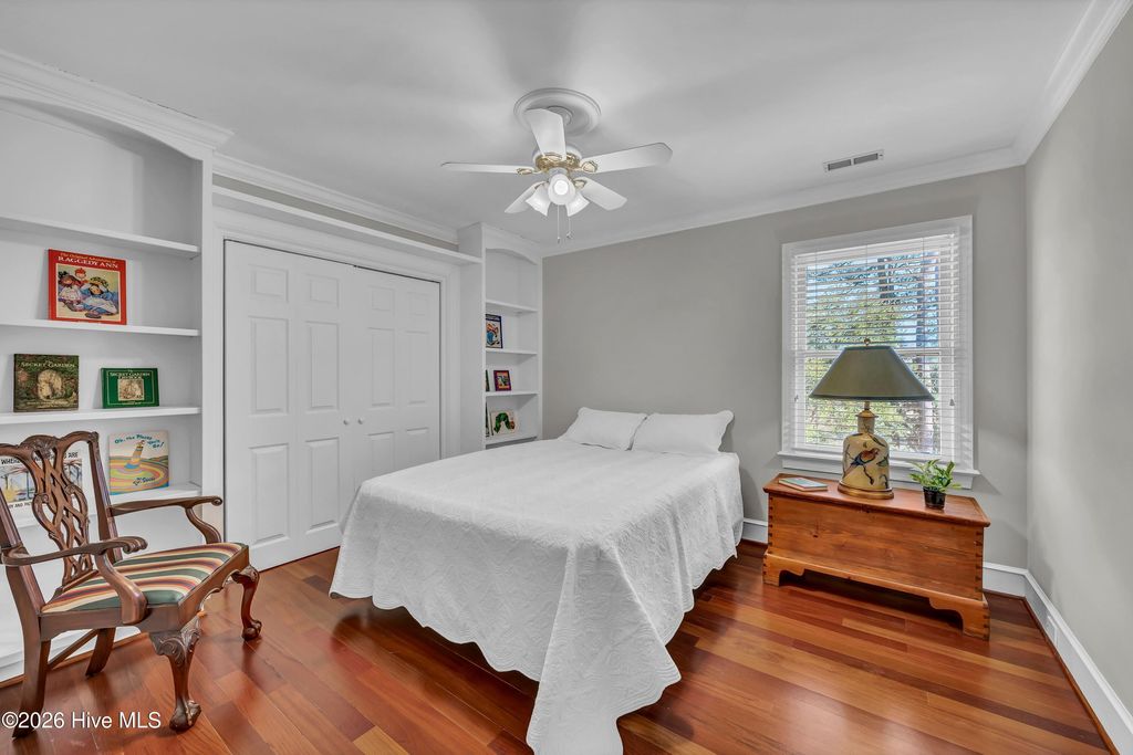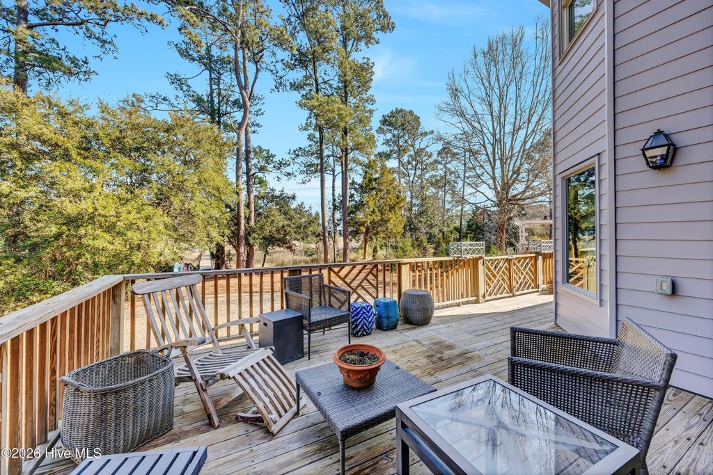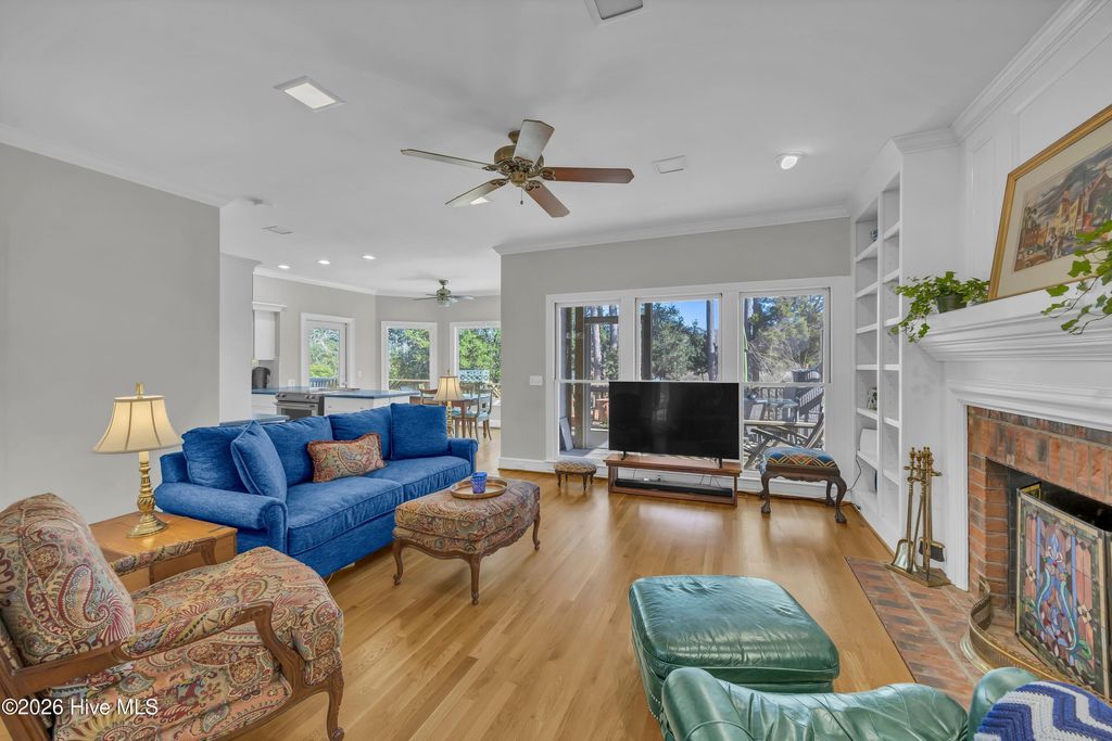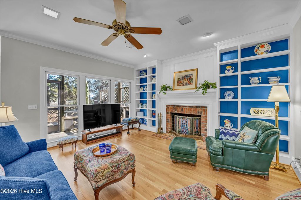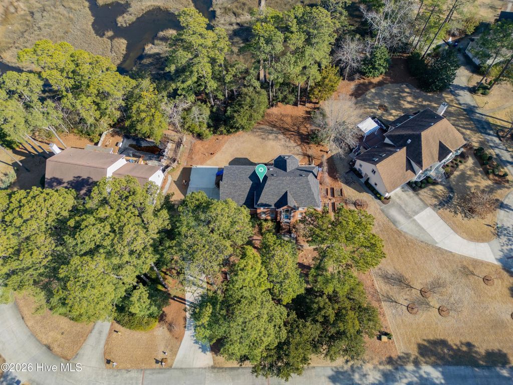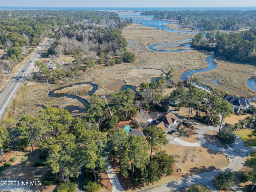 Nestled on over 1 acre in the quiet Sandfiddler Pointe neighborhood off Greenville Loop Road, this beautifully maintained brick residence captures peaceful marsh views of Hewletts Creek and offers direct water access. A grand entryway sets the tone upon entering the home, with a formal dining room to one side and a private den to the other, creating a balanced and functional layout. Beyond the foyer, the spacious family room features a wood burning fireplace with custom built-ins and opens seamlessly to the kitchen. Thoughtfully designed, the kitchen provides generous workspace, a large walk-in pantry, and an effortless connection to a light filled breakfast nook. An expansive back deck and screened porch overlook the private backyard and creek beyond, providing multiple areas for entertaining or relaxing. A laundry room and powder room complete the main level. Upstairs, the primary suite includes a connected sitting area or office and a private balcony overlooking the water. The fully renovated en suite bath features a tiled shower, dual vanity, and freestanding soaking tub. Two spacious guest bedrooms, a full bath, cedar hall closet, and a large bonus room offer flexibility for guests, recreation, or additional living space. The private pier extends from the property to the creek, creating the perfect setting for kayaking, paddleboarding, or simply enjoying the waterfront lifestyle. Additional highlights include a two car garage with a dedicated workshop area, a new roof in 2023, raised garden beds, mature native landscaping, a garden fountain, and expansive yard space that enhances the home's privacy and coastal setting.